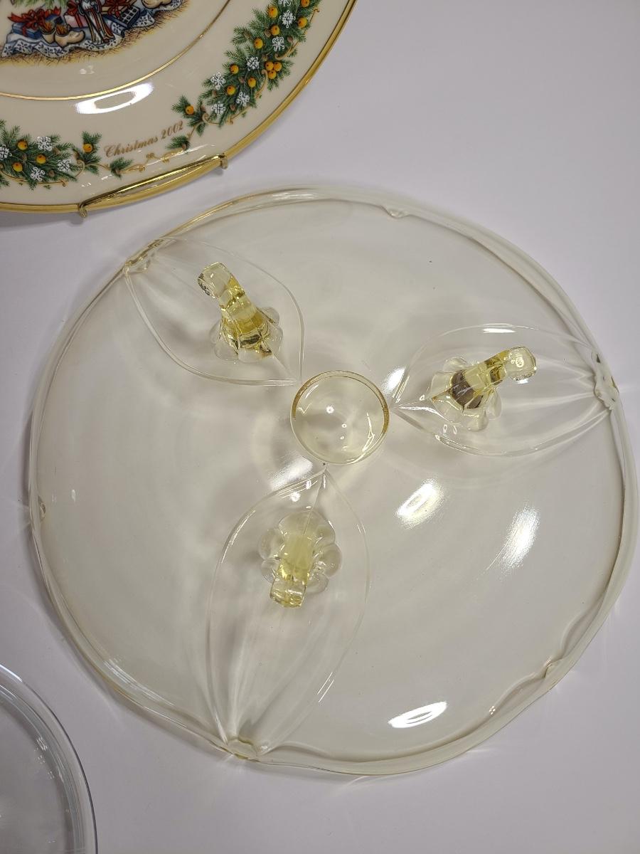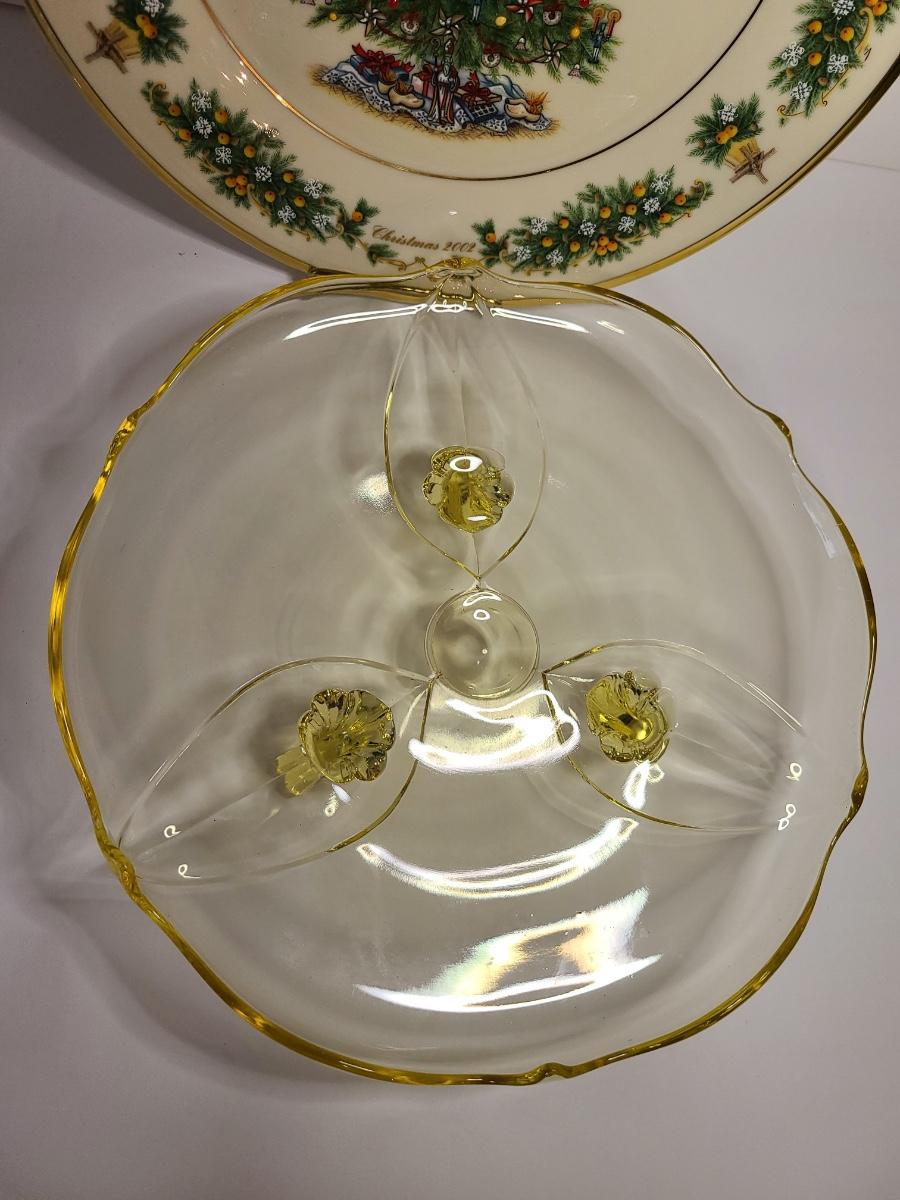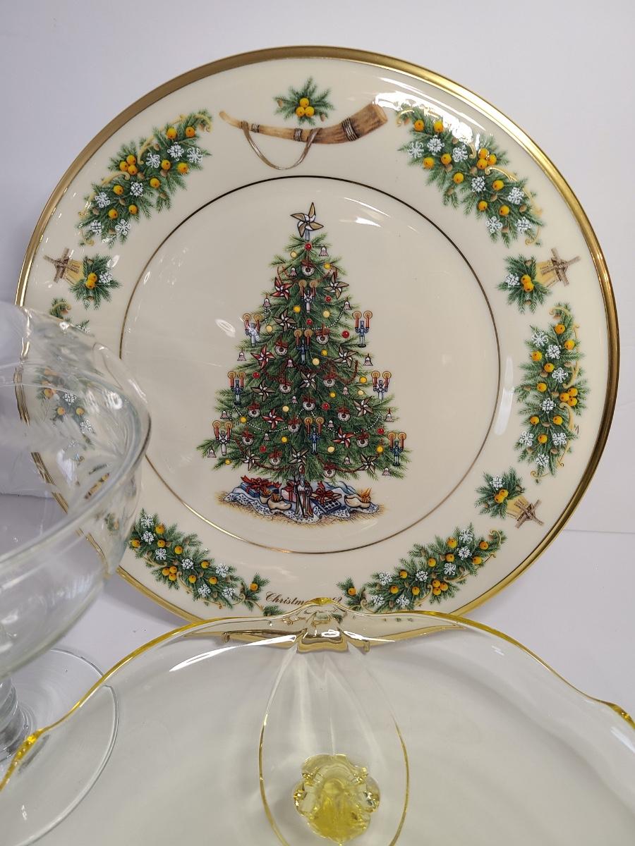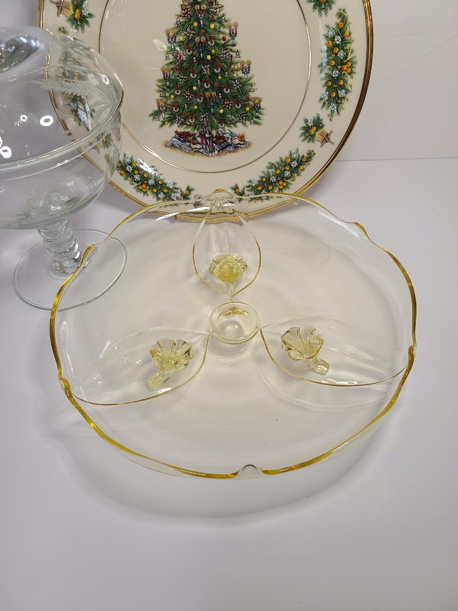 Lot 131: Lenox Holiday Plate, Yellow Depression Glass Footed Cake Plate & Elegant Lidded Candy