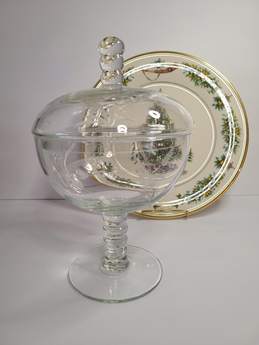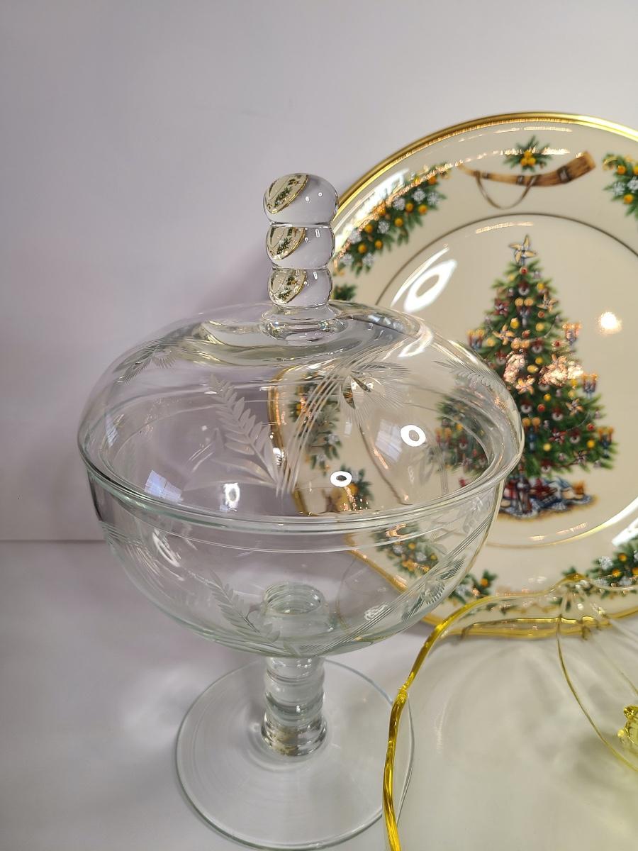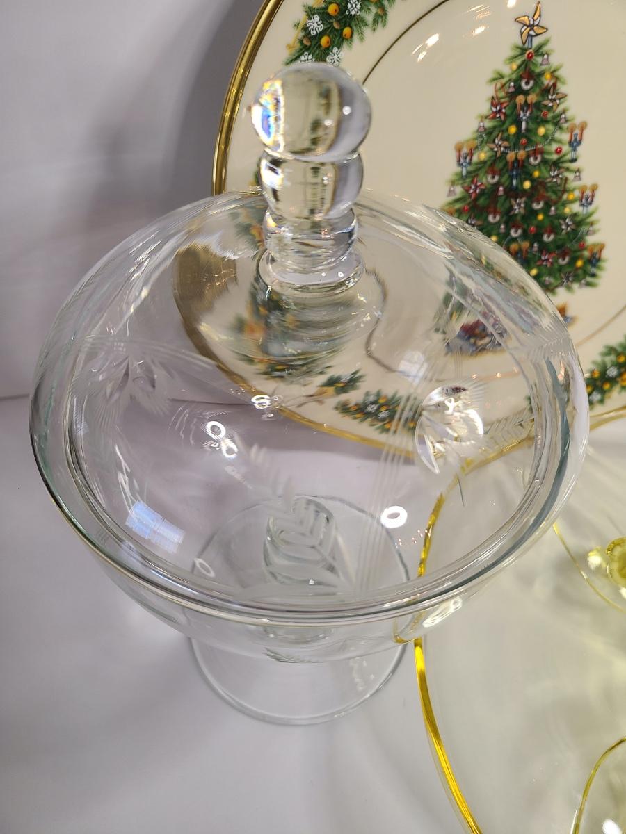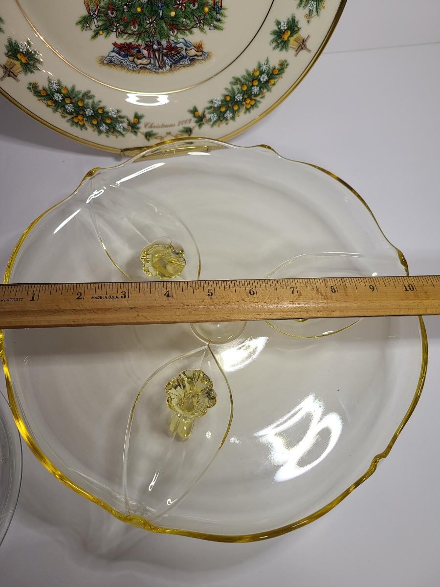 Lot 131: Lenox Holiday Plate, Yellow Depression Glass Footed Cake Plate & Elegant Lidded Candy