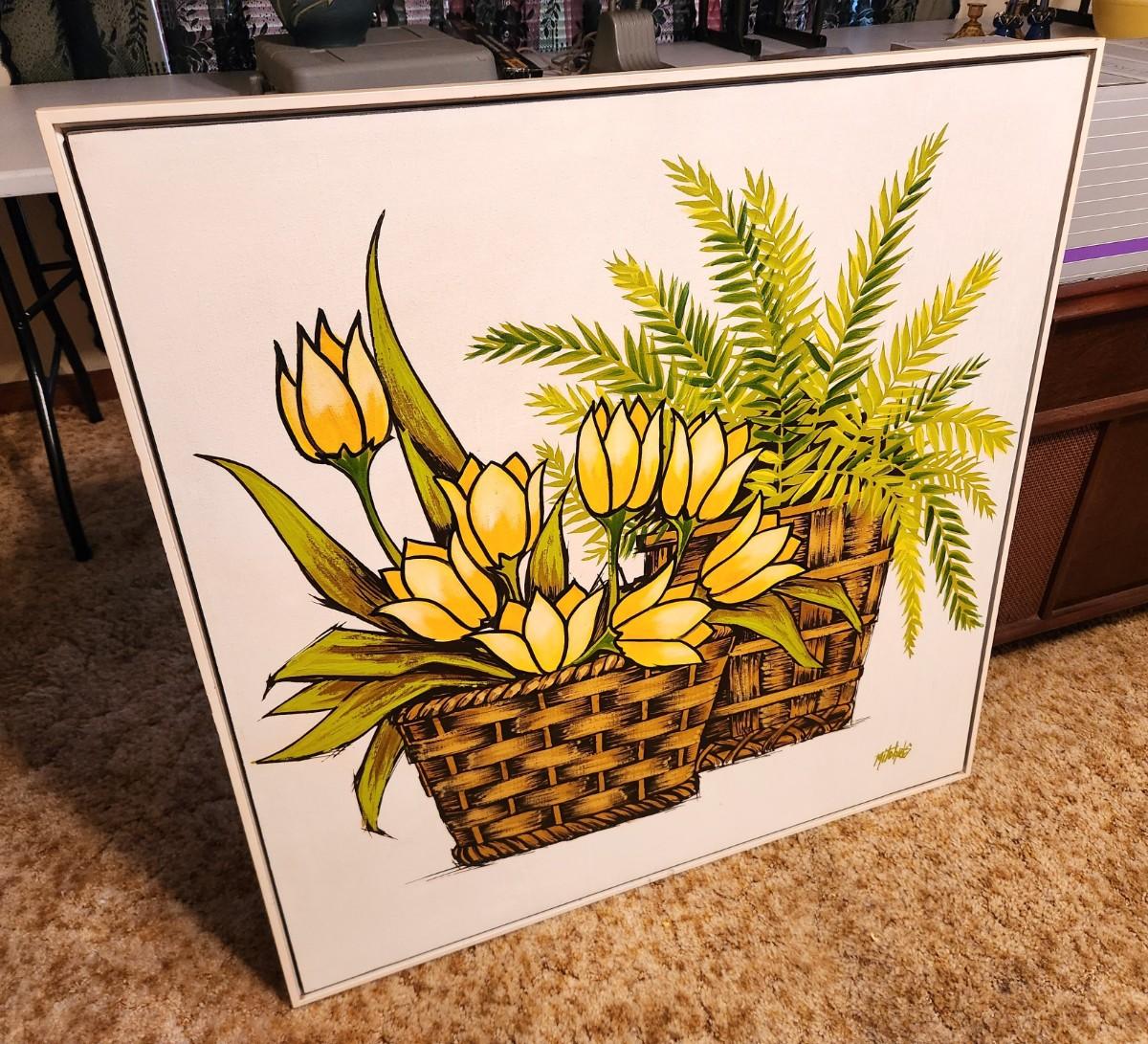 Acrylic on canvas - 1970's - large, 37" x 37" - signed Mitchells - Expressionistic post-modern painting of a basket with tulips. Good condition.