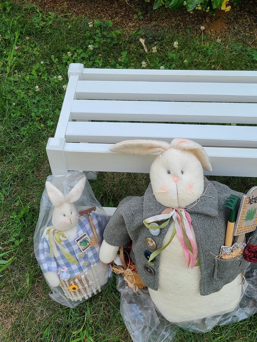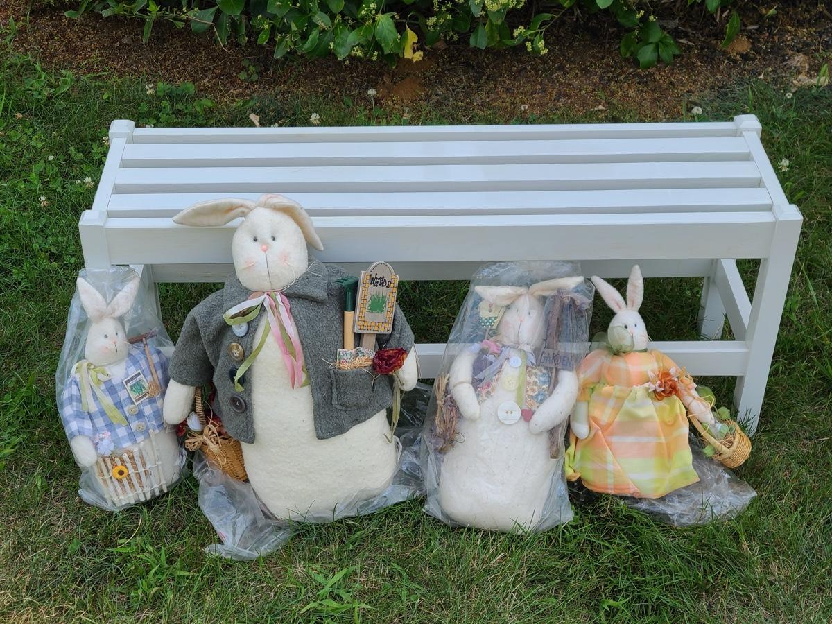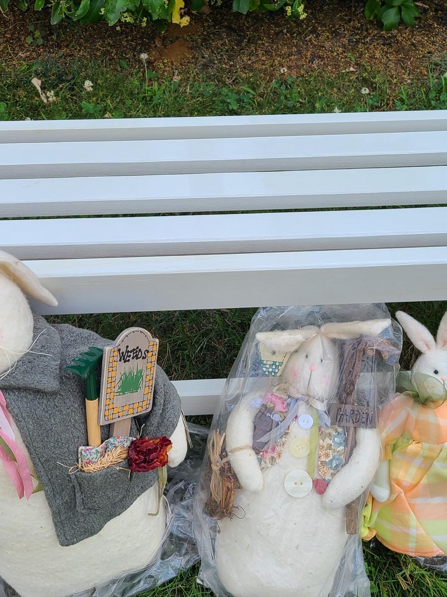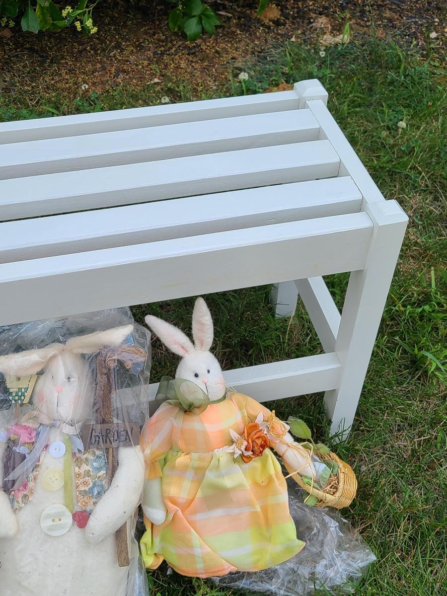 Lot 131: Petite White Wood Bench and New Garden Rabbits