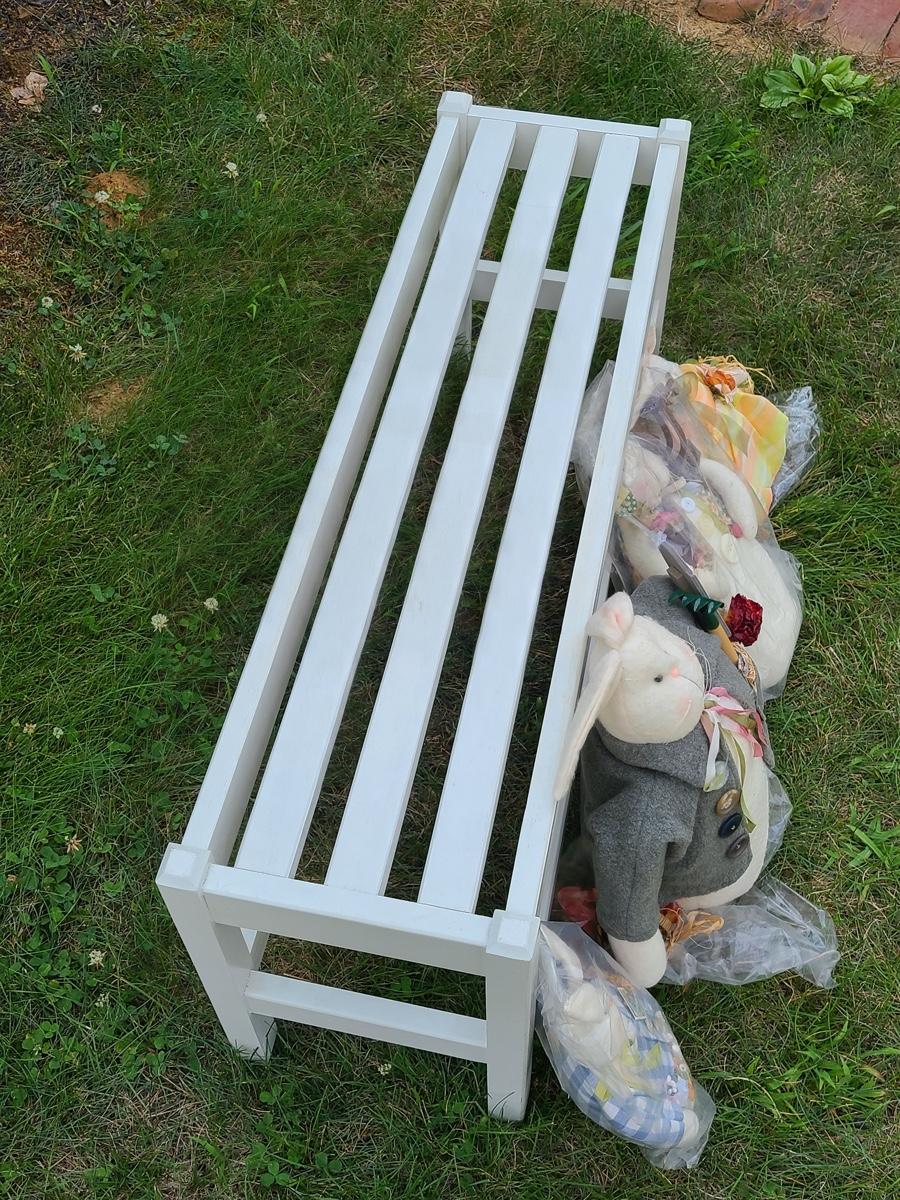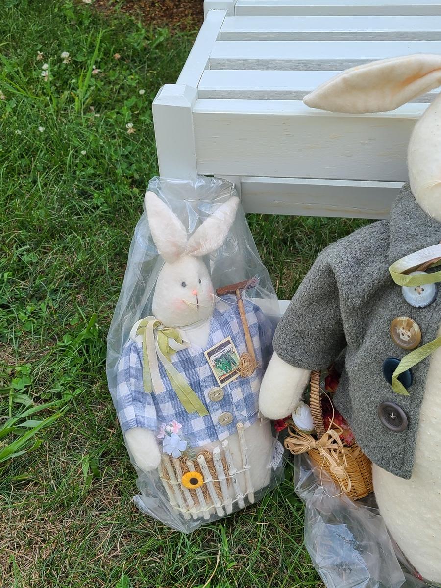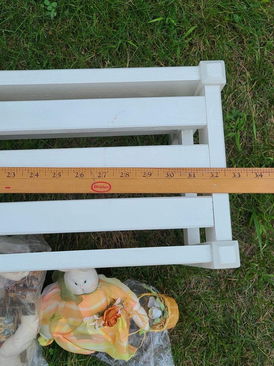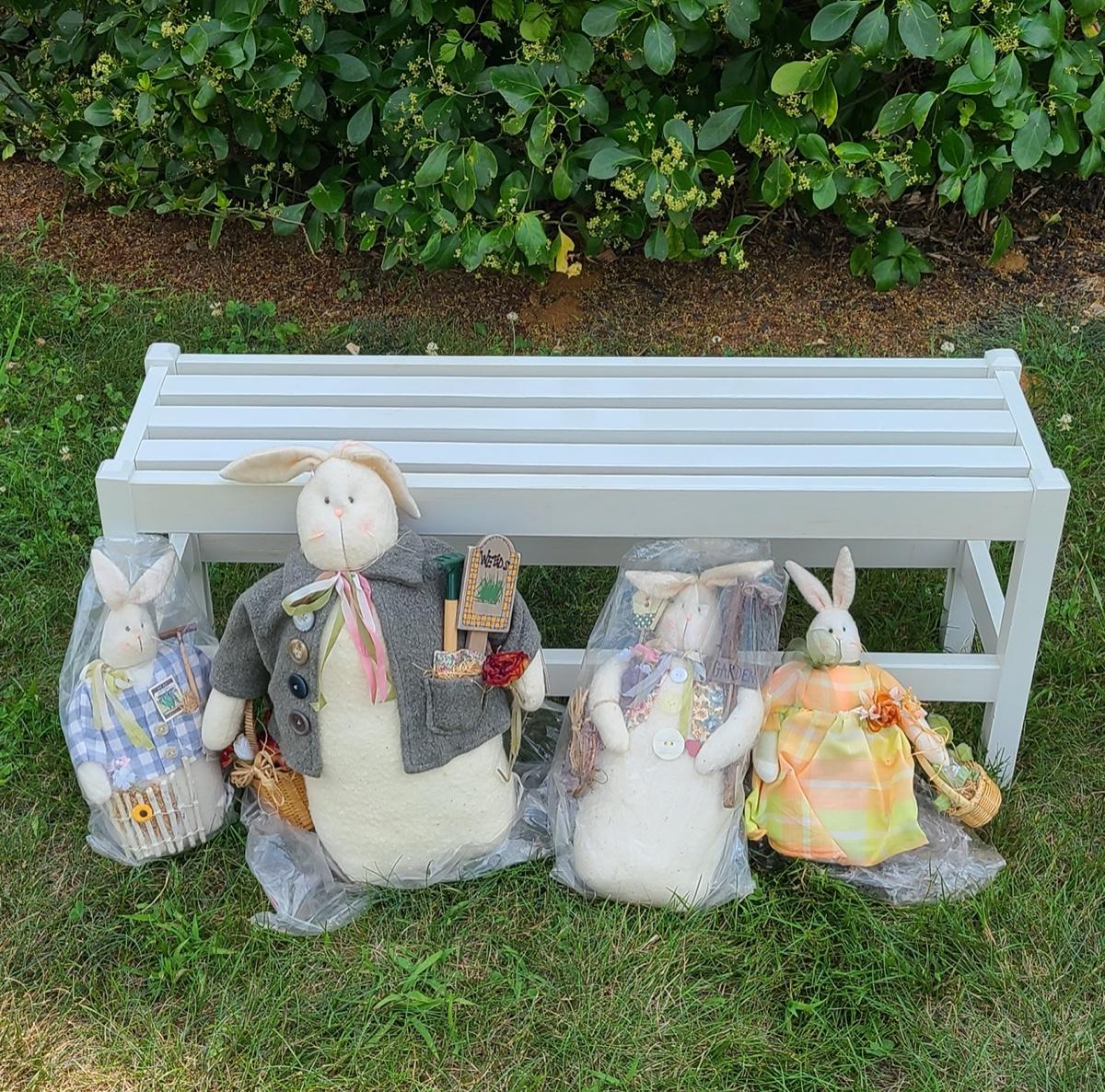 Lot 131: Petite White Wood Bench and New Garden Rabbits