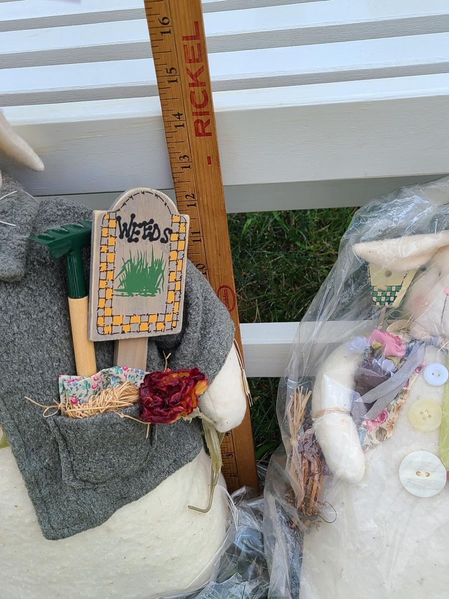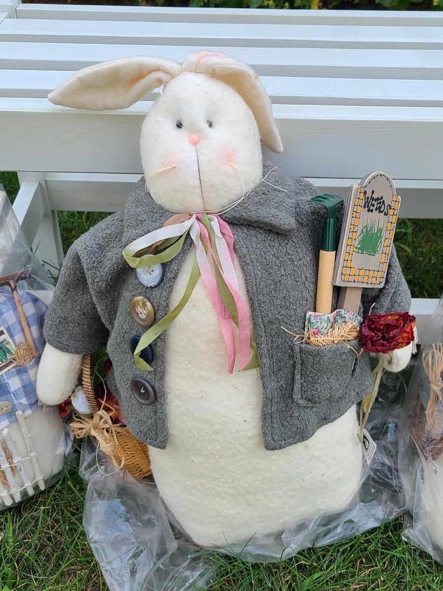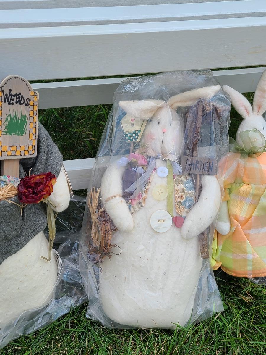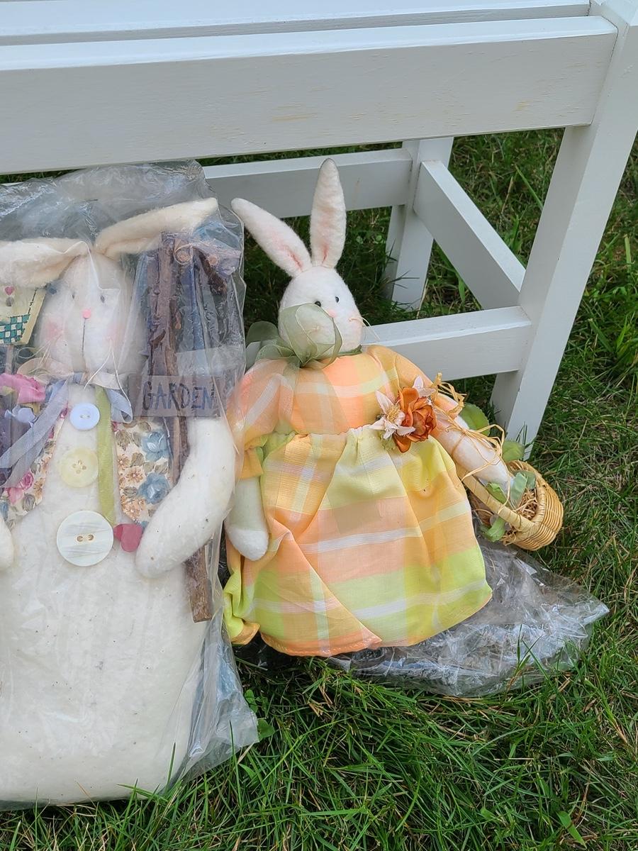 Lot 131: Petite White Wood Bench and New Garden Rabbits