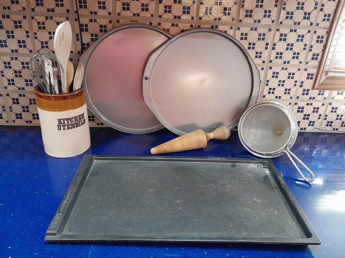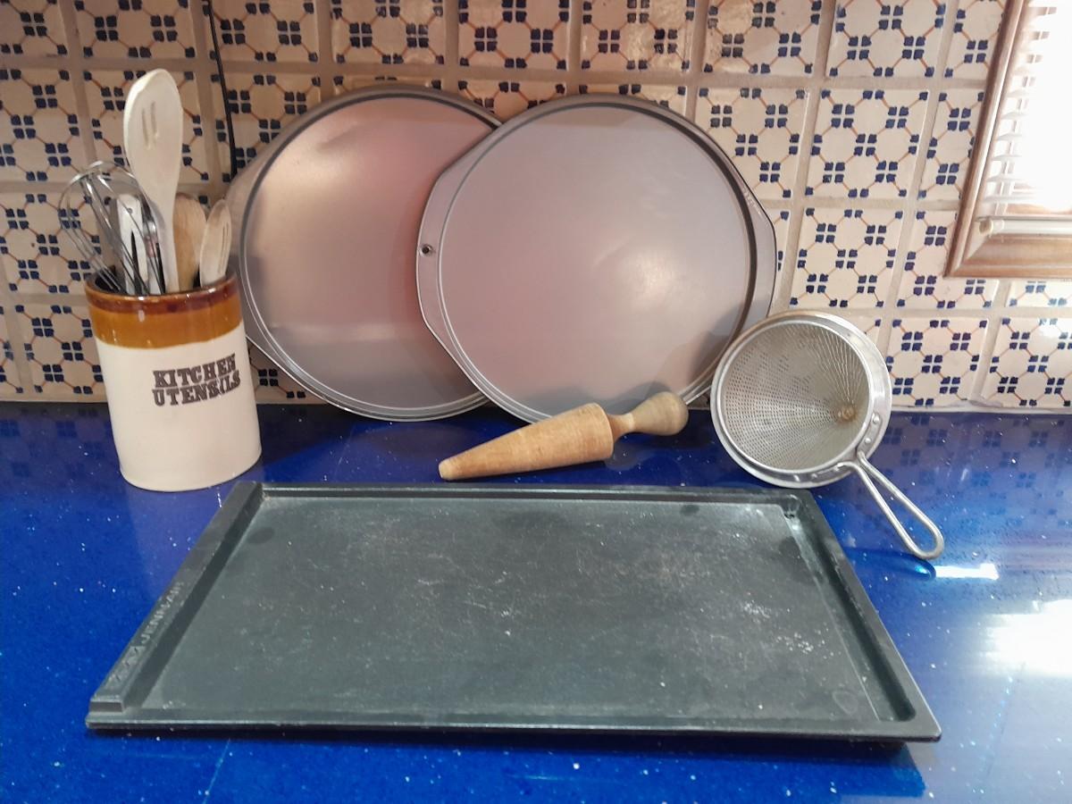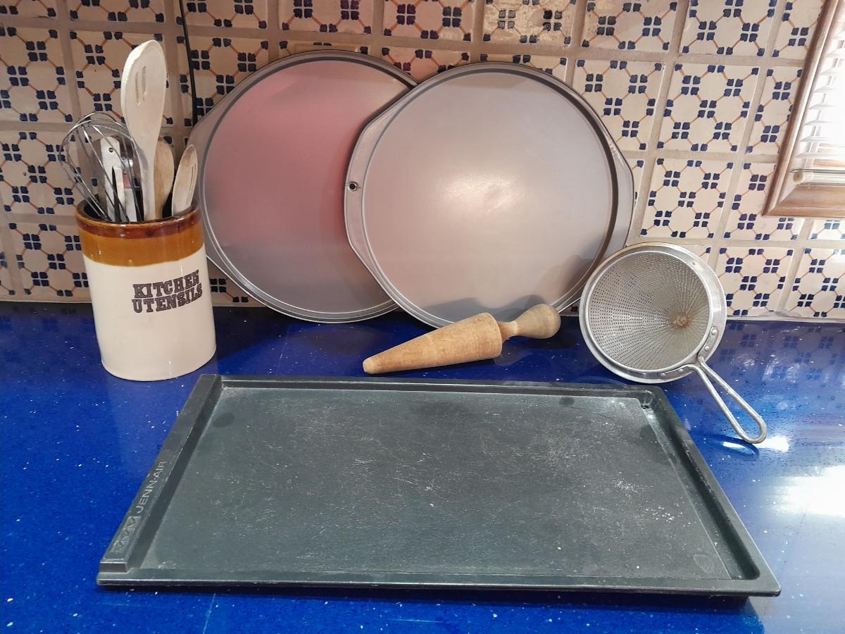 PIZZA PANS, COOKIE SHEET, STRAINER WITH WOODEN DOWEL AND STAND, AND KITCHEN UTENSIL CROCK WITH UTENSILS.
