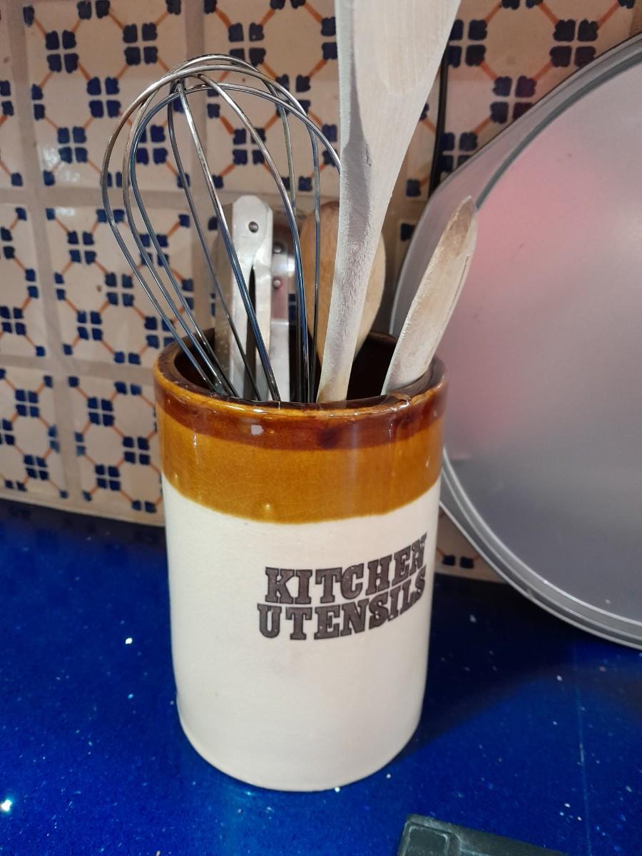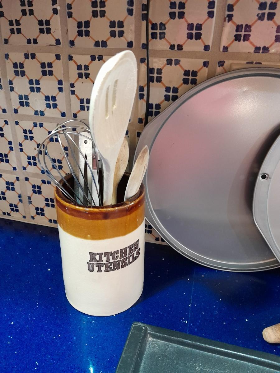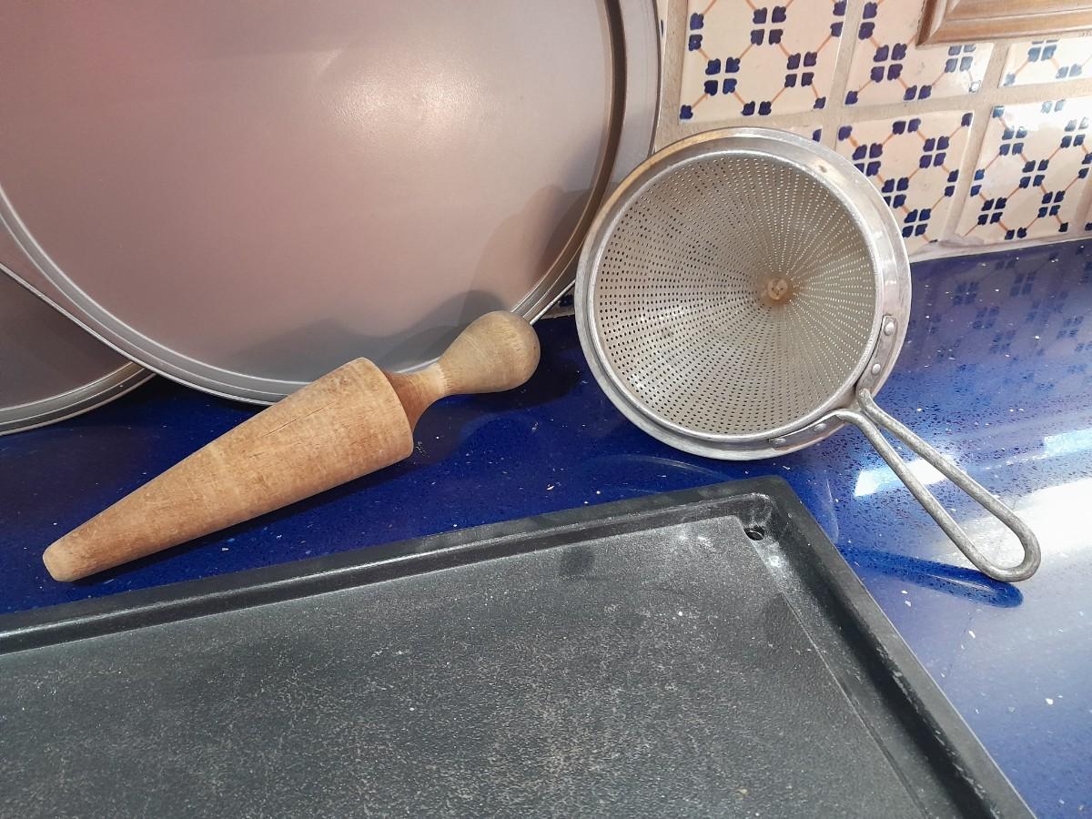 PIZZA PANS, COOKIE SHEET, STRAINER WITH WOODEN DOWEL AND STAND, AND KITCHEN UTENSIL CROCK WITH UTENSILS.