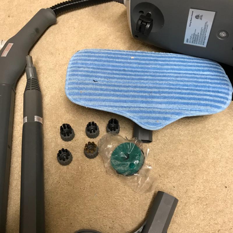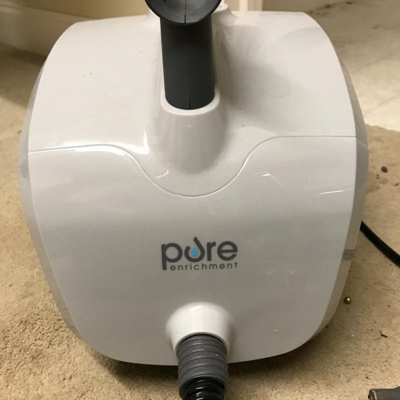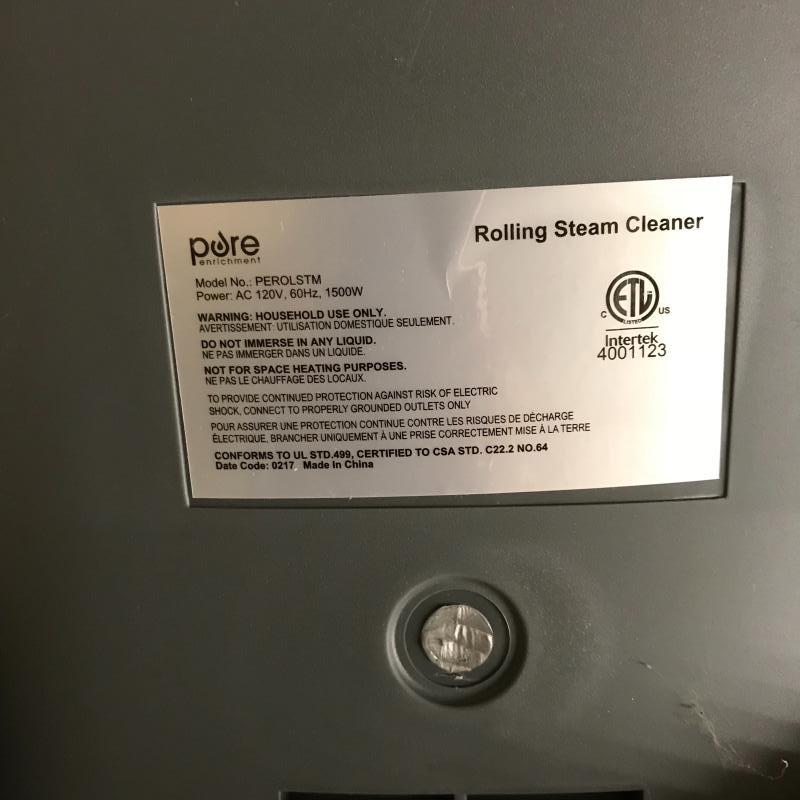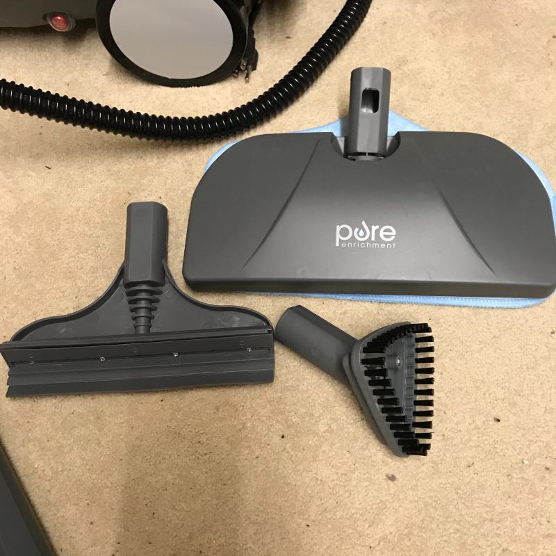 Pure Enrichment rolling steam cleaner with multiple attachments and a clean microfiber pad. Some attachments appear to be unused. Machine turns on when plugged in. No shipping.