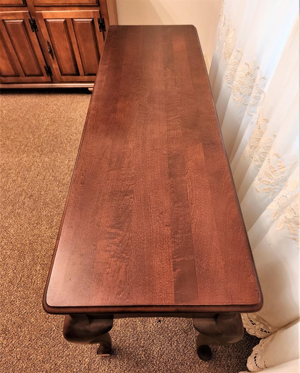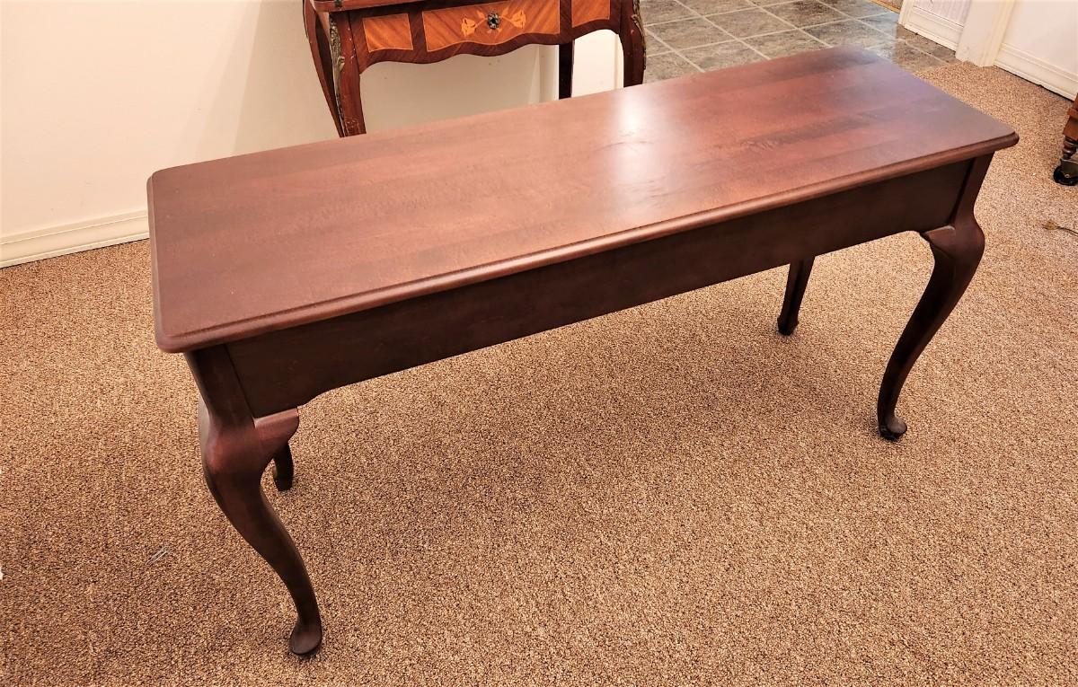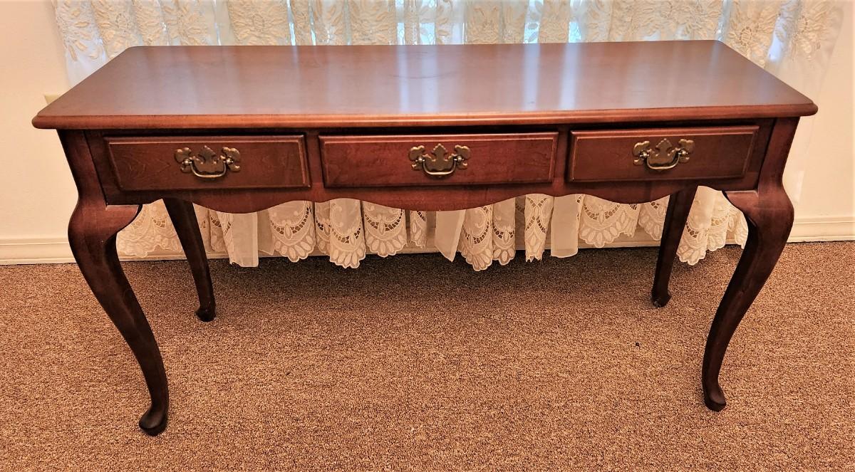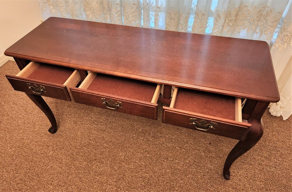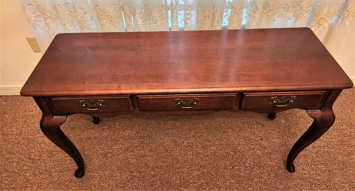 Classic contemporary Queen Anne Style sofa or side table, 3 drawers - note damage to 1 foot - when facing table you don't see it. 16" deep, 27" tall, 4 feel long.