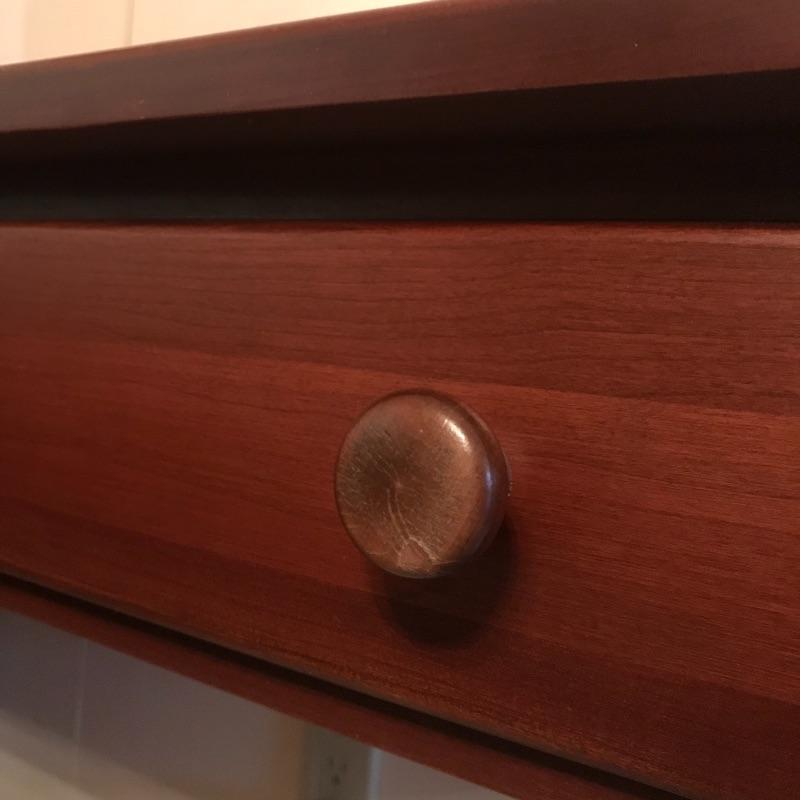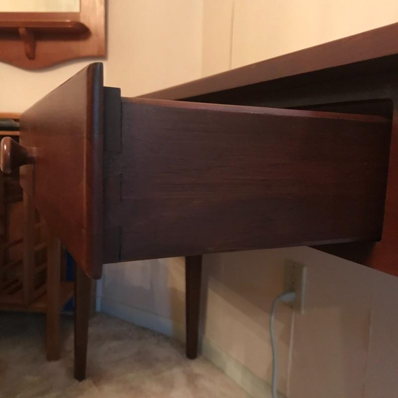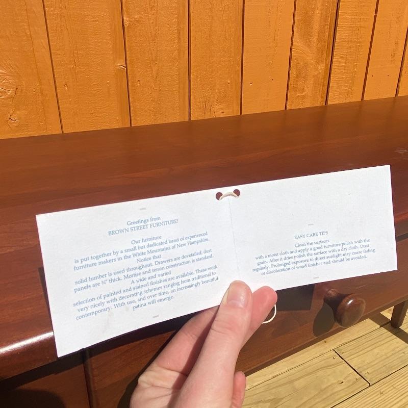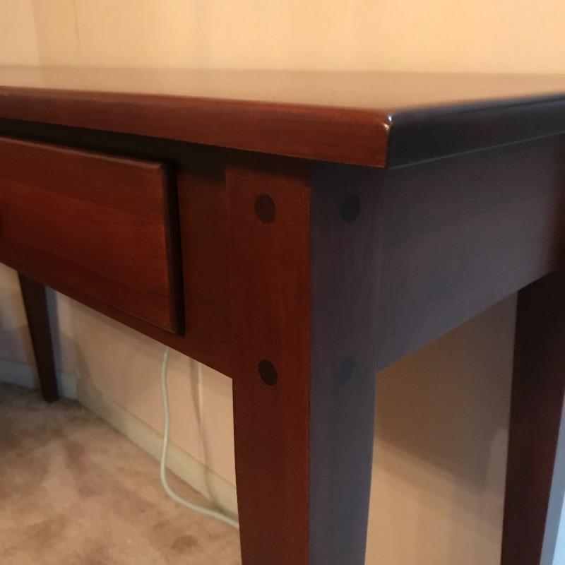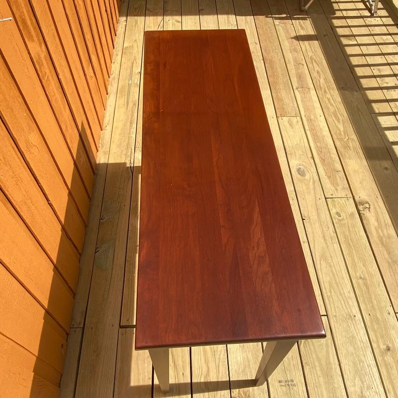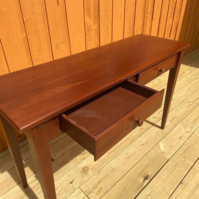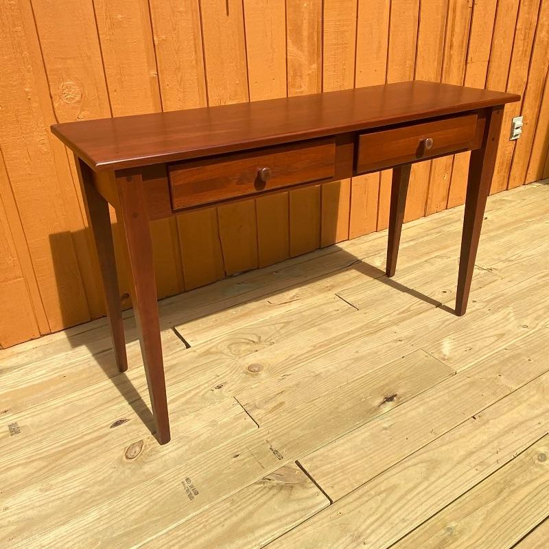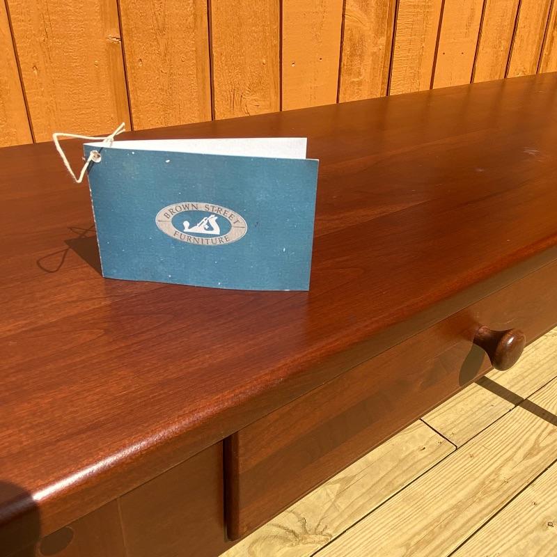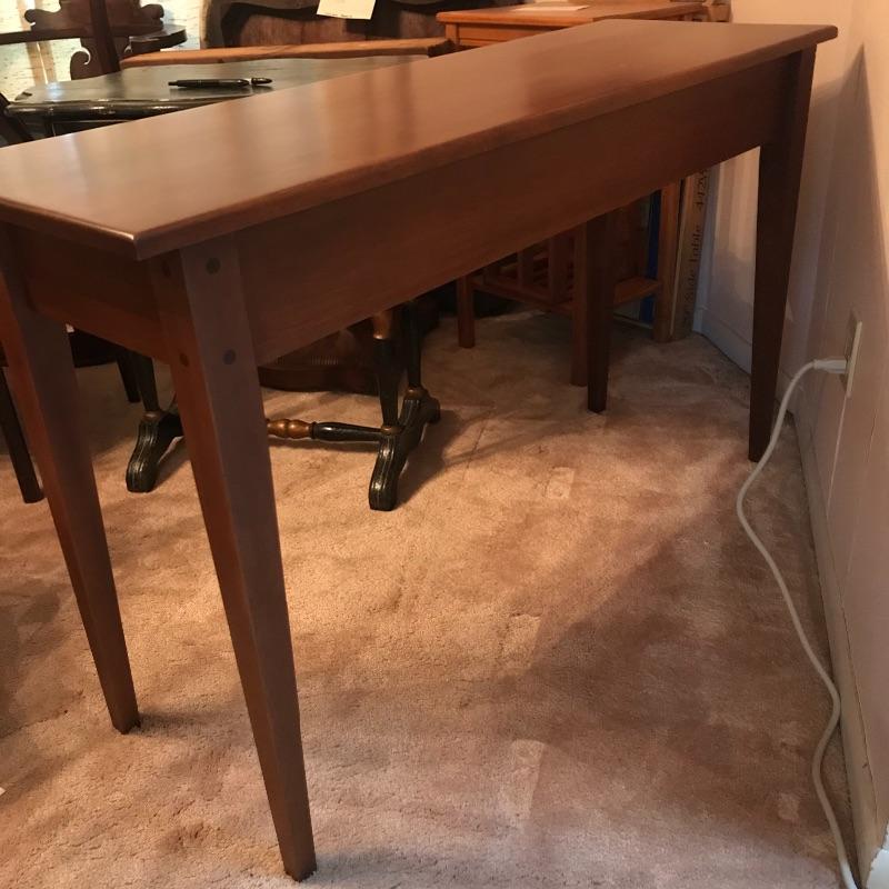 This sleek sofa table adds functuality and design to your living room. The dark wood with red undertones will pair nicely with many designs. Literature found in piece states Brown Street Furniture, but maker’s mark on table itself was not found. Good condition, measurments are 48” x 16” x 29”. Local pick up only. .