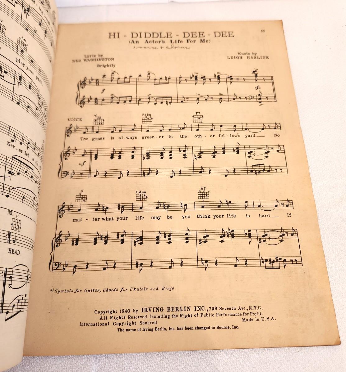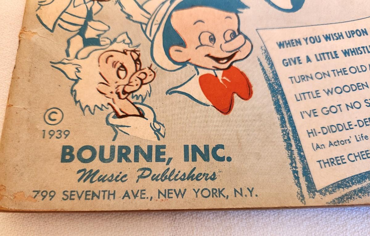 Book contains all the sheet music (piano) for the songs in the 1939 Disney film Pinocchio - 10 songs. This book was published in 1945. Good condition.