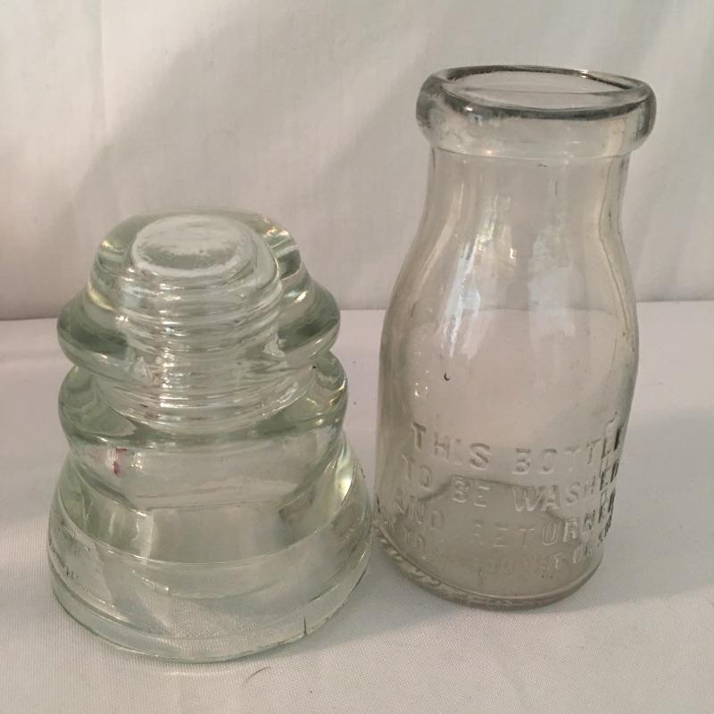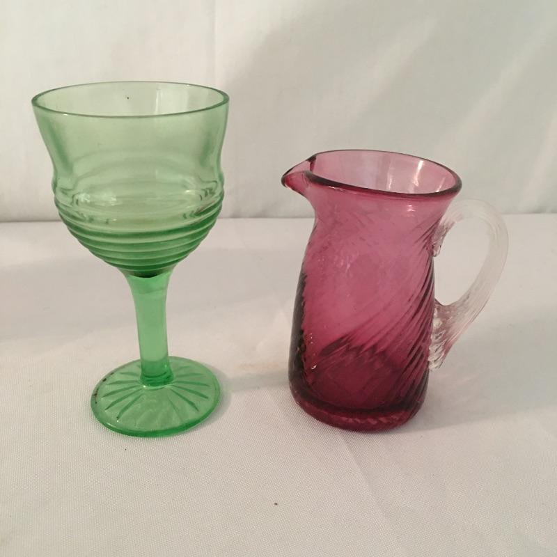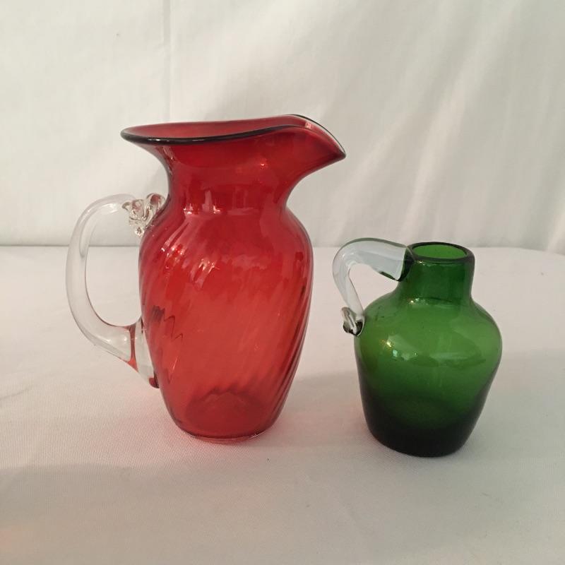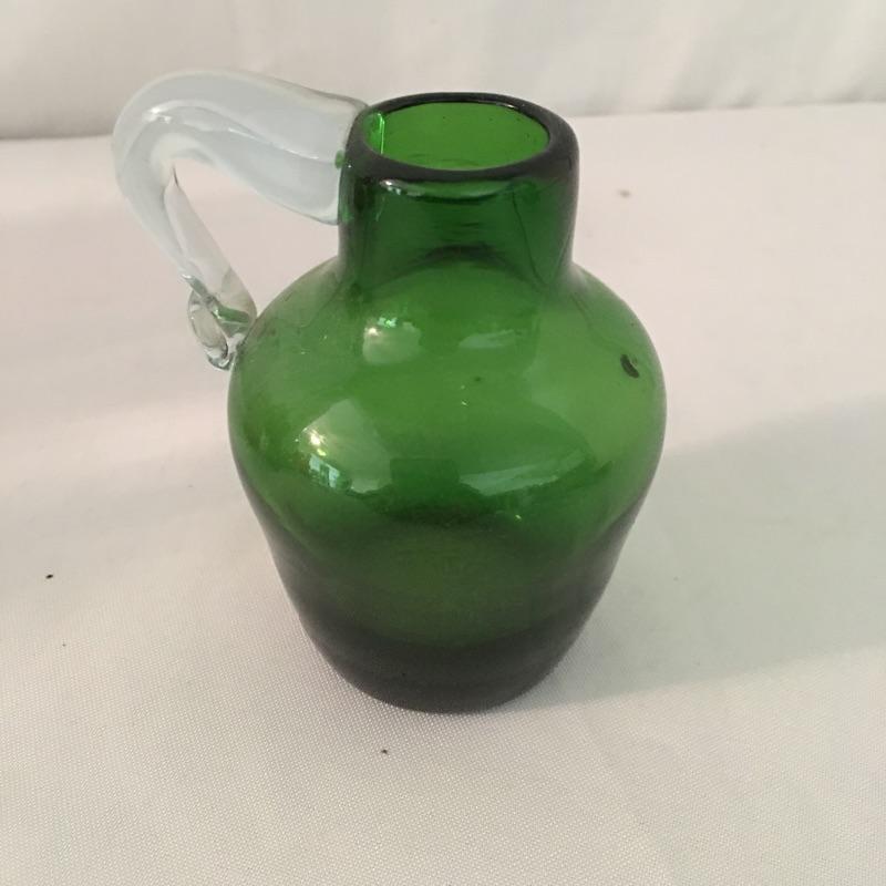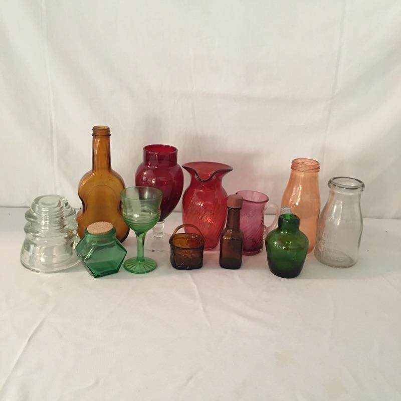 This twelve piece collection of colored glass includes two what appears to be hand blown pitchers, an insulator, a milk bottle, pitcher and an assortment of more bottles.