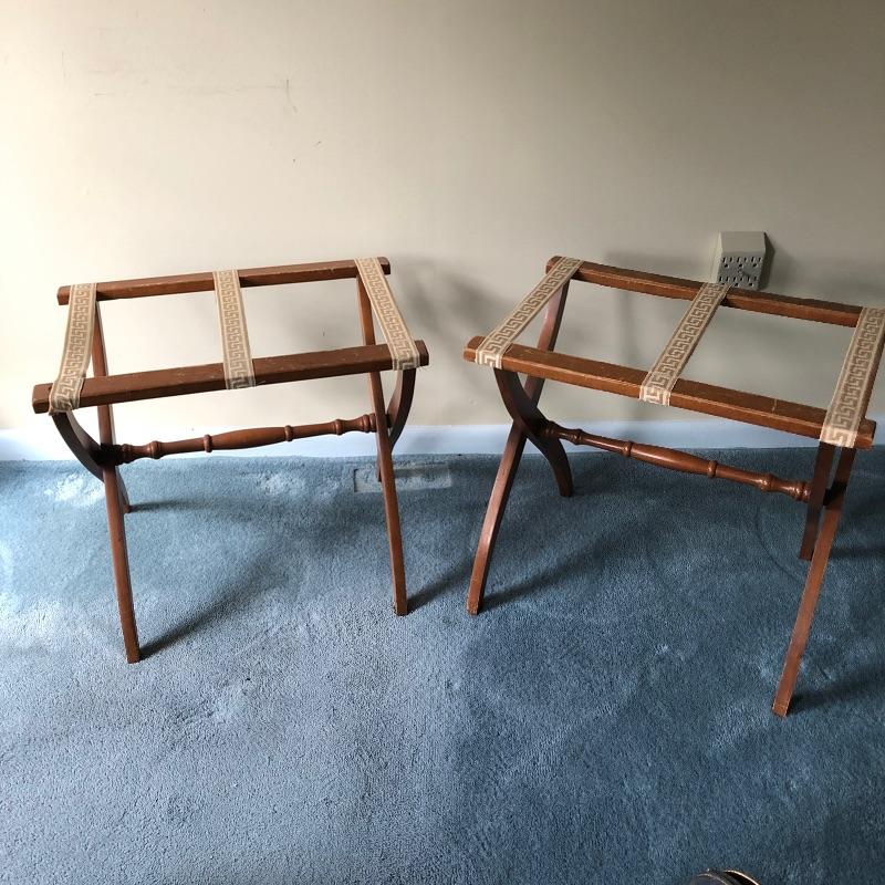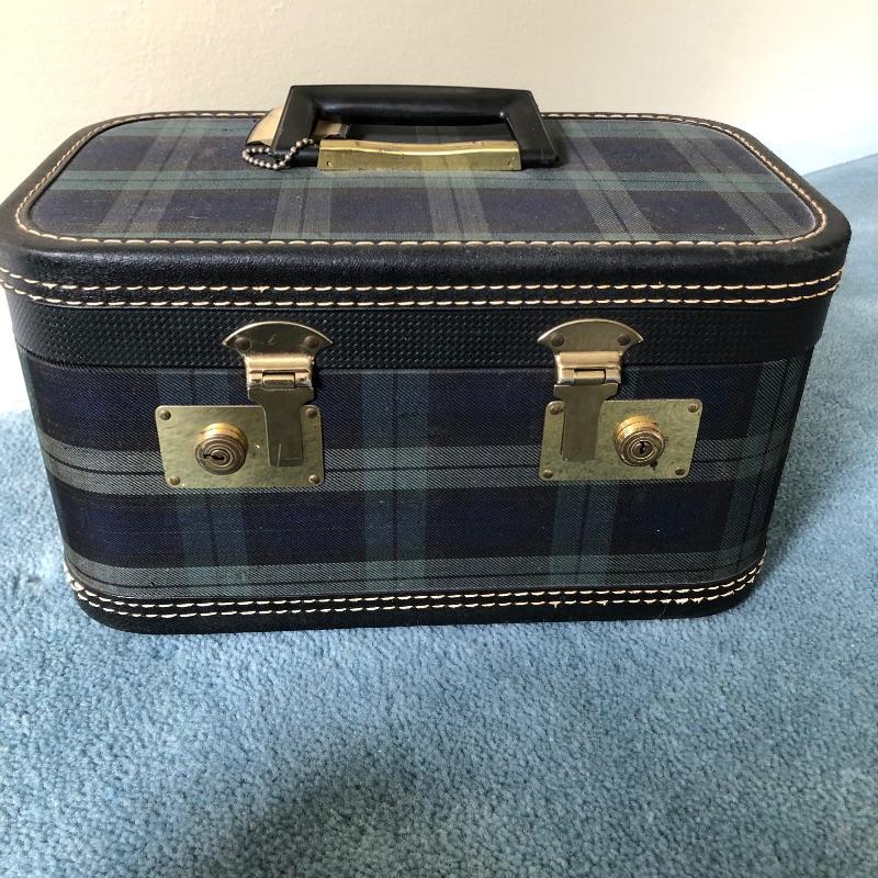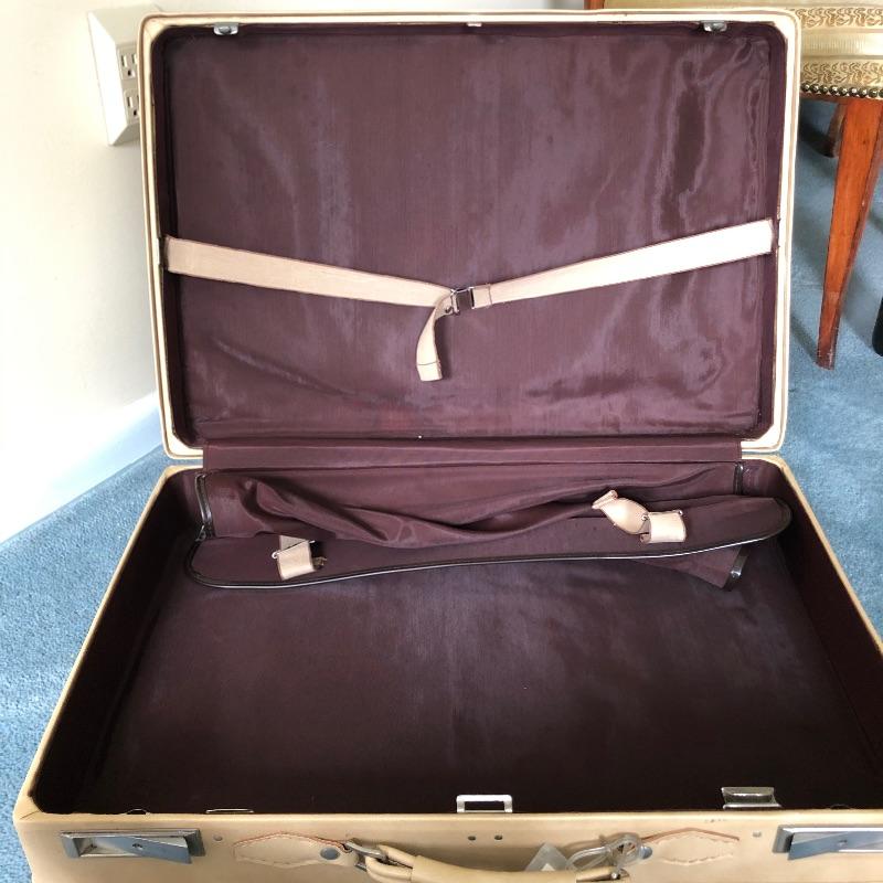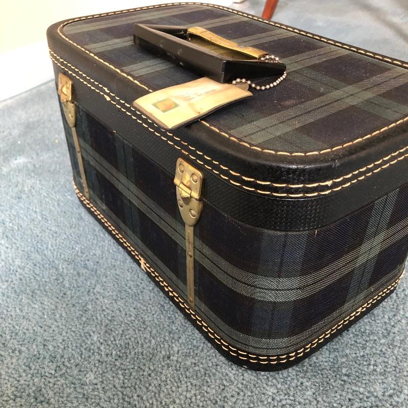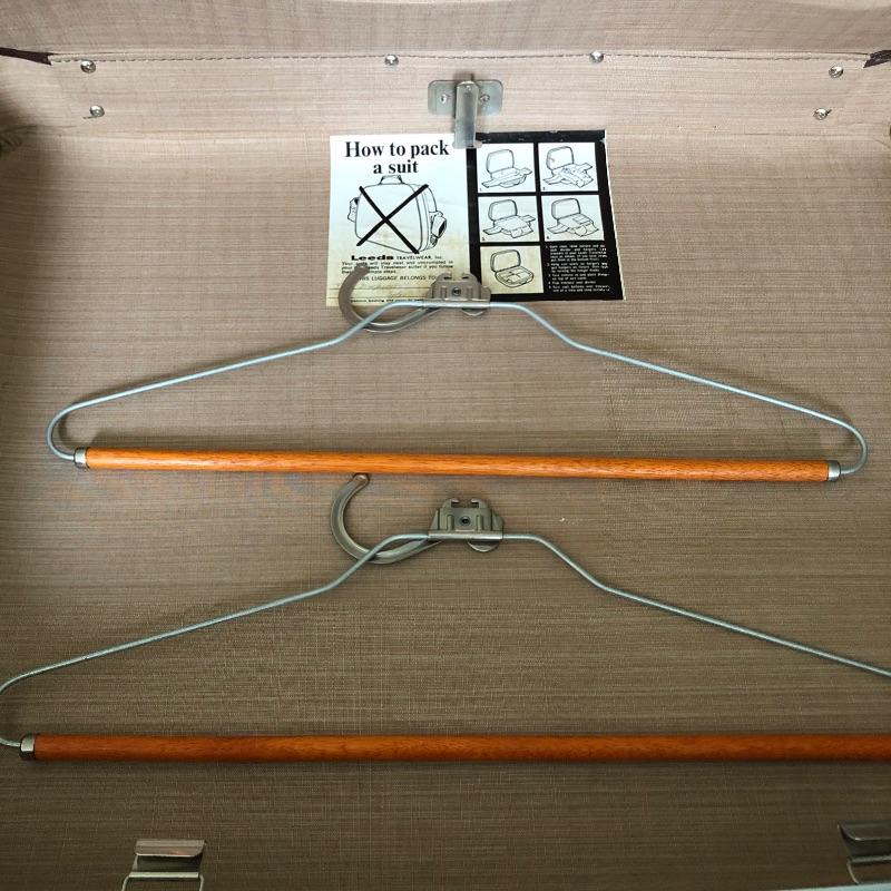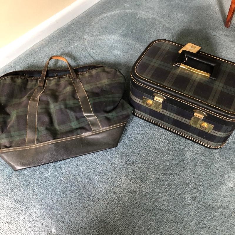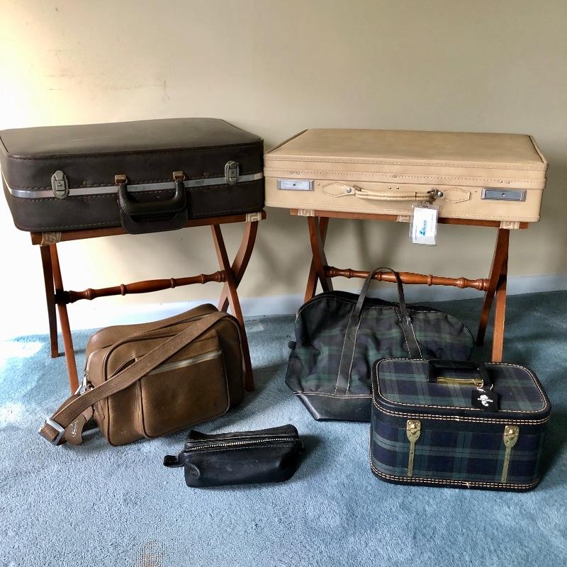 Two vintage suitcases here accompanied by a pair of suitcase stands and various other smaller vintage travel cases and bags. The brown case by Leeds includes two hangers and instructions on how to pack a suit. The blue plaid small case measures 8” deep x 14” wide x 7” tall and comes with a matching tote in need of a good clean. Also includes tan bag made for Escort that has a shoulder strap. The vintage wood suitcase stands are 29” tall and in excellent condition.