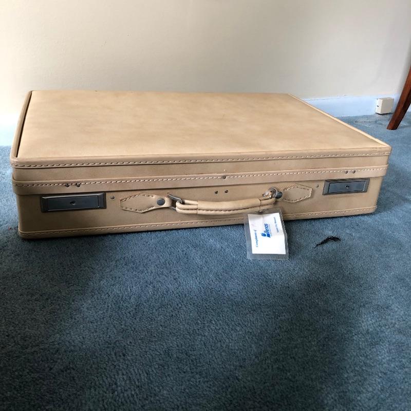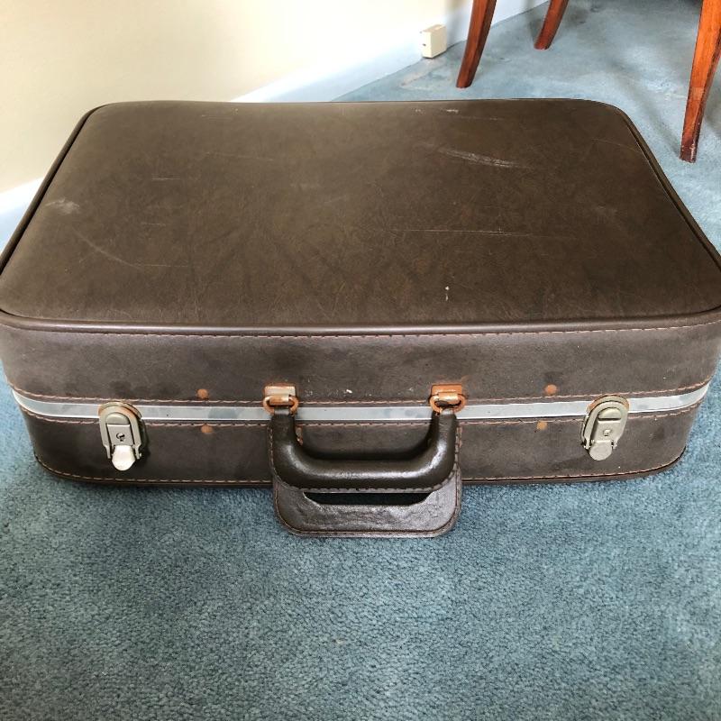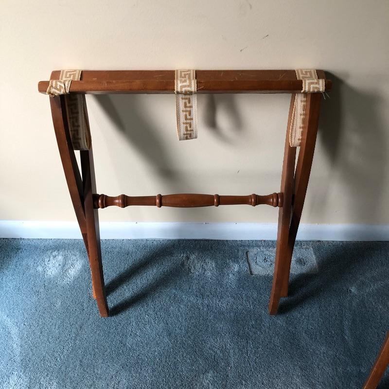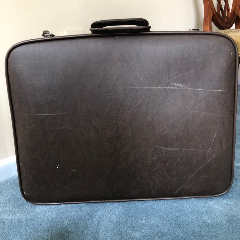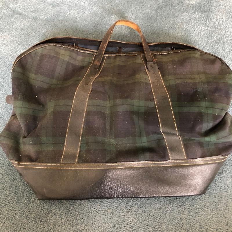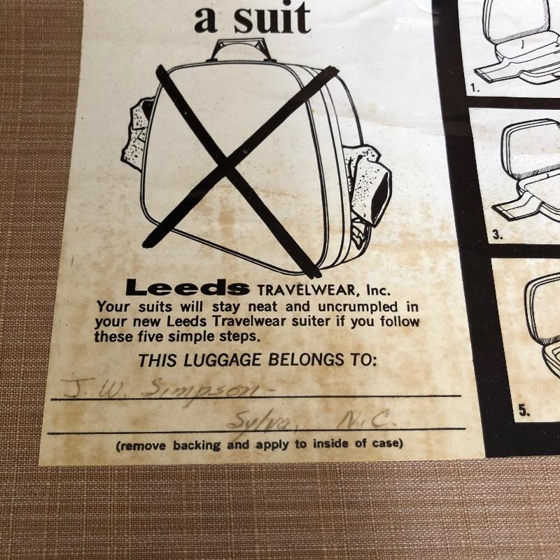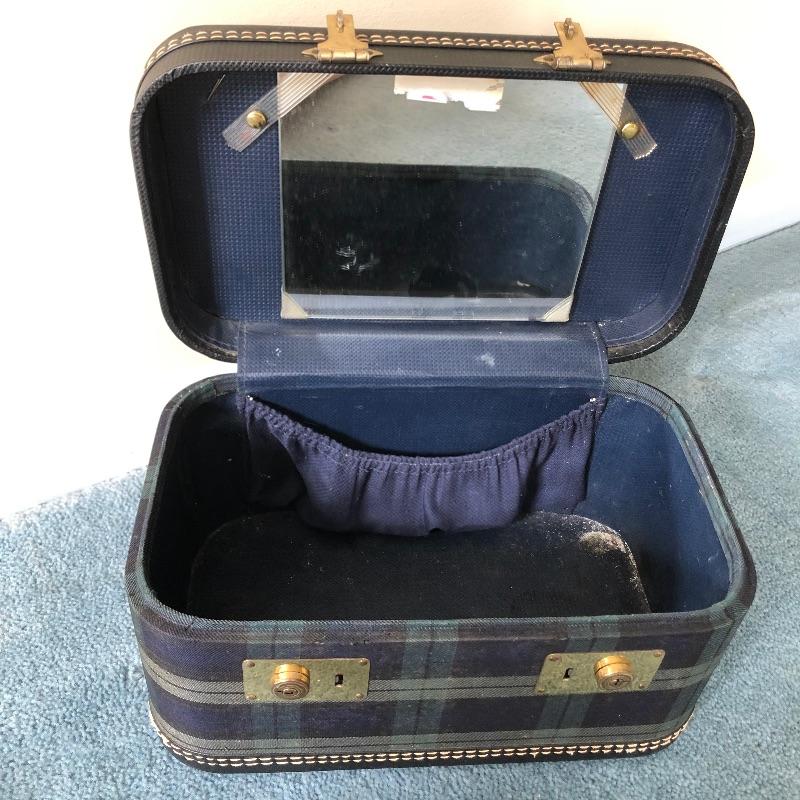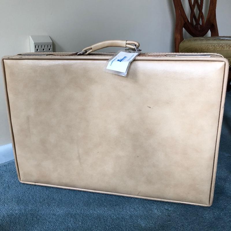 Two vintage suitcases here accompanied by a pair of suitcase stands and various other smaller vintage travel cases and bags. The brown case by Leeds includes two hangers and instructions on how to pack a suit. The blue plaid small case measures 8” deep x 14” wide x 7” tall and comes with a matching tote in need of a good clean. Also includes tan bag made for Escort that has a shoulder strap. The vintage wood suitcase stands are 29” tall and in excellent condition.