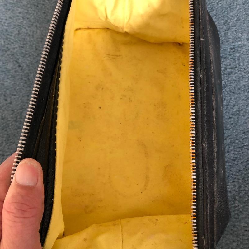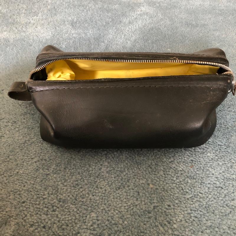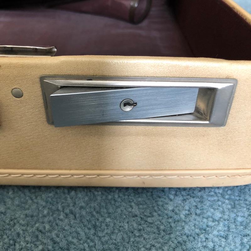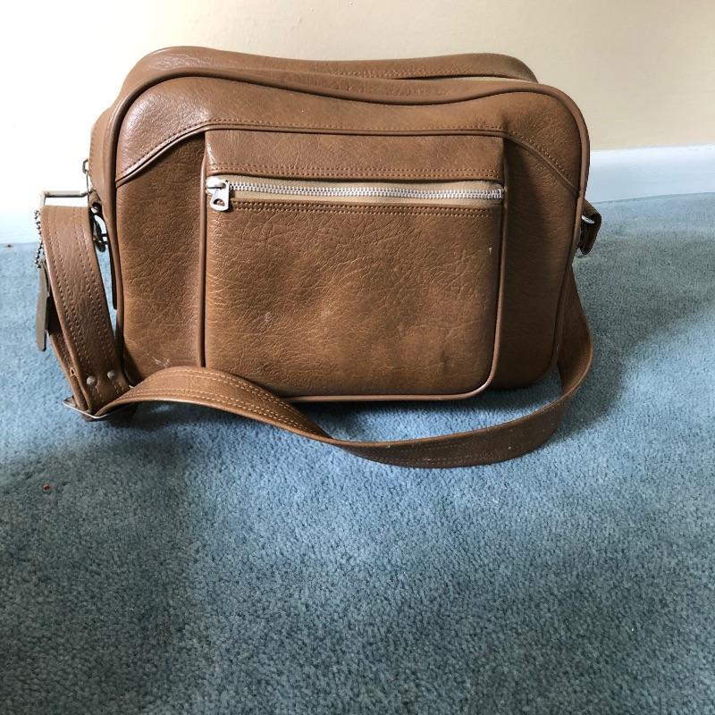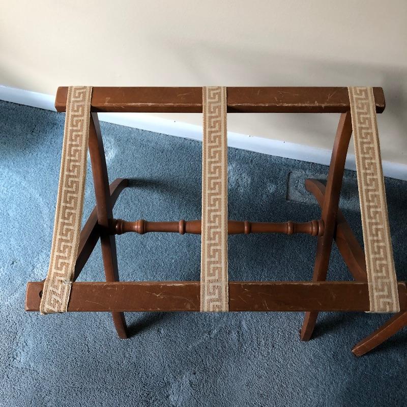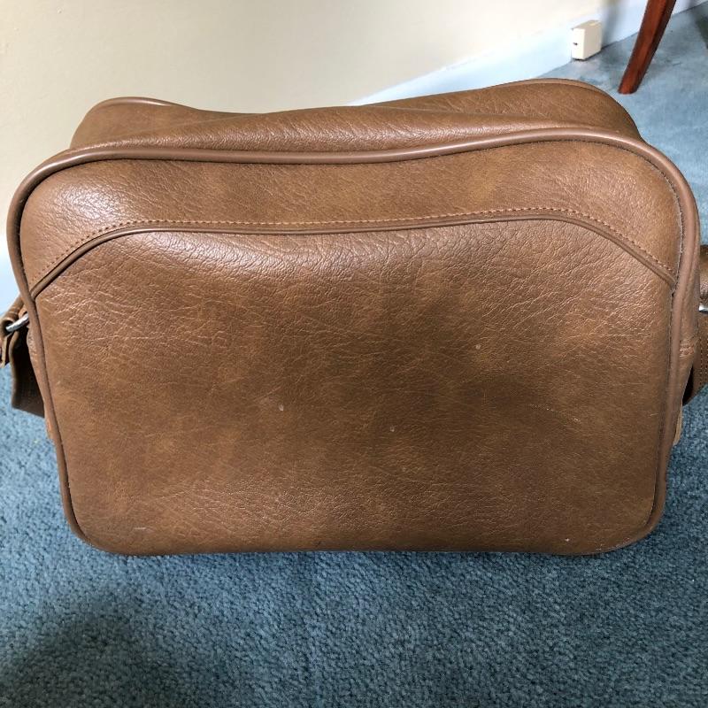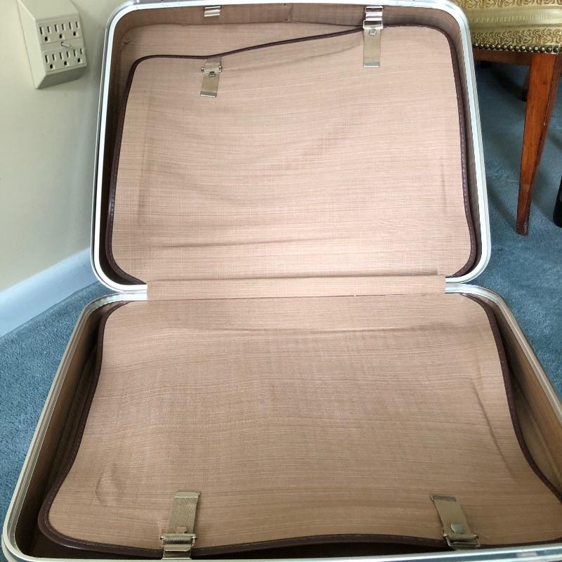 Two vintage suitcases here accompanied by a pair of suitcase stands and various other smaller vintage travel cases and bags. The brown case by Leeds includes two hangers and instructions on how to pack a suit. The blue plaid small case measures 8” deep x 14” wide x 7” tall and comes with a matching tote in need of a good clean. Also includes tan bag made for Escort that has a shoulder strap. The vintage wood suitcase stands are 29” tall and in excellent condition.