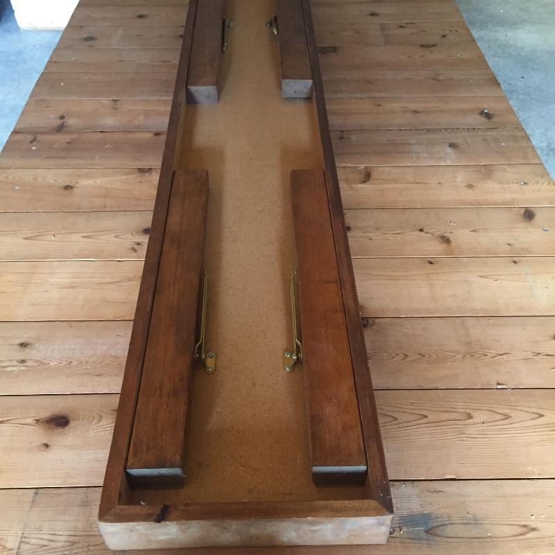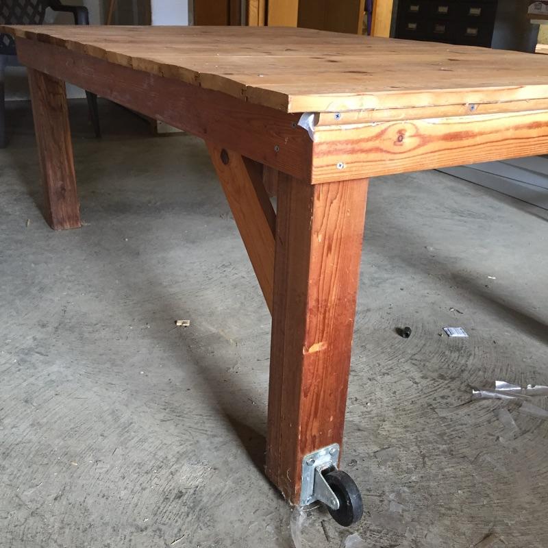 Pair of work tables. Large table measures 40” x 63” x 25 and has wheels on the side of the legs on one end. Smaller table can fold down and measures 11.75” x 60” x 21.75” when legs open.