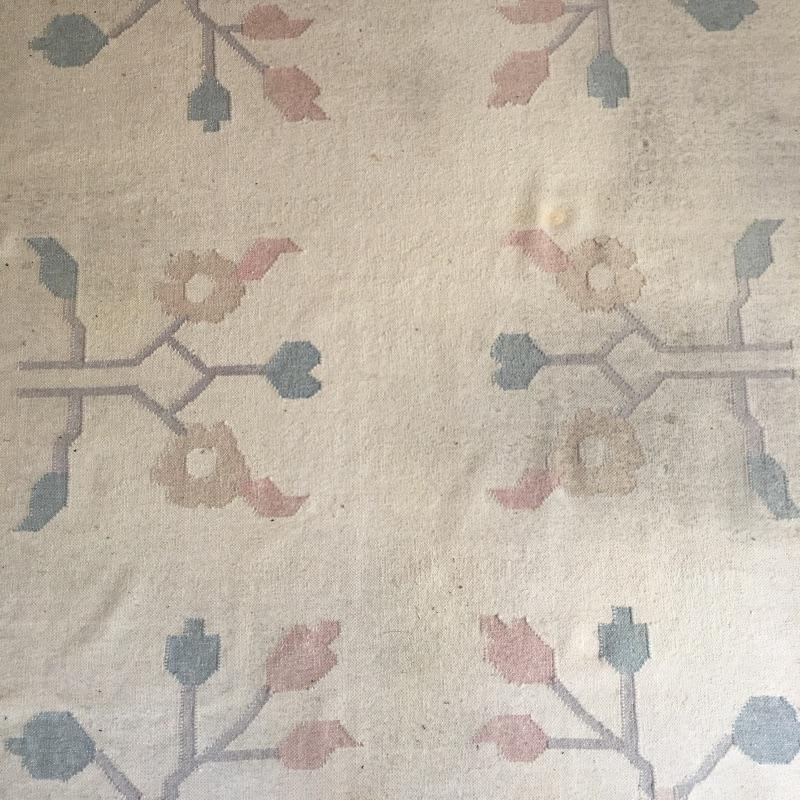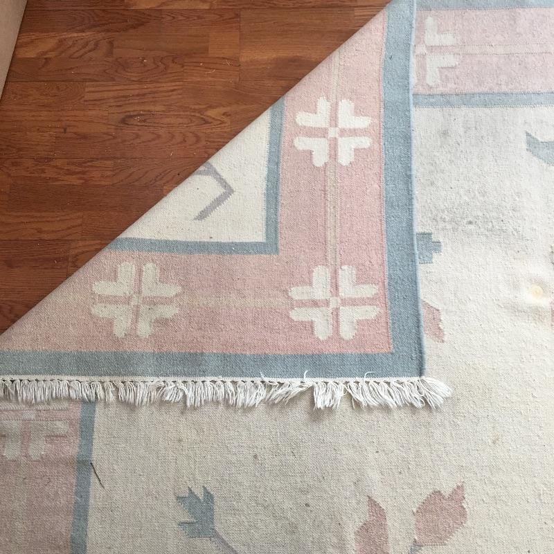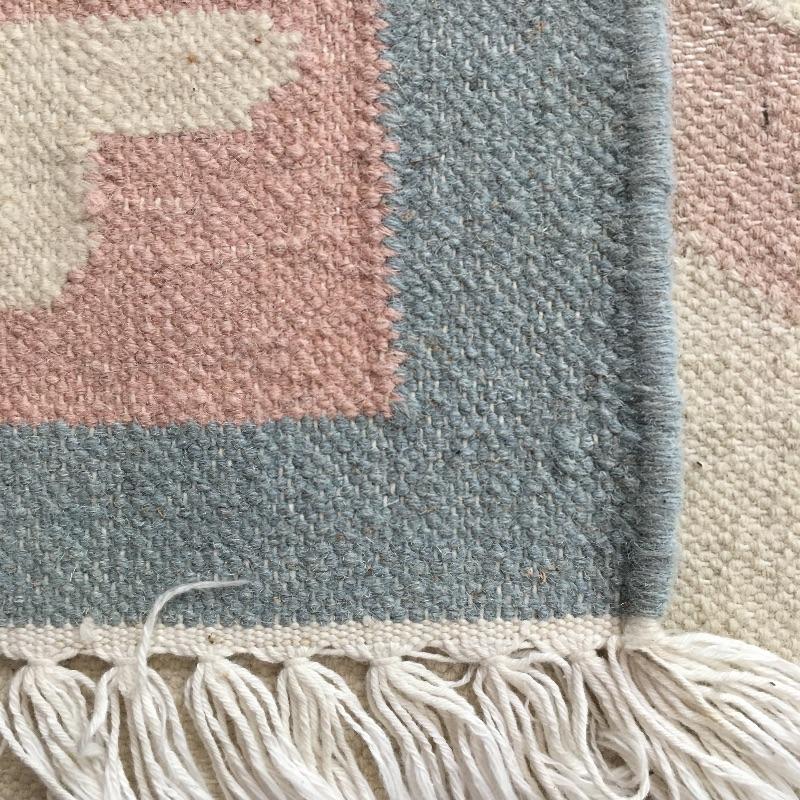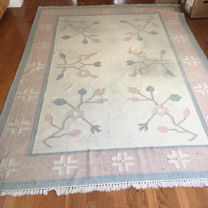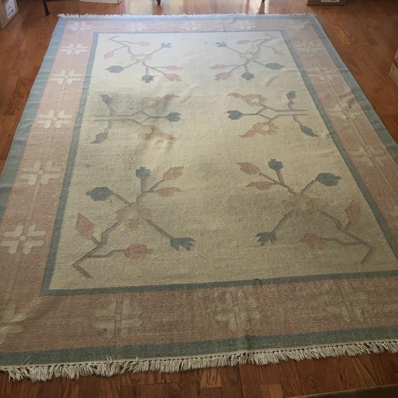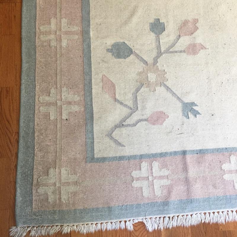 Large woven rug in a pastel with geometric design. Rug is in good shape and looks just to need a good cleaning. Rug measures 76” x 110”.