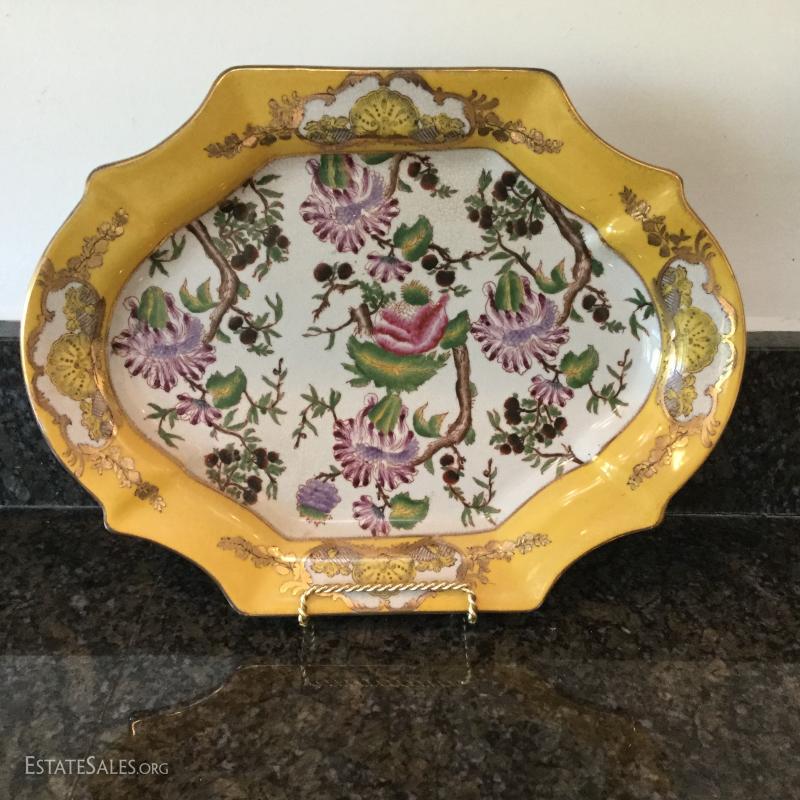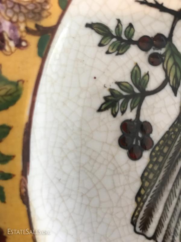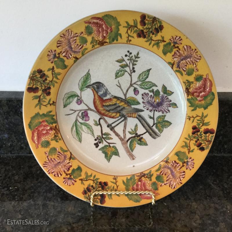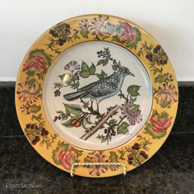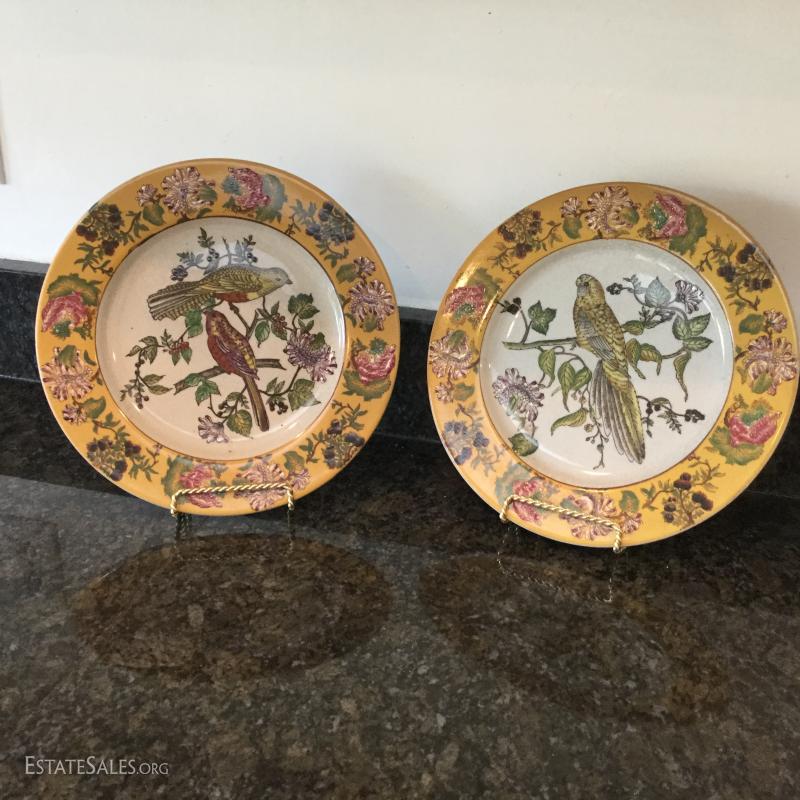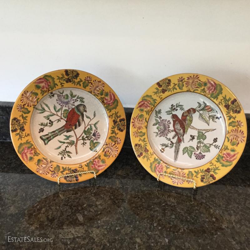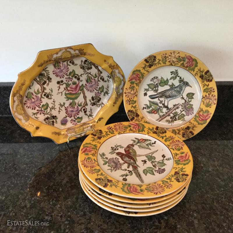Beautiful bird and flower designs on these yellow decorative plates by Mark Roberts. Six different designs on plates that are 10.5" d. Platter is 13.5" long. These are not suitable for eating. A bit dusty from being on wall and crackled ceramic surface. See photos. Shipping available or local pick up in Flat Rock, NC.