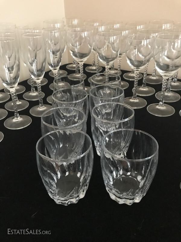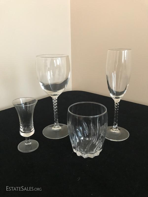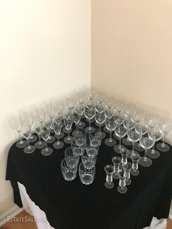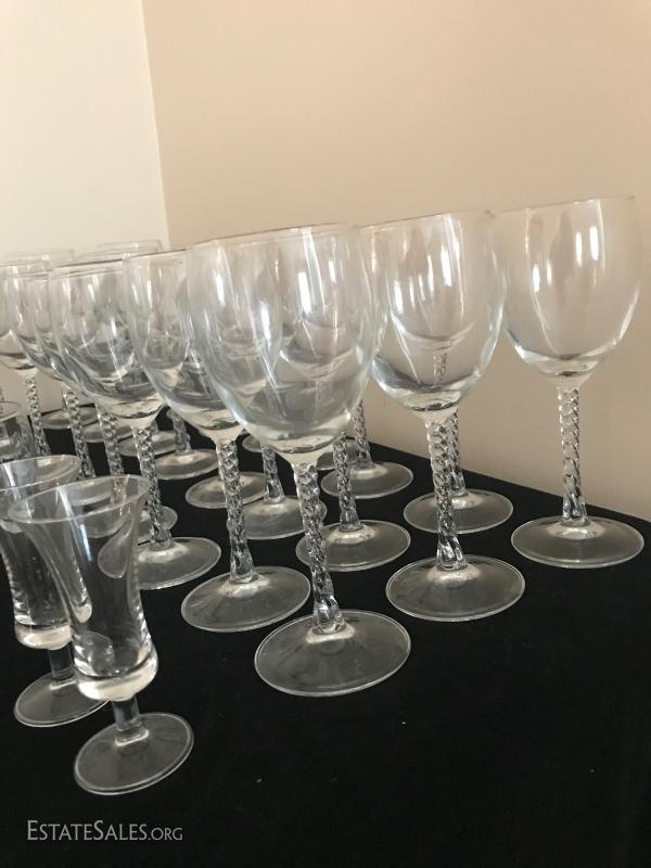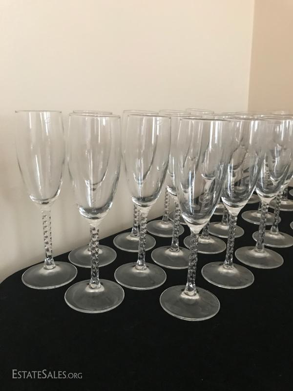 Get ready for the holiday season with this like-new collection of glassware. Matching champagne and wine glasses with a twisted stem (24 wine, 14 champagne). 8 low boys and 6 stem cordials. This lot is available for local pick up in Mills River, NC only.