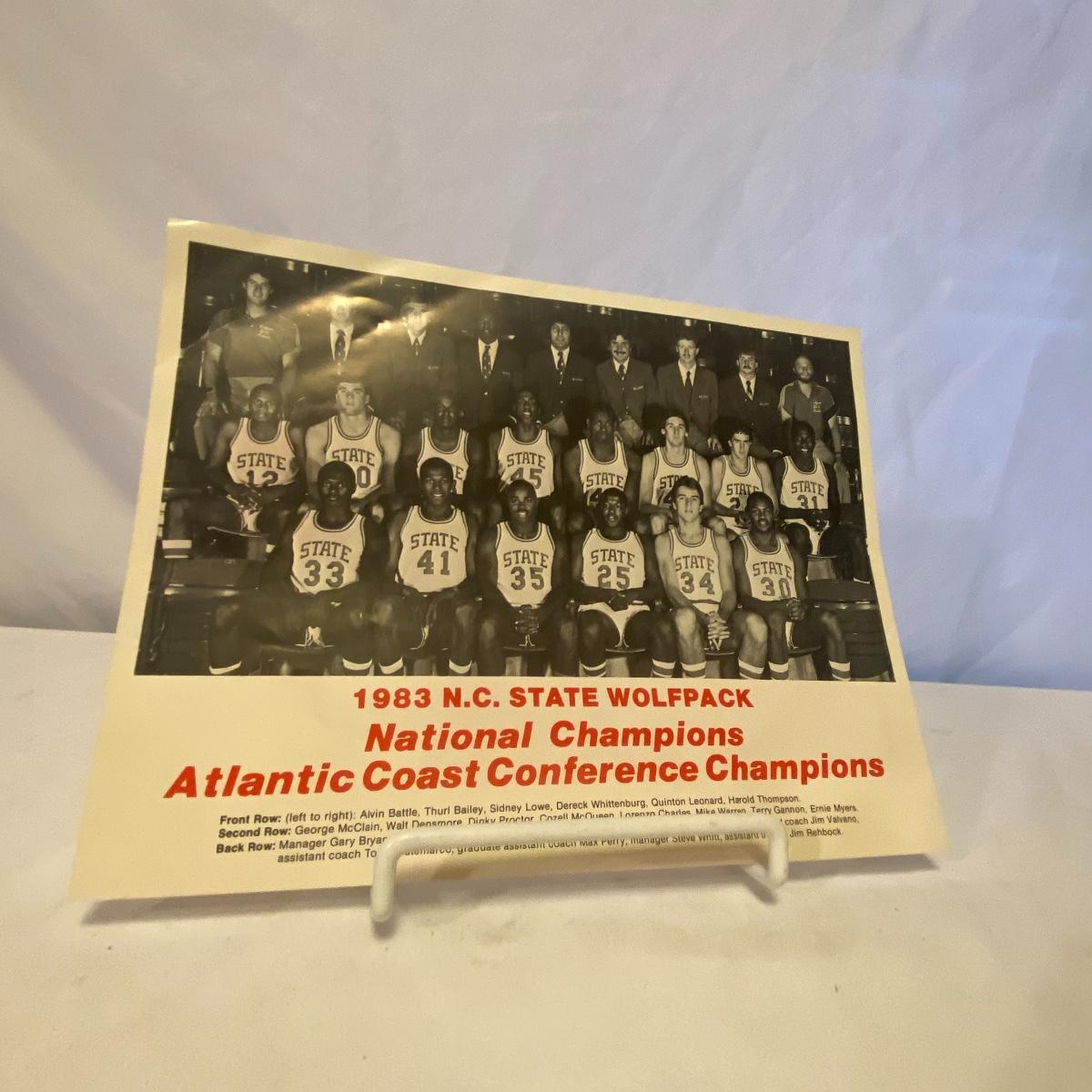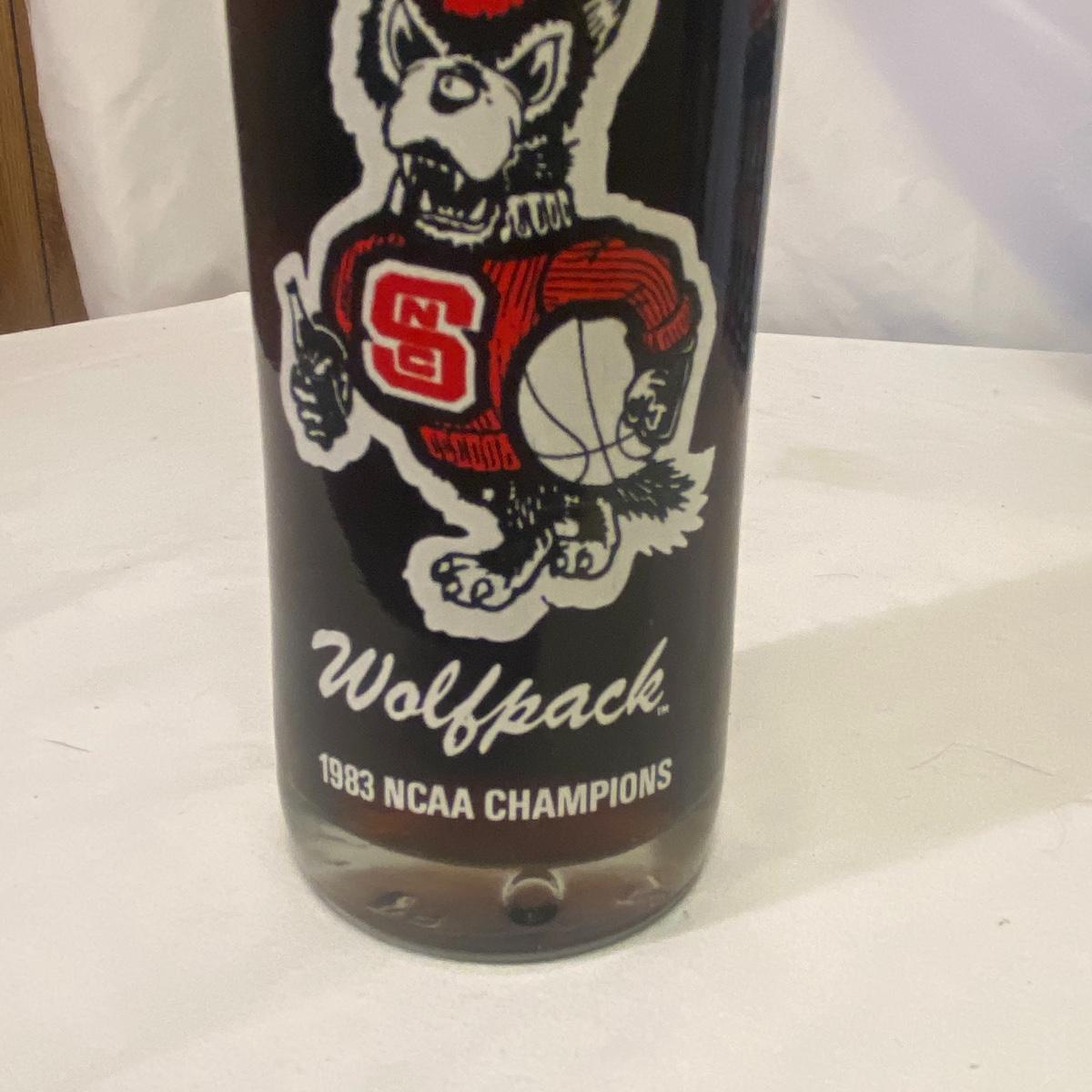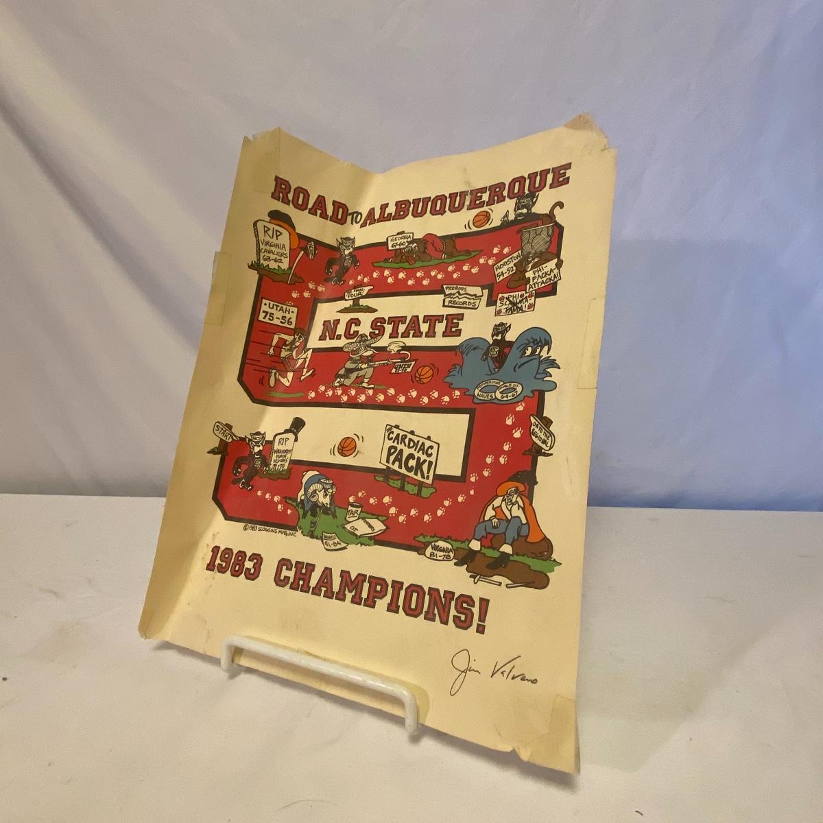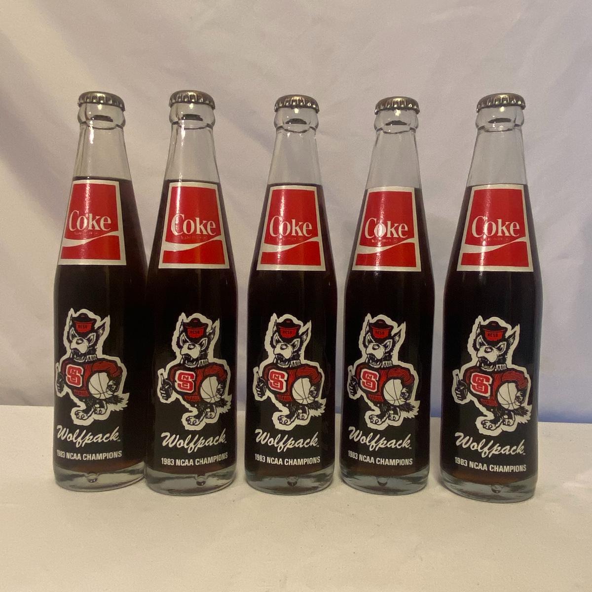 North Carolina State Wolfpack packed lot! Highlighting Valvano glory days! Lot includes five 10" 1983 NCAA Championship Coke bottles. Lot includes other wolfpack championship memorabilia, including Jim Valvano signature on championship posters. See photos. Lot also includes aged NC State stadium chair, measures 12"x12"x15". See photos, Shipping available