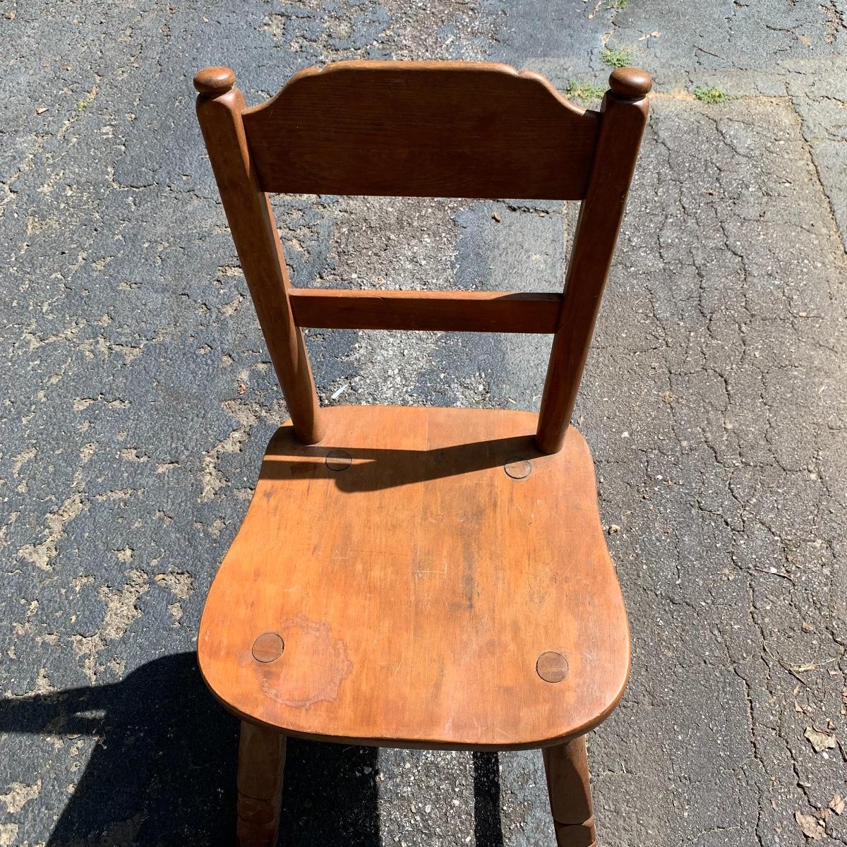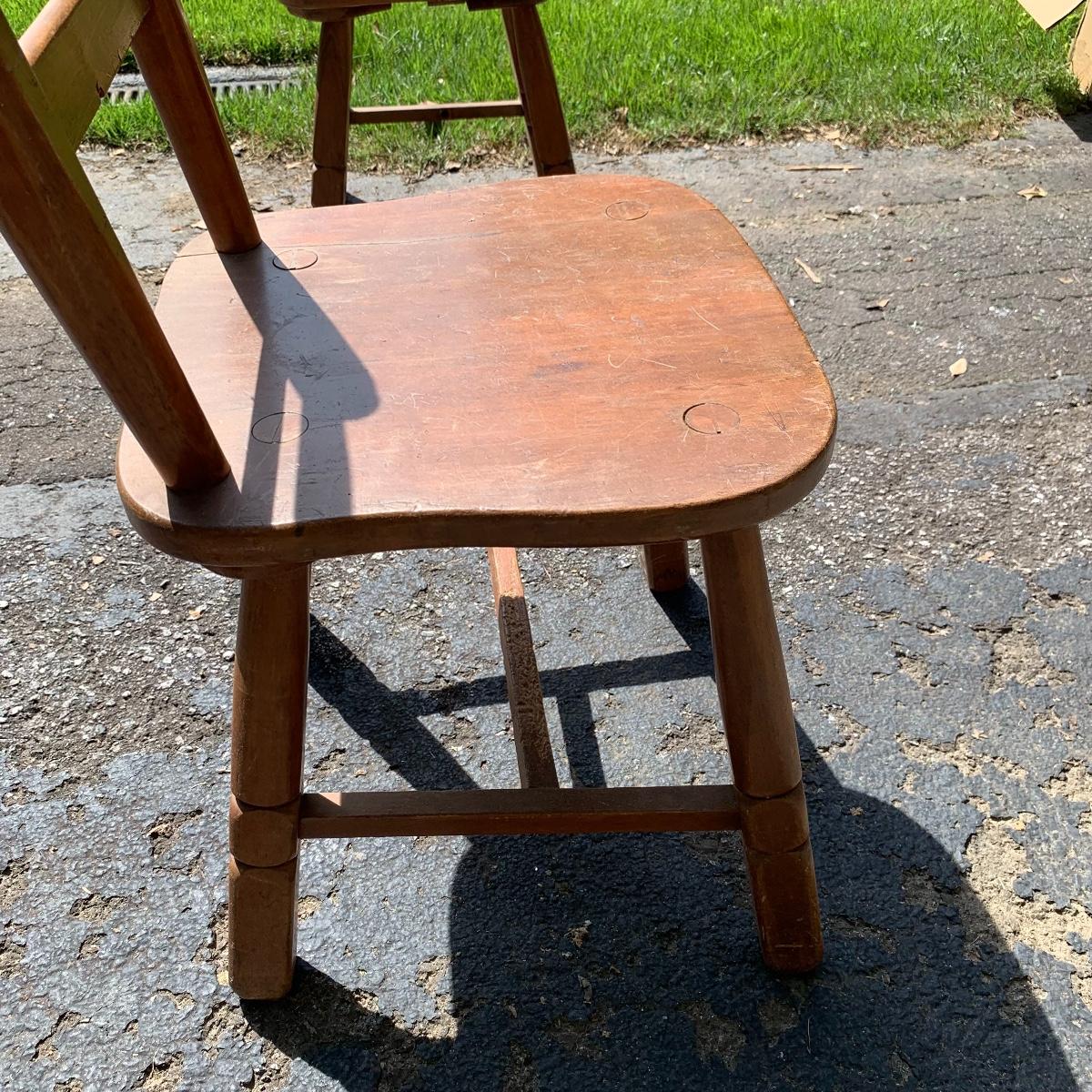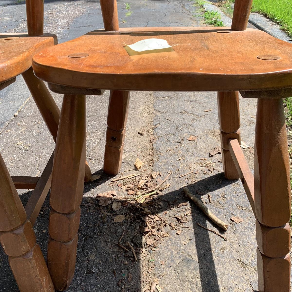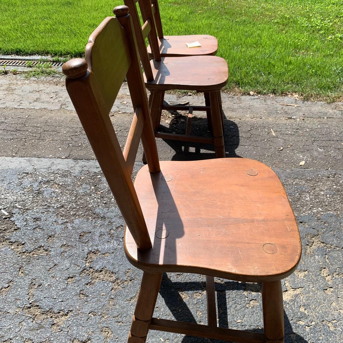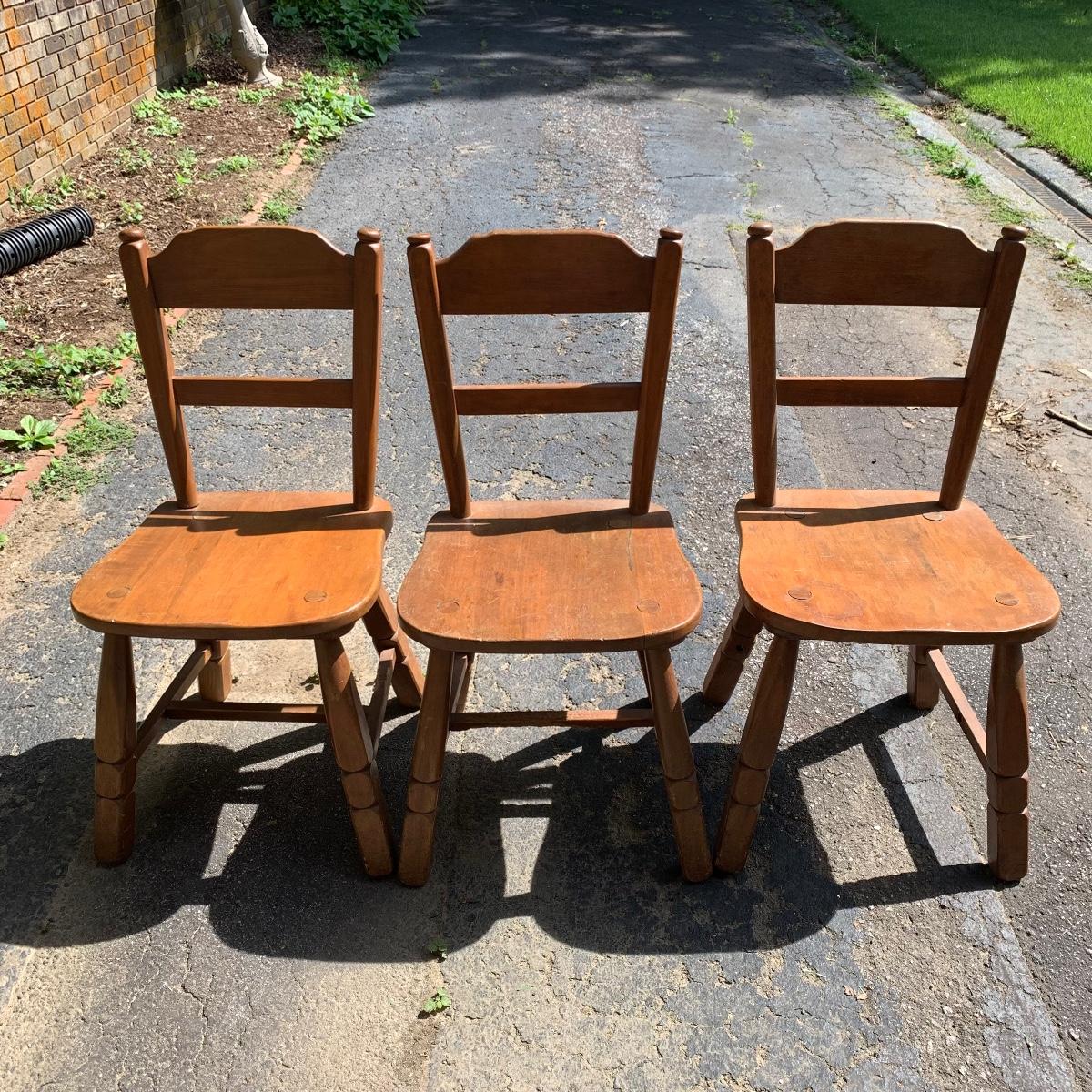This lot is three nice sturdy wooden chairs. They measure approximately 18” x 17” x 33.5”. The seat height is 17”. They show some wear, signs of scratches and some chew marks, but perfectly sturdy. One of the chairs is missing the small lower pieces of wood that connect the legs. Local pickup only.