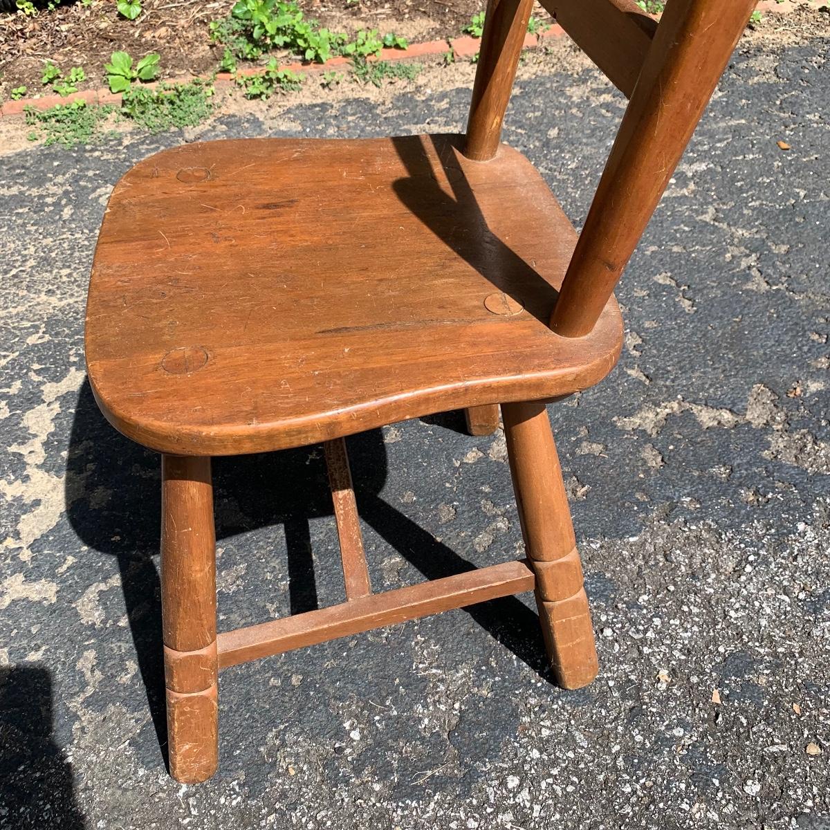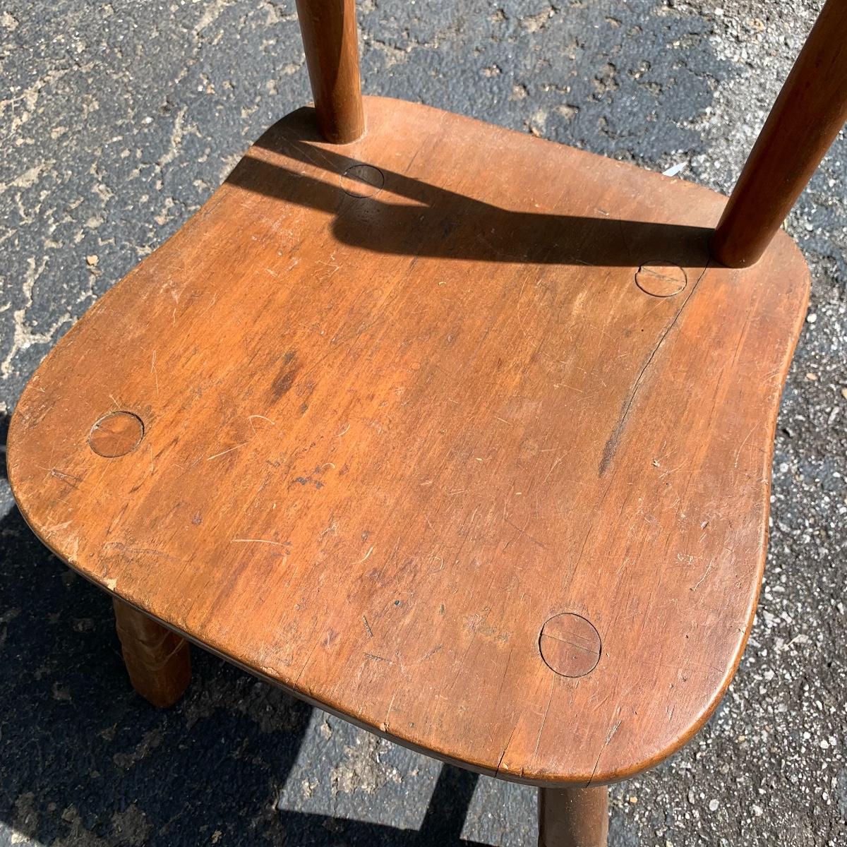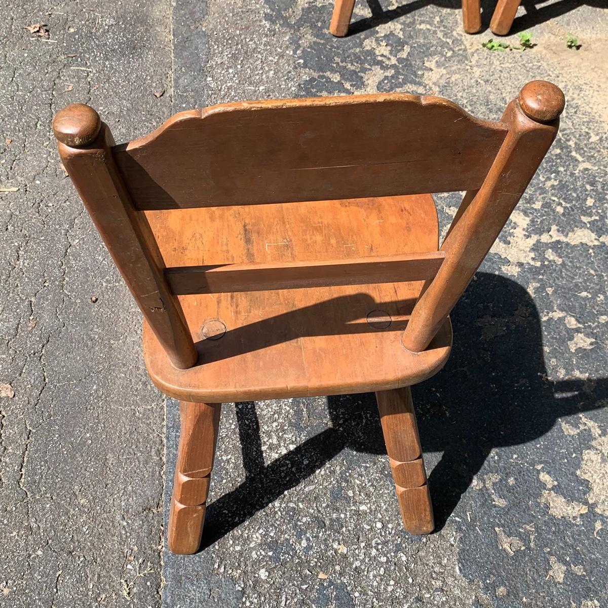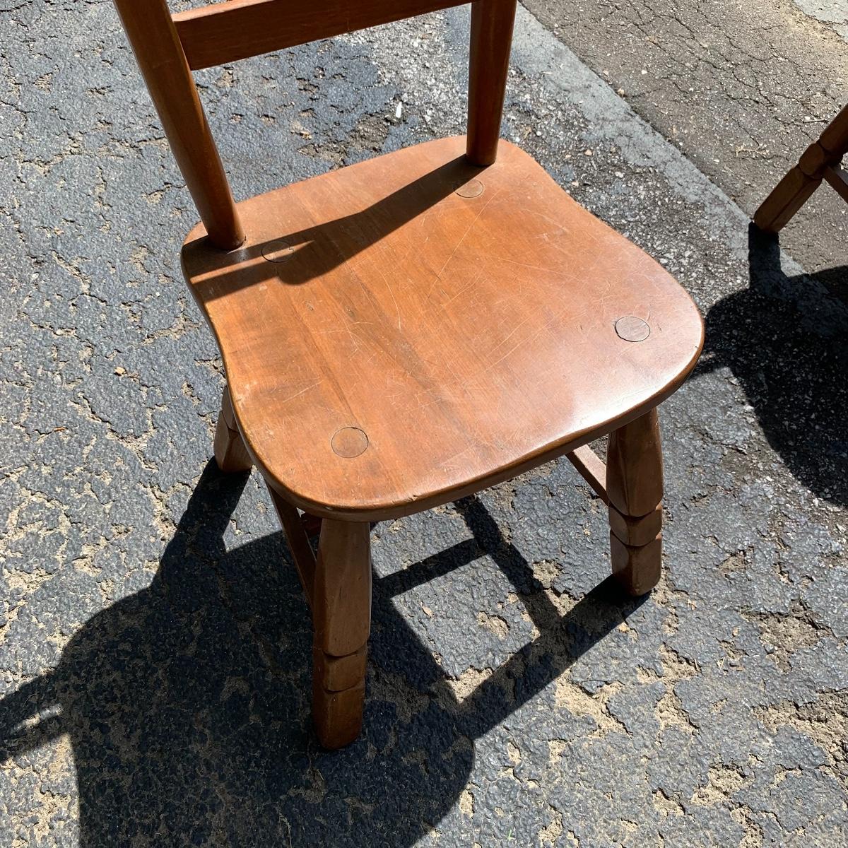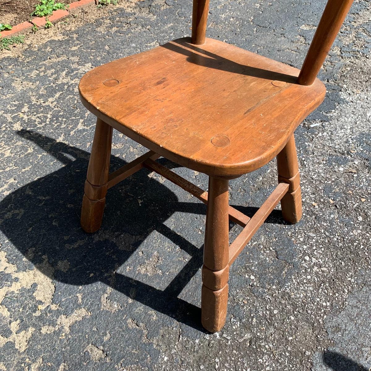 This lot is three nice sturdy wooden chairs. They measure approximately 18” x 17” x 33.5”. The seat height is 17”. They show some wear, signs of scratches and some chew marks, but perfectly sturdy. One of the chairs is missing the small lower pieces of wood that connect the legs. Local pickup only.