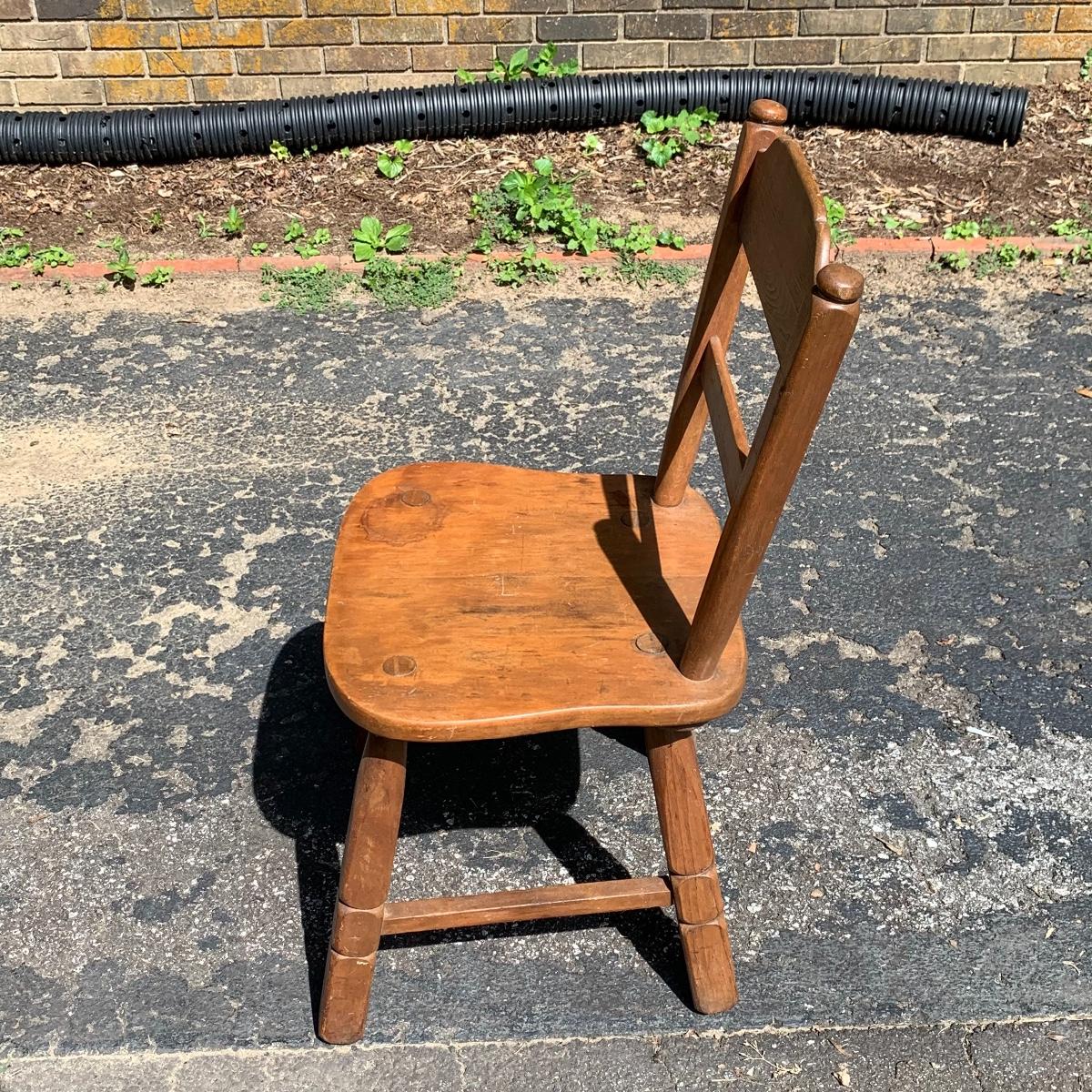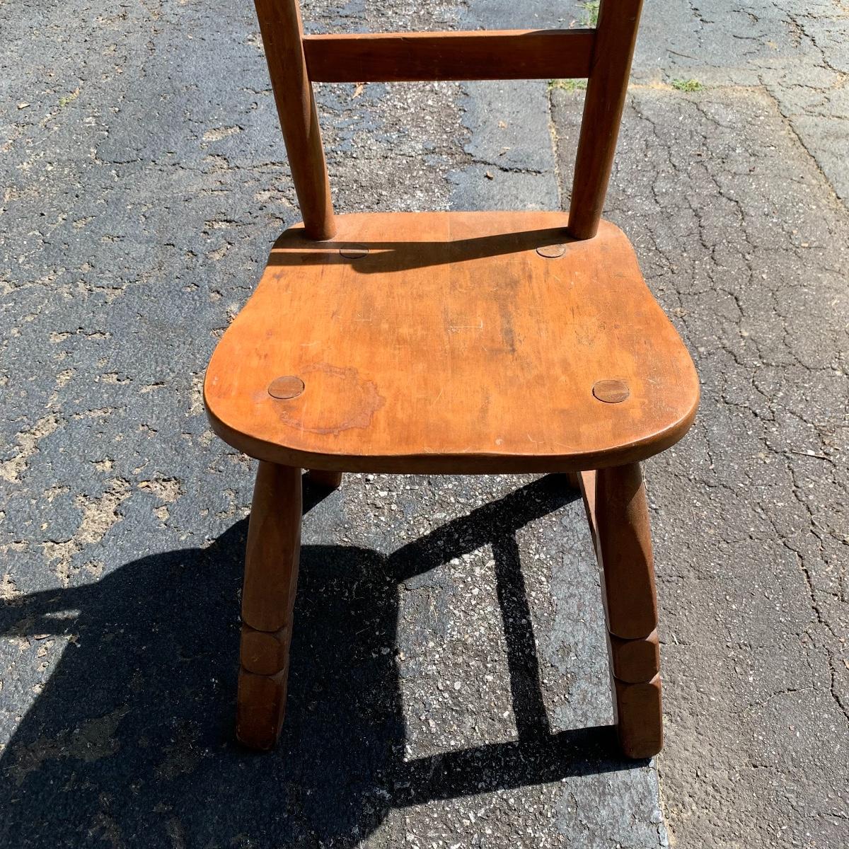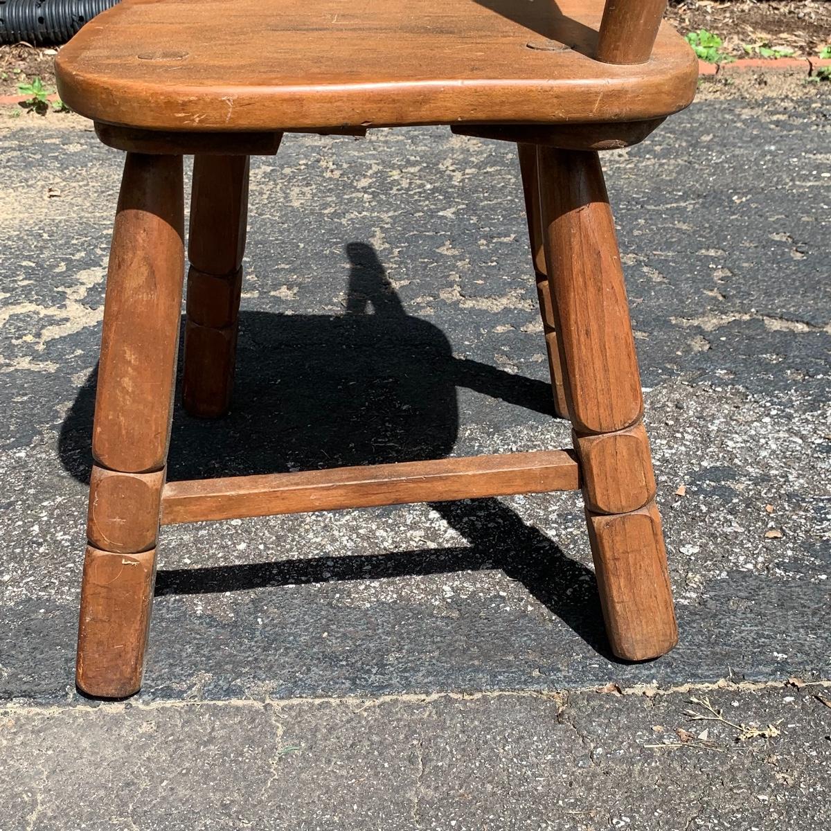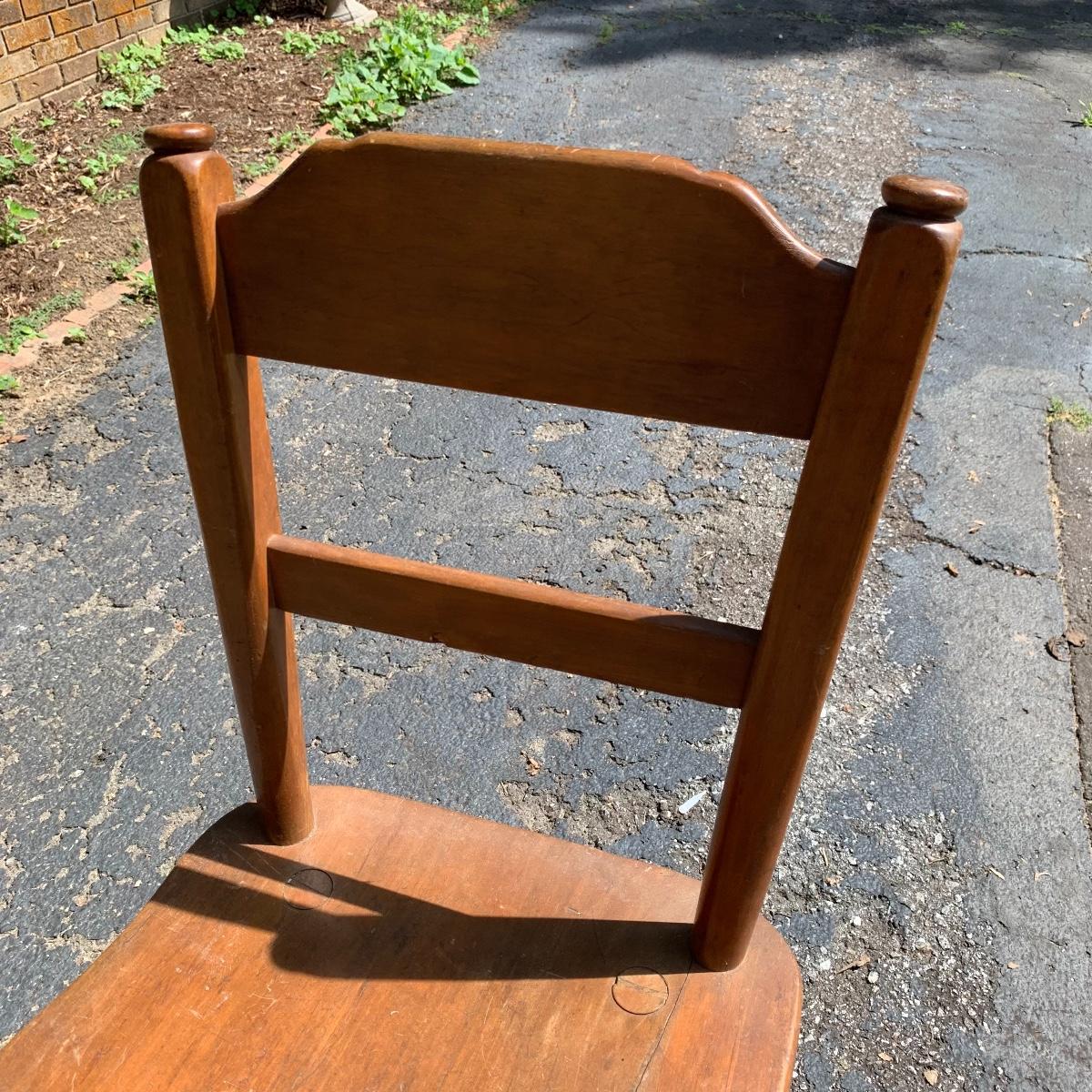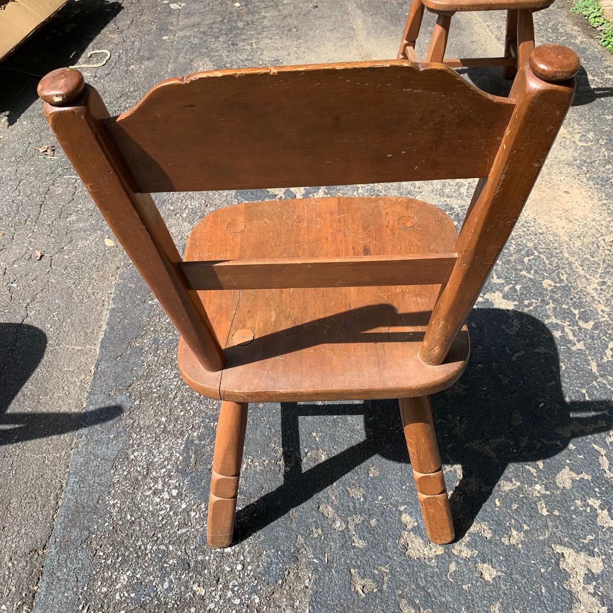 This lot is three nice sturdy wooden chairs. They measure approximately 18” x 17” x 33.5”. The seat height is 17”. They show some wear, signs of scratches and some chew marks, but perfectly sturdy. One of the chairs is missing the small lower pieces of wood that connect the legs. Local pickup only.