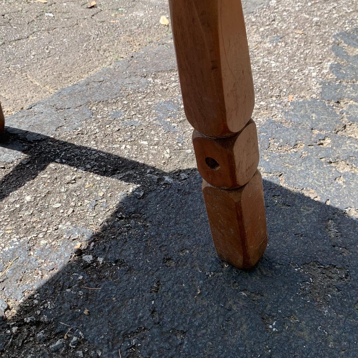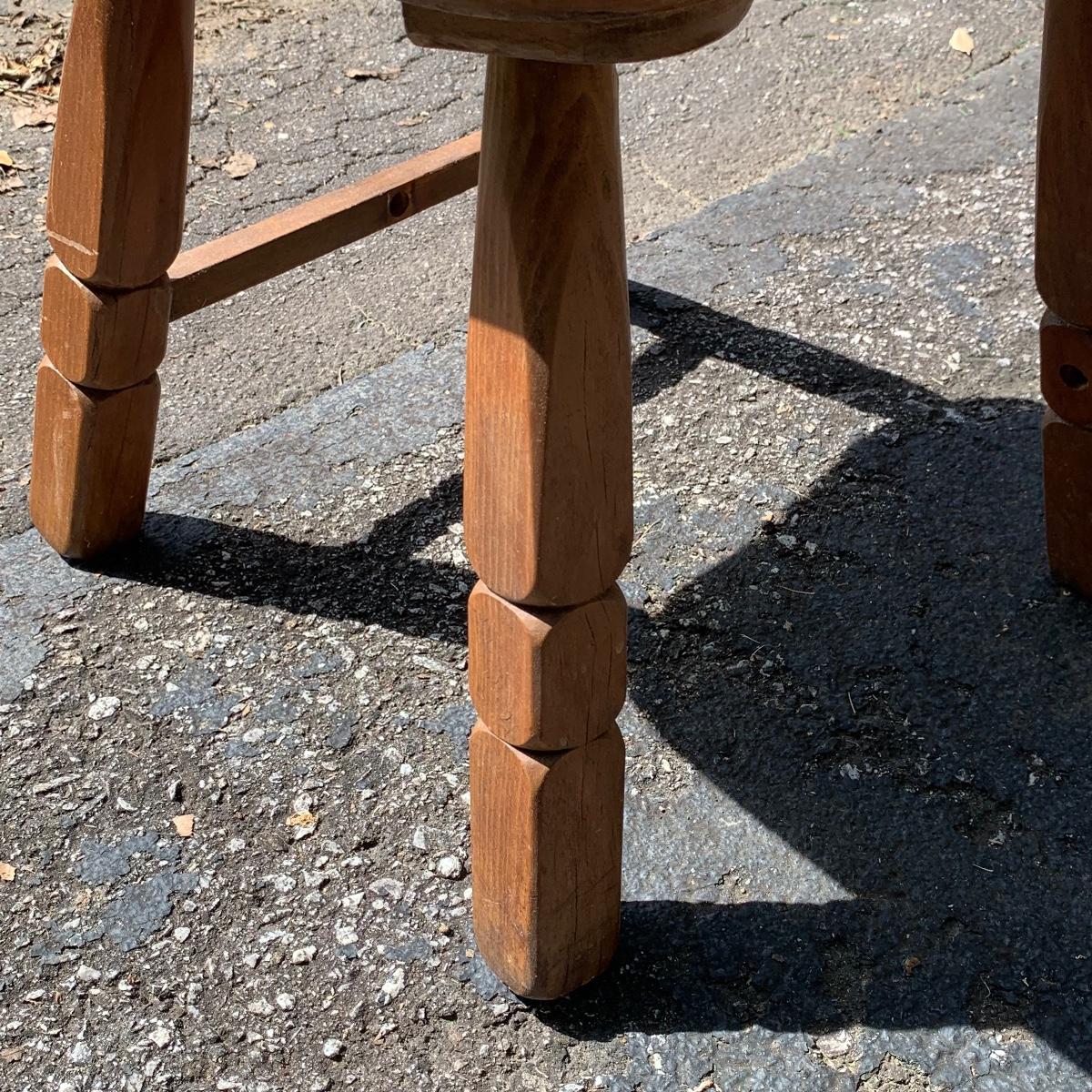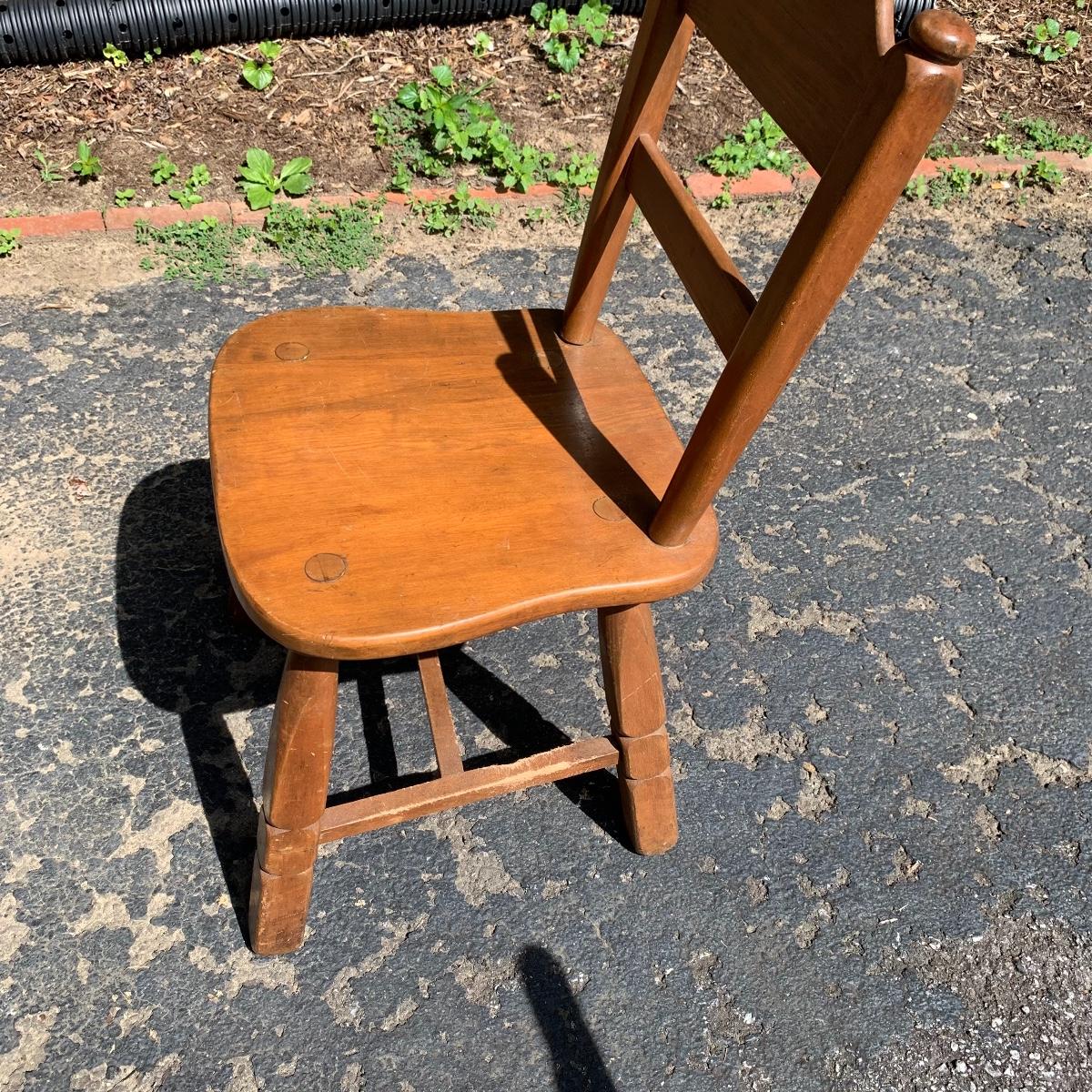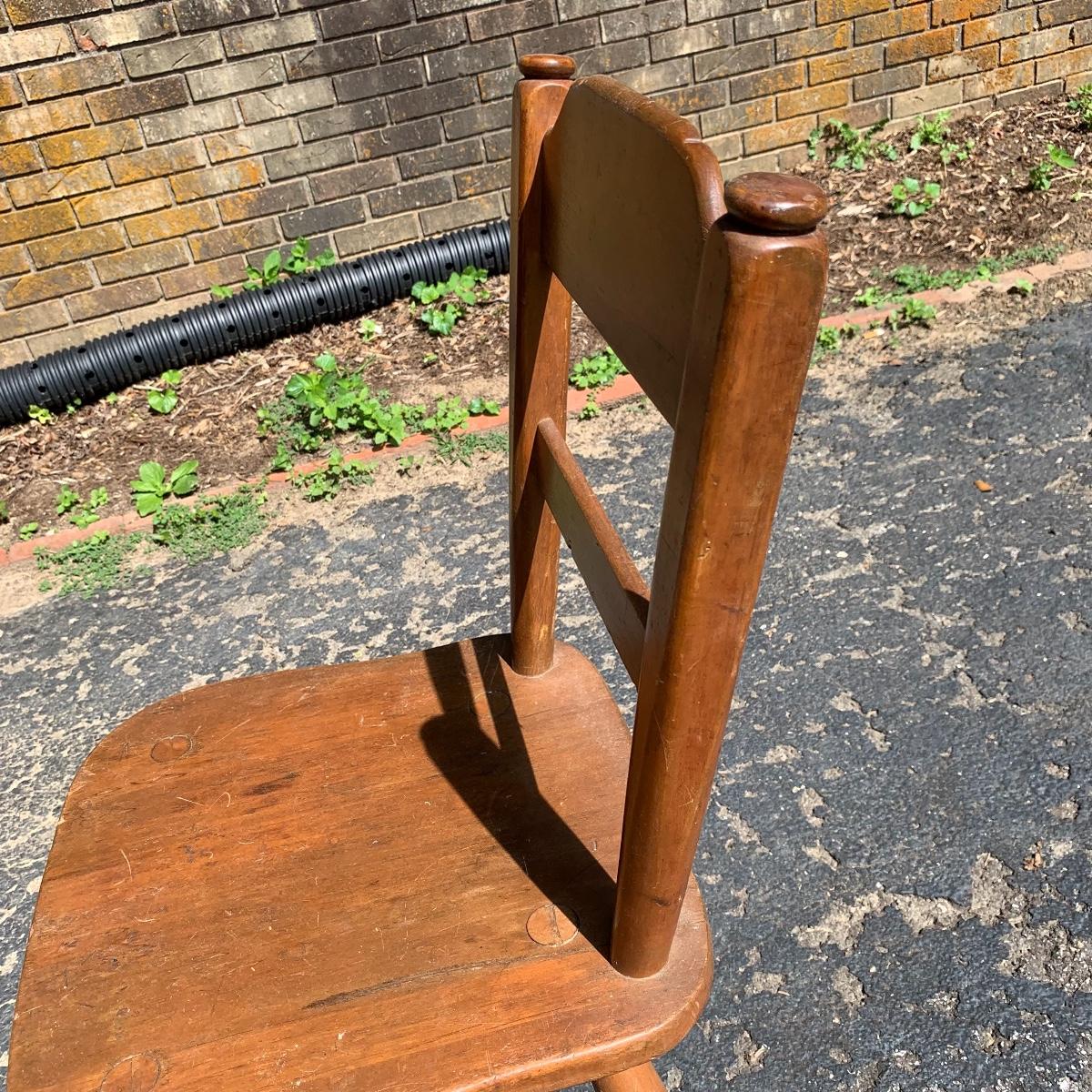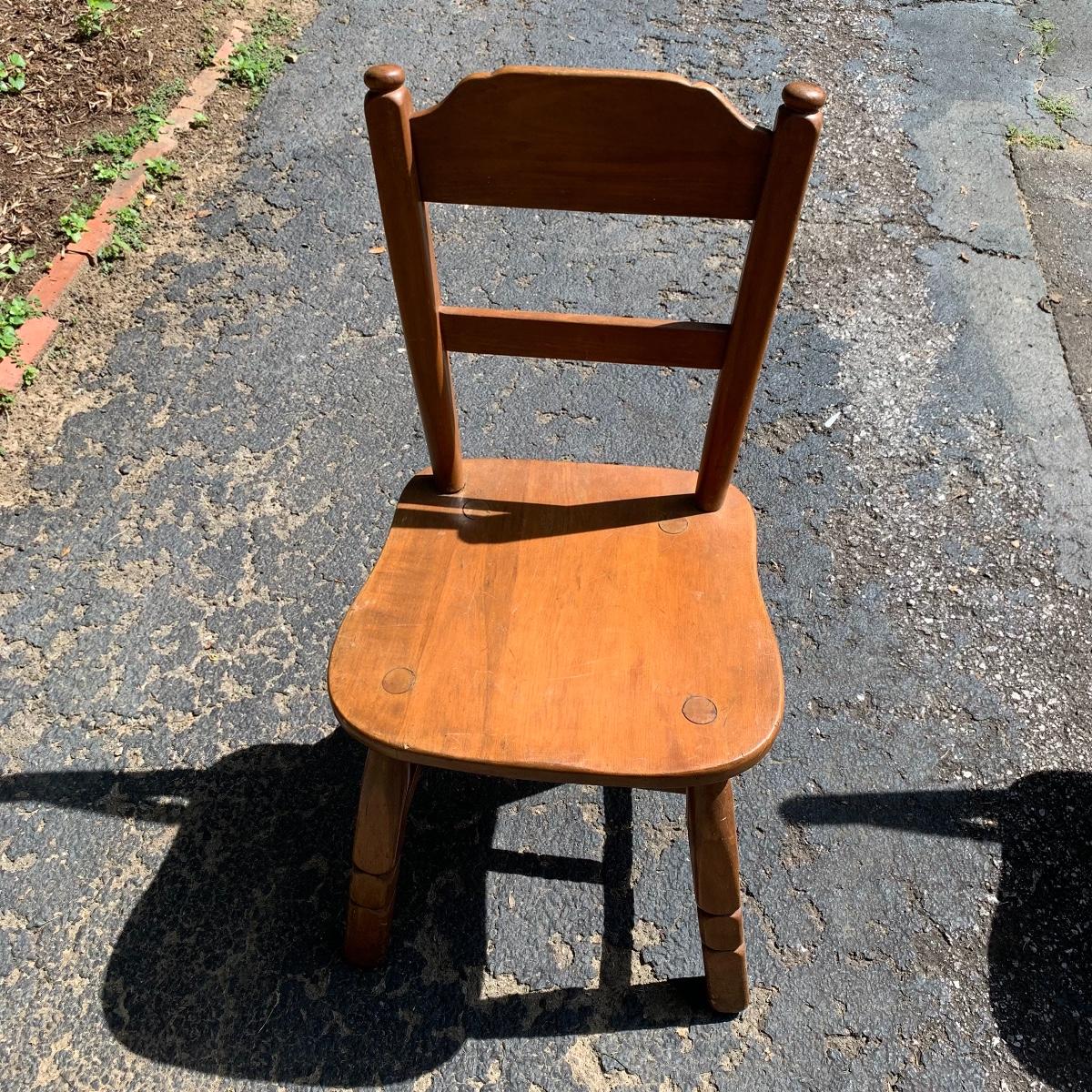This lot is three nice sturdy wooden chairs. They measure approximately 18” x 17” x 33.5”. The seat height is 17”. They show some wear, signs of scratches and some chew marks, but perfectly sturdy. One of the chairs is missing the small lower pieces of wood that connect the legs. Local pickup only.