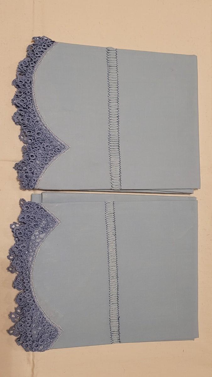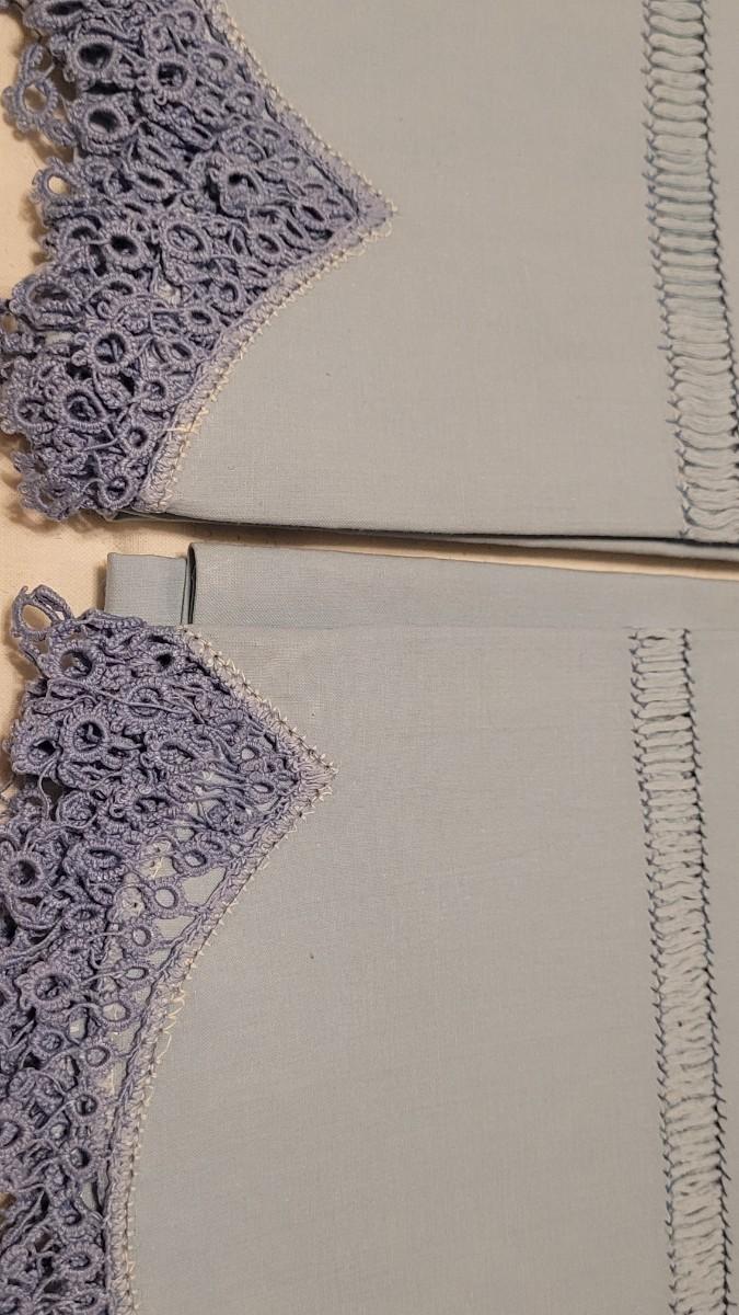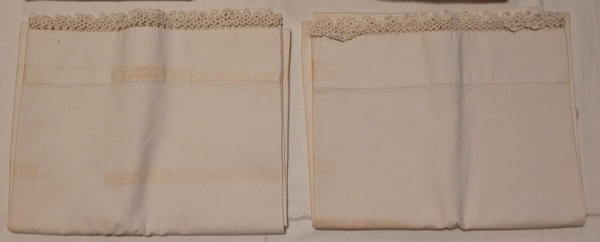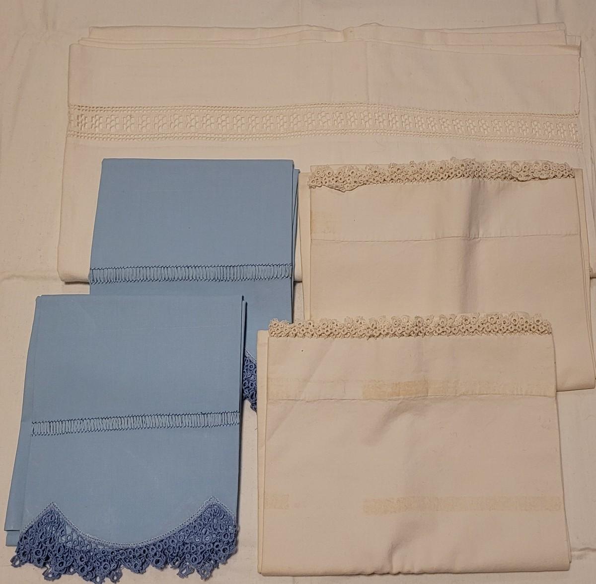 Lot 132: Vintage Handmade Crochet Edge Blue Pillowcases, Eggshell Pillowcases (was tape residue) and (2) White Full Flat Sheet