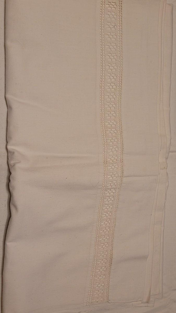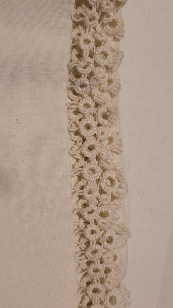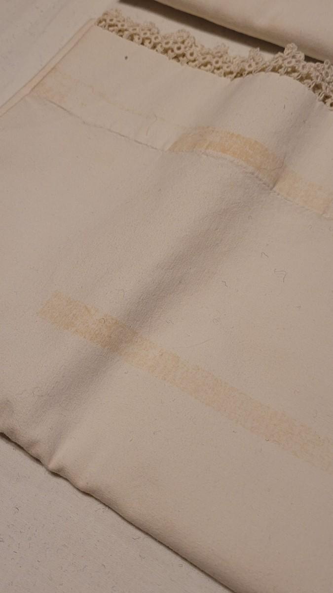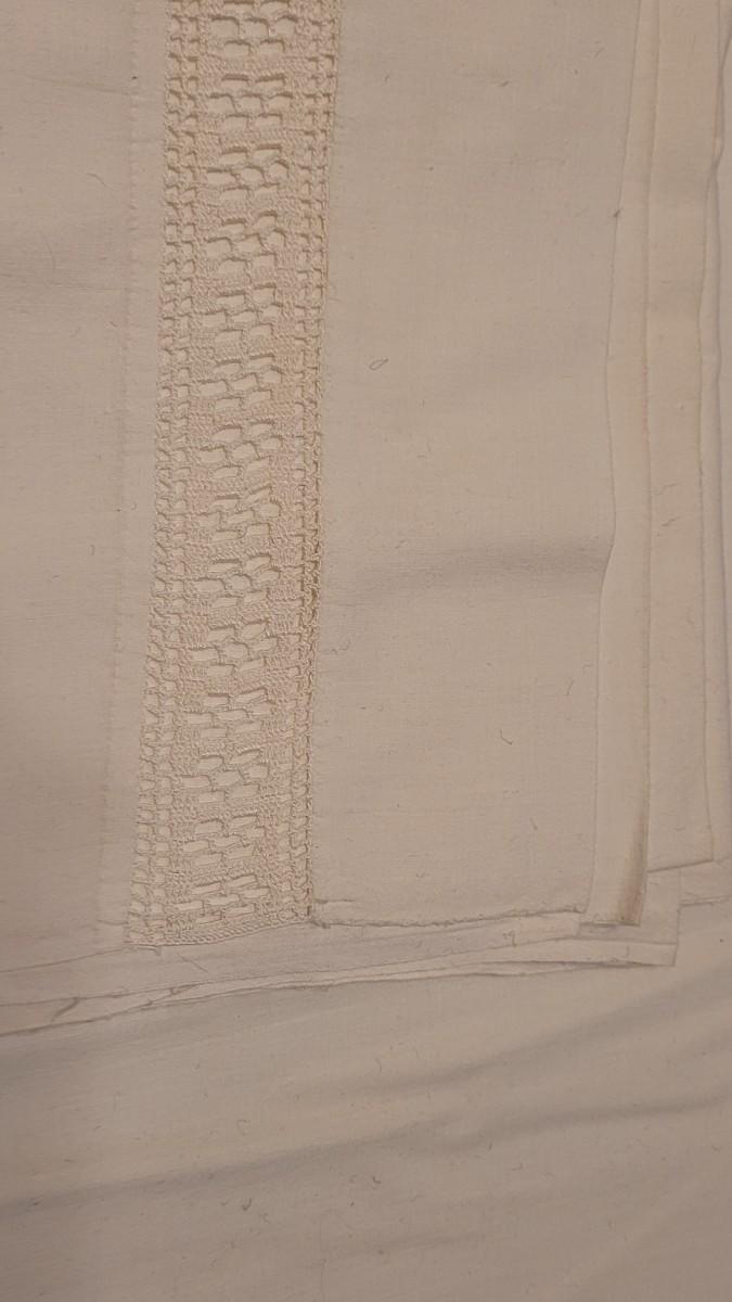 Lot 132: Vintage Handmade Crochet Edge Blue Pillowcases, Eggshell Pillowcases (was tape residue) and (2) White Full Flat Sheet