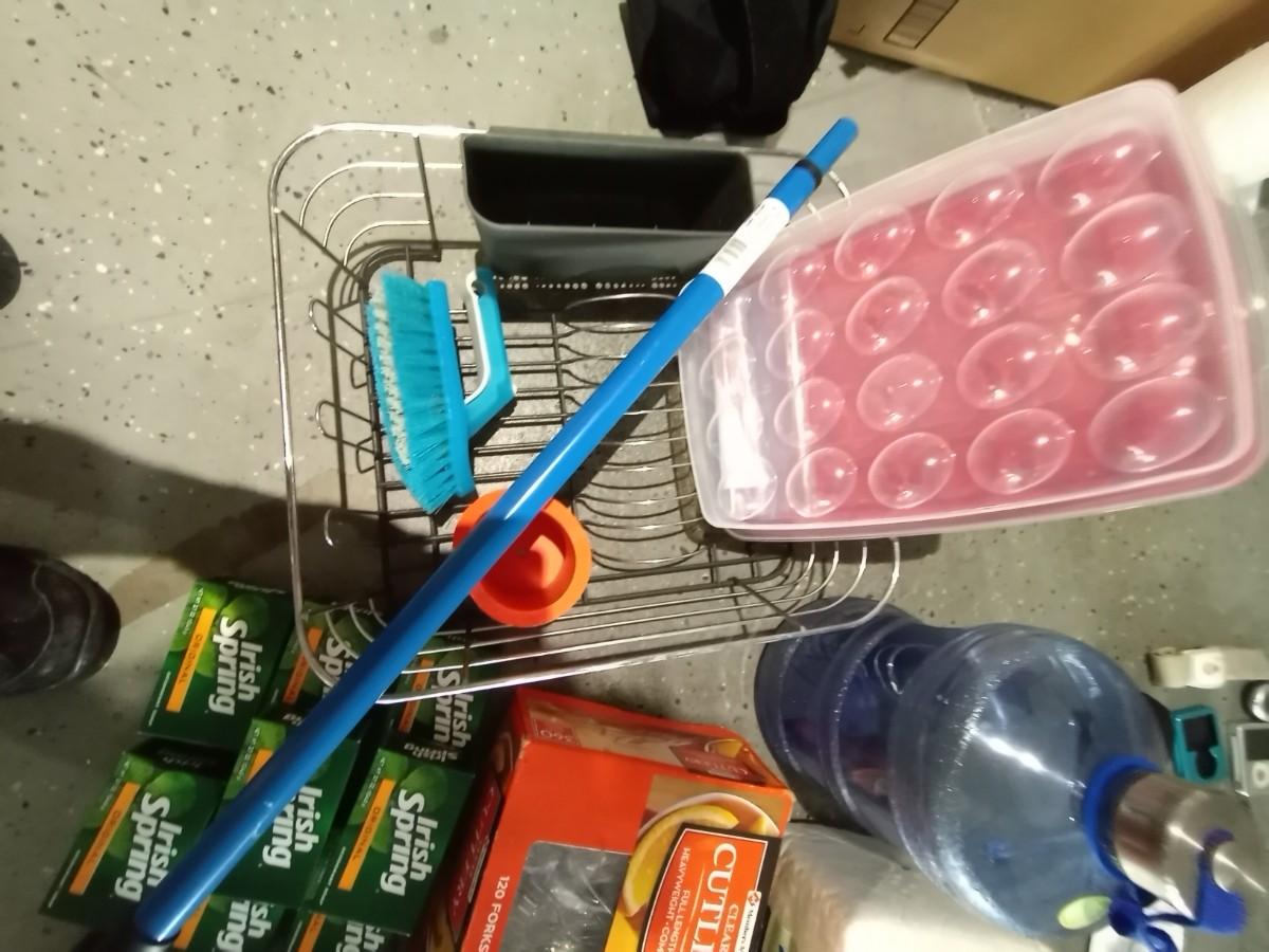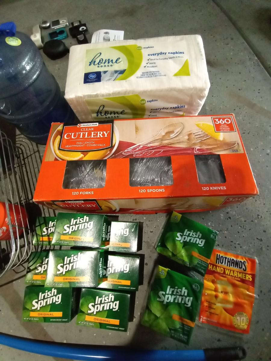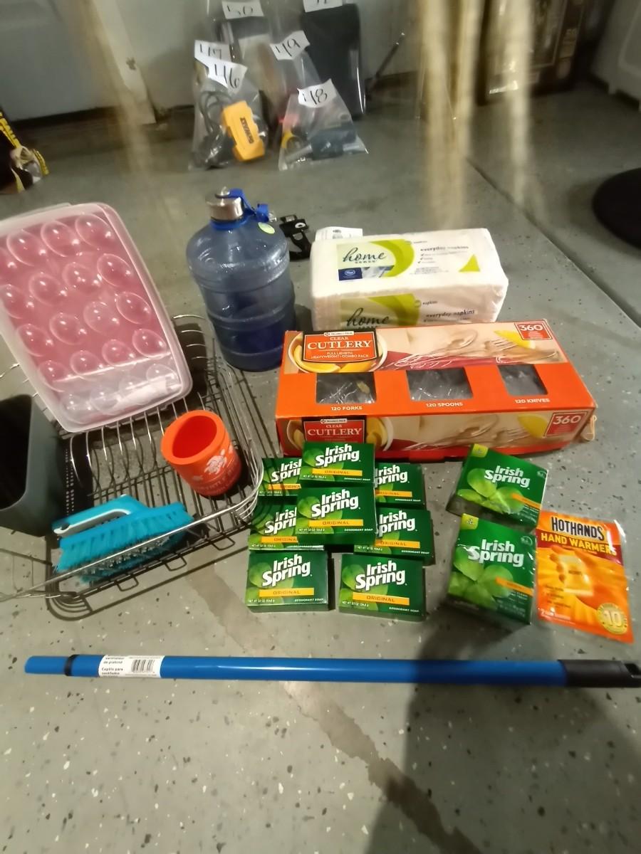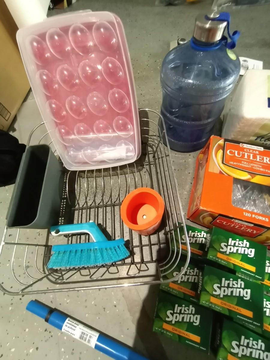 DISH DRYING RACK, DISPOSABLE SILVERWARE, DEVILED EGG STORAGE CONTAINER, 1 GALLON WATER JUG, PAPER NAPKINS, IRISH SPRING BAR SOAP