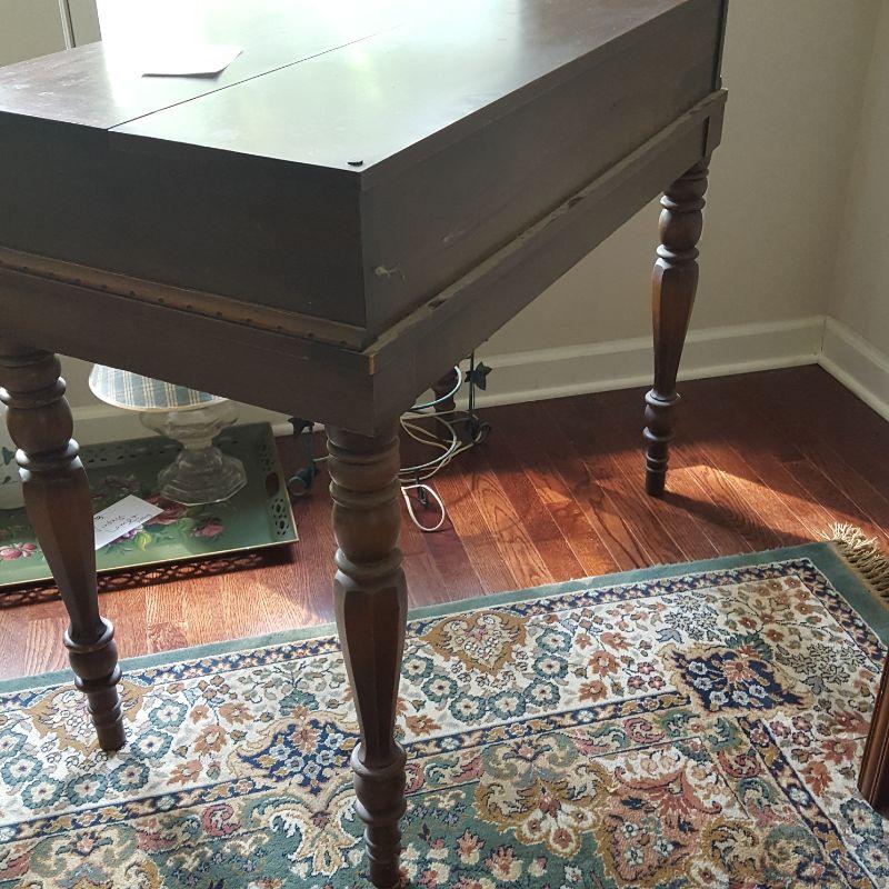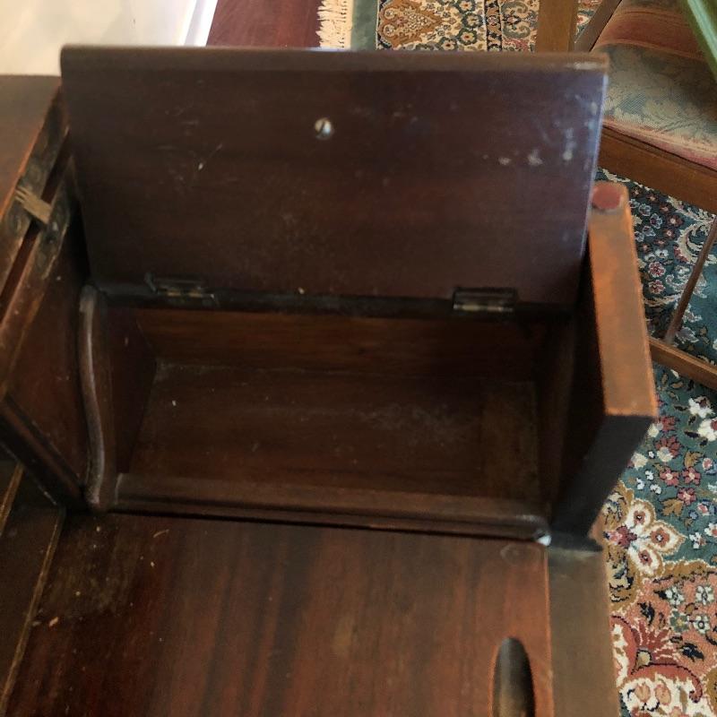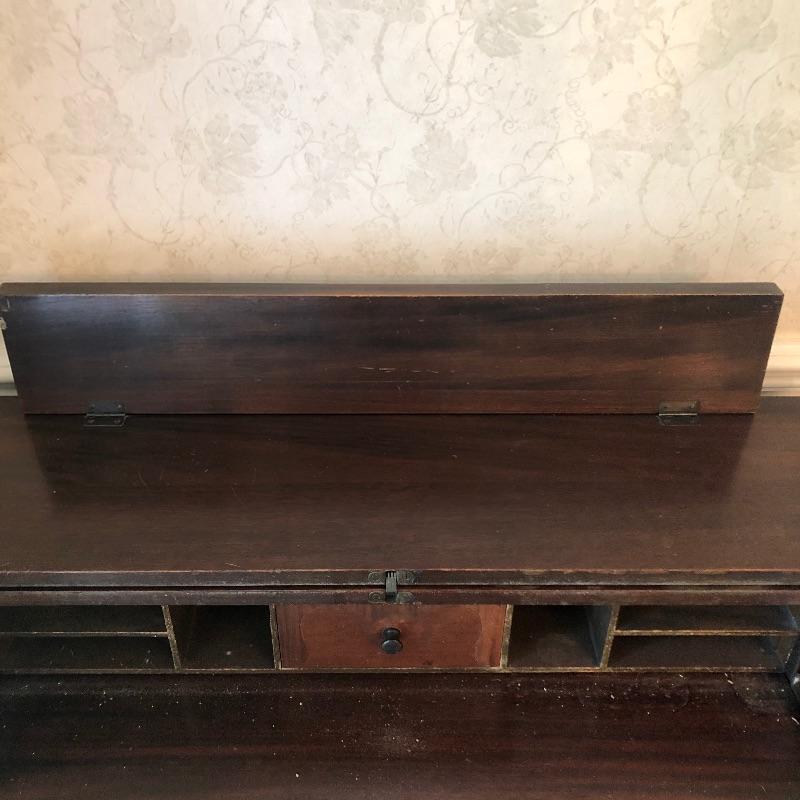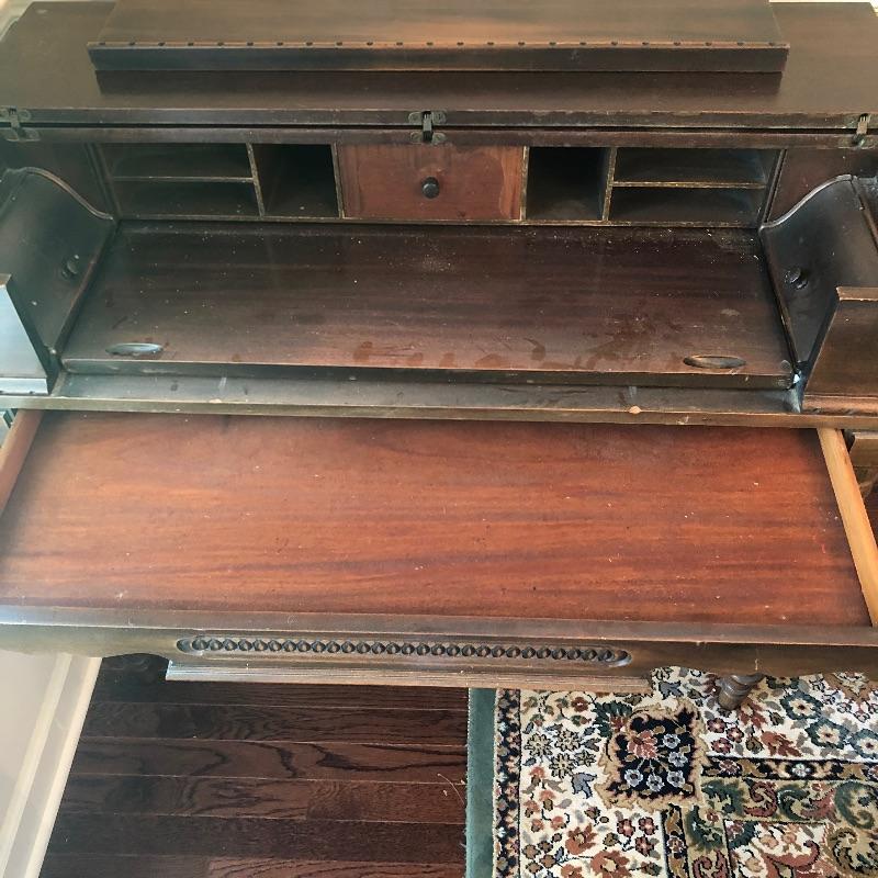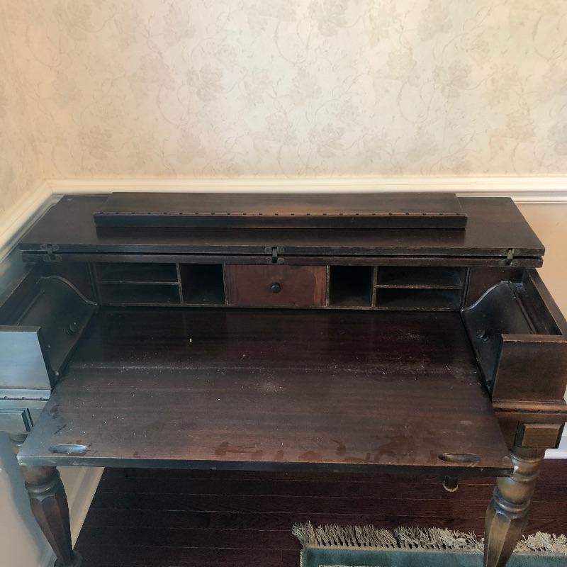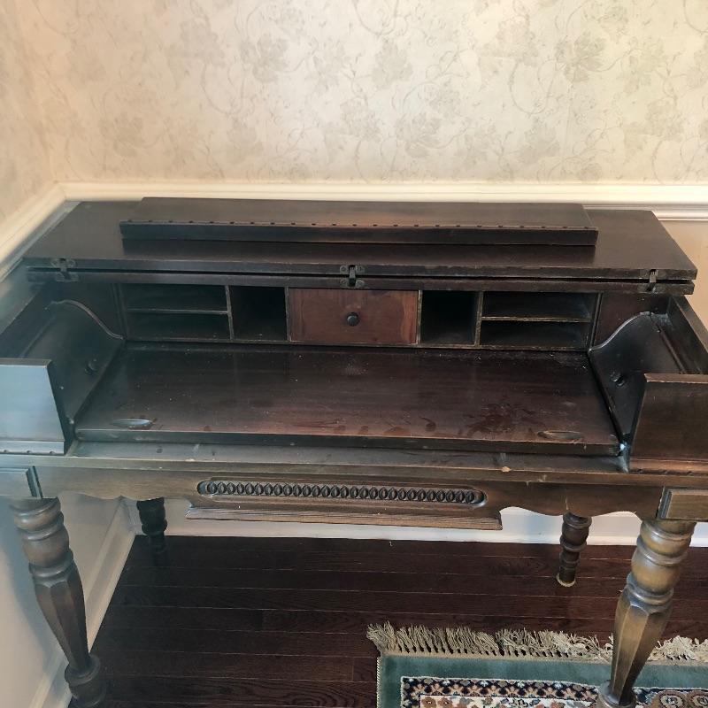 This beautiful H.E. Shaw antique desk (40” x 20” x 33.75”) is a stand out piece of furniture on the outside but wait till you see all that is on offer on the inside! It can be opened up in many different ways and directions. It has several small drawers and shelves as well as two pull-out trays that can be used for many different purposes, and it stands on beautifully carved legs. Local pickup only.