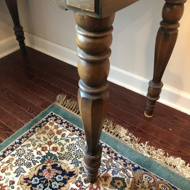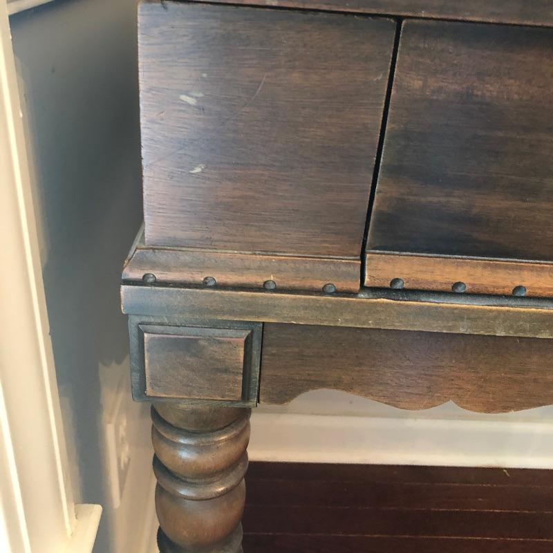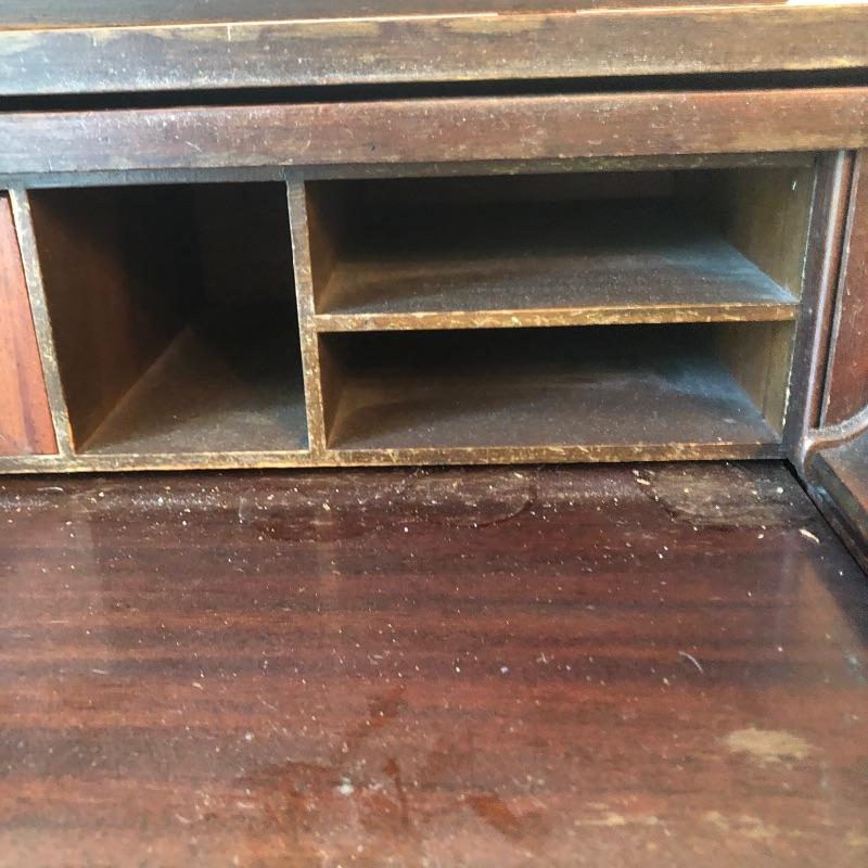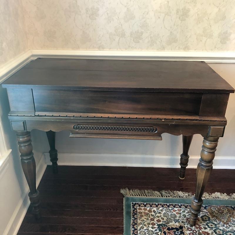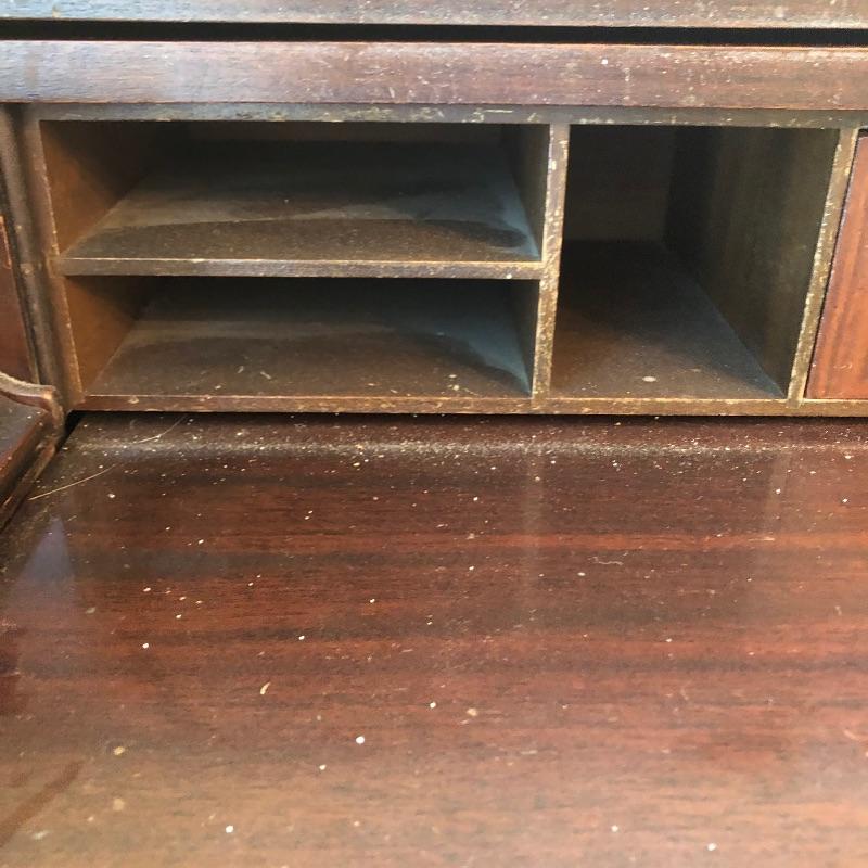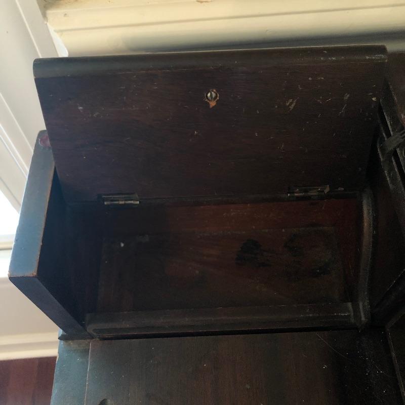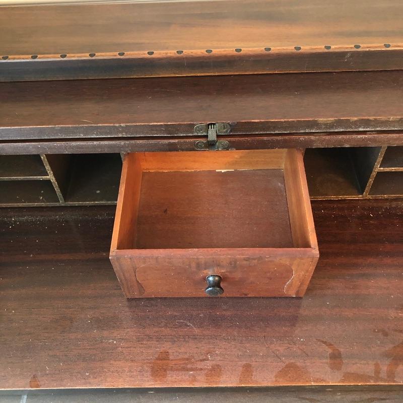 This beautiful H.E. Shaw antique desk (40” x 20” x 33.75”) is a stand out piece of furniture on the outside but wait till you see all that is on offer on the inside! It can be opened up in many different ways and directions. It has several small drawers and shelves as well as two pull-out trays that can be used for many different purposes, and it stands on beautifully carved legs. Local pickup only.