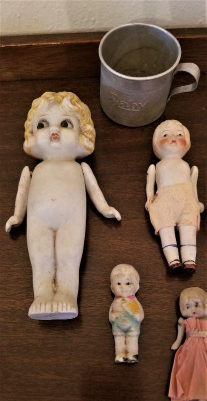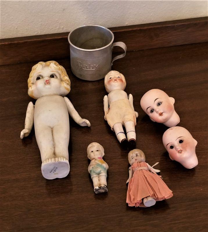Vintage toy lot here - two antique bisque doll heads, several "Frozen Charlotte" style china dolls and a vintage aluminum "Baby" cup. You get all you see here. For scale, the larges doll is 7" tall.