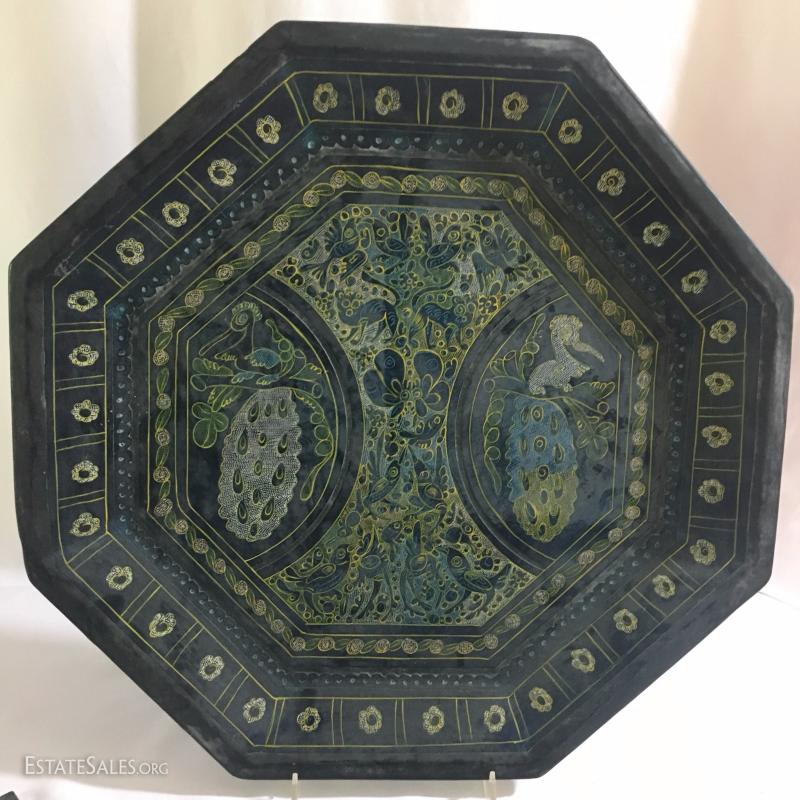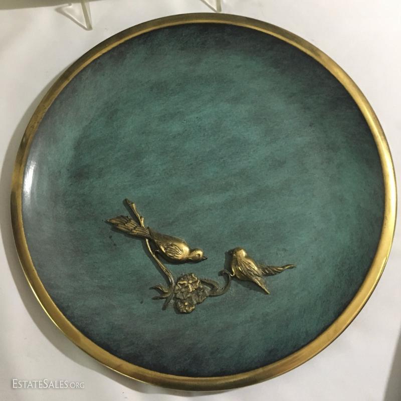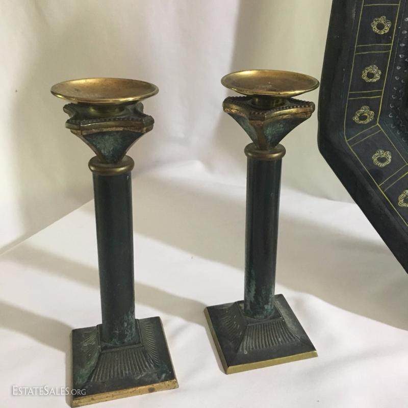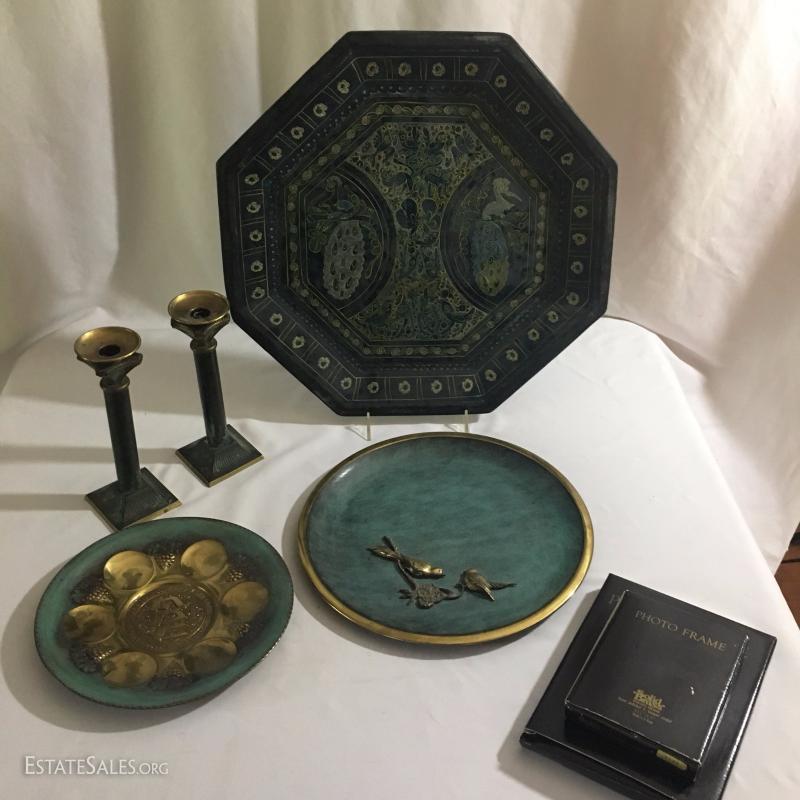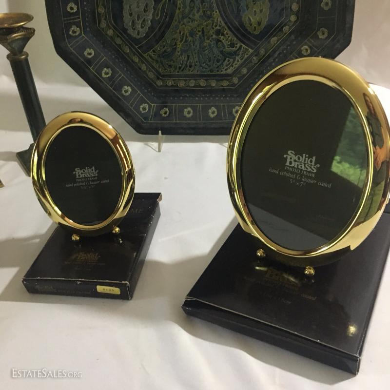 Large dark painted wood platter is 17.5"diameter. Includes two brass frames in boxes and more. See pictures Candlesticks are 8.5" high.