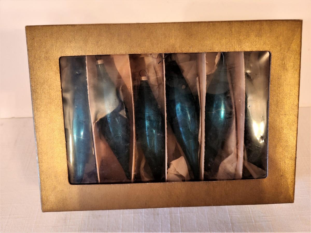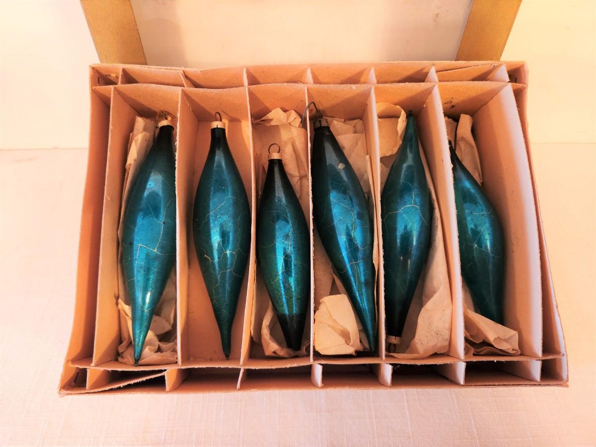 Nice box of 6 matching teal-colored glass Christmas ornaments - all vintage, each about 6.75" tall.