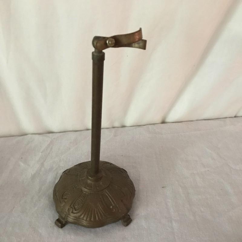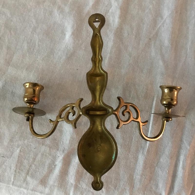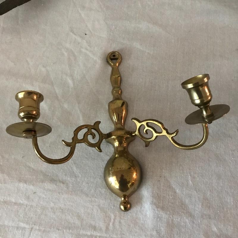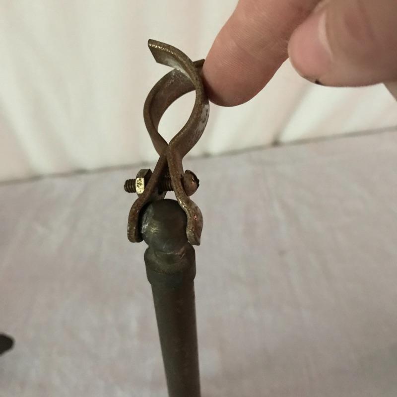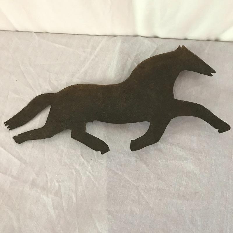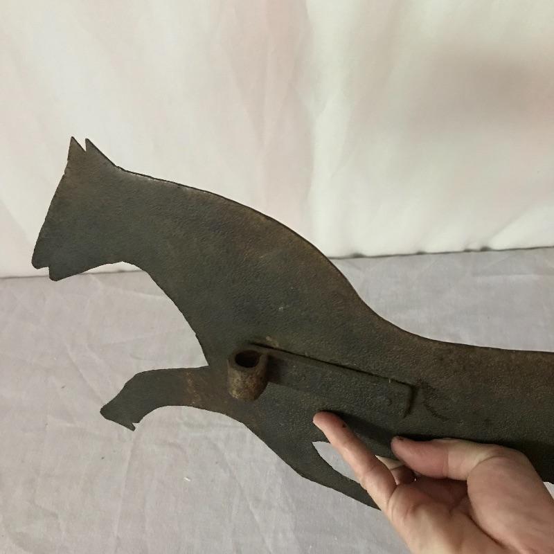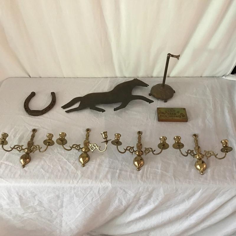 Four matching brass candle wall sconces. One has aloose arm and one is bent but they should be repairable. These each measure 12” x 9.5”x 4”. Collection also includes a large horse shoe, a metal horse silhouette that may have come from a windmill and measures 20.5” x 12”. A cute metal sign from a Chicago Fish market mounted on wood and a stand that is possibly for a lamp. The stand measures 10” tall and has a clamp on a rotating ball. Shipping available.