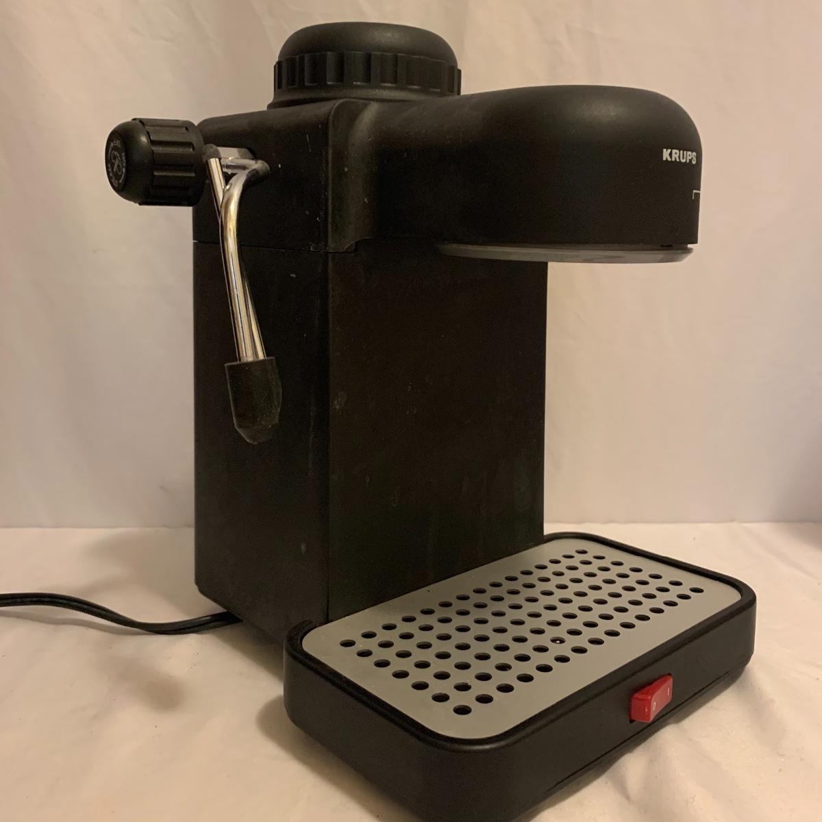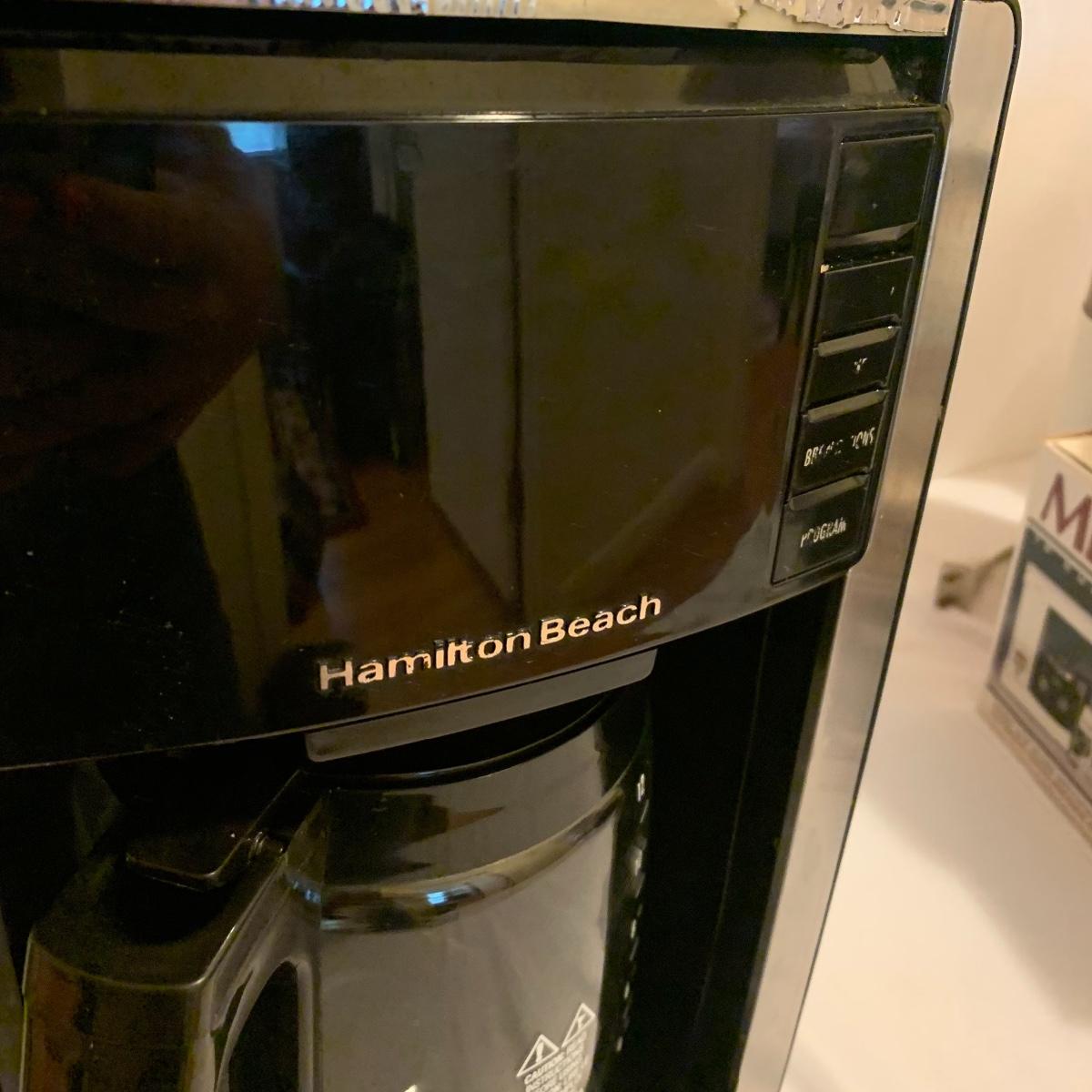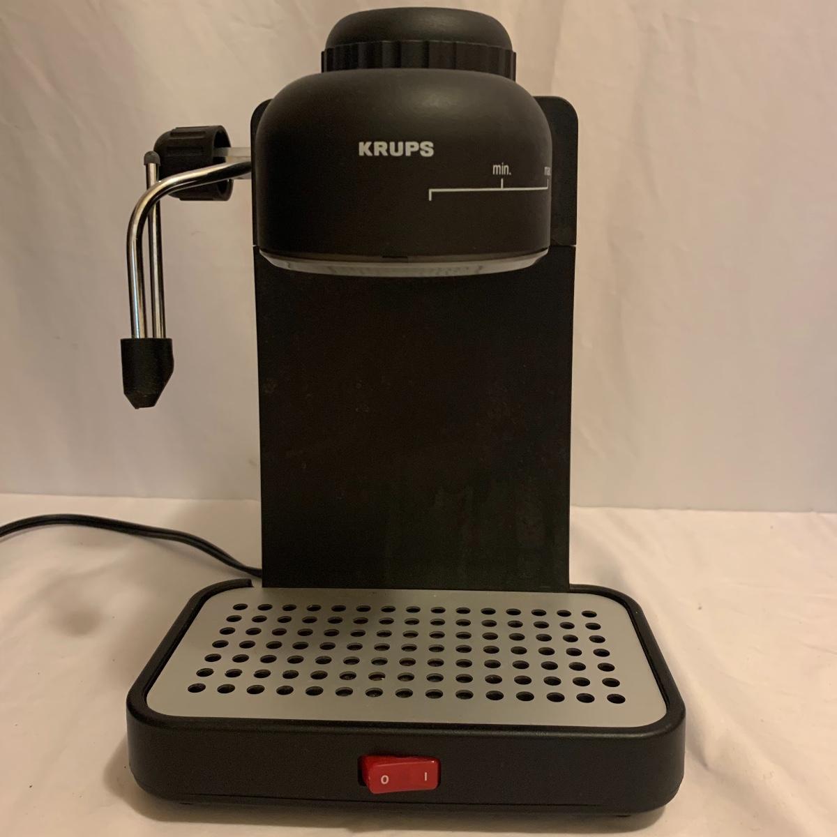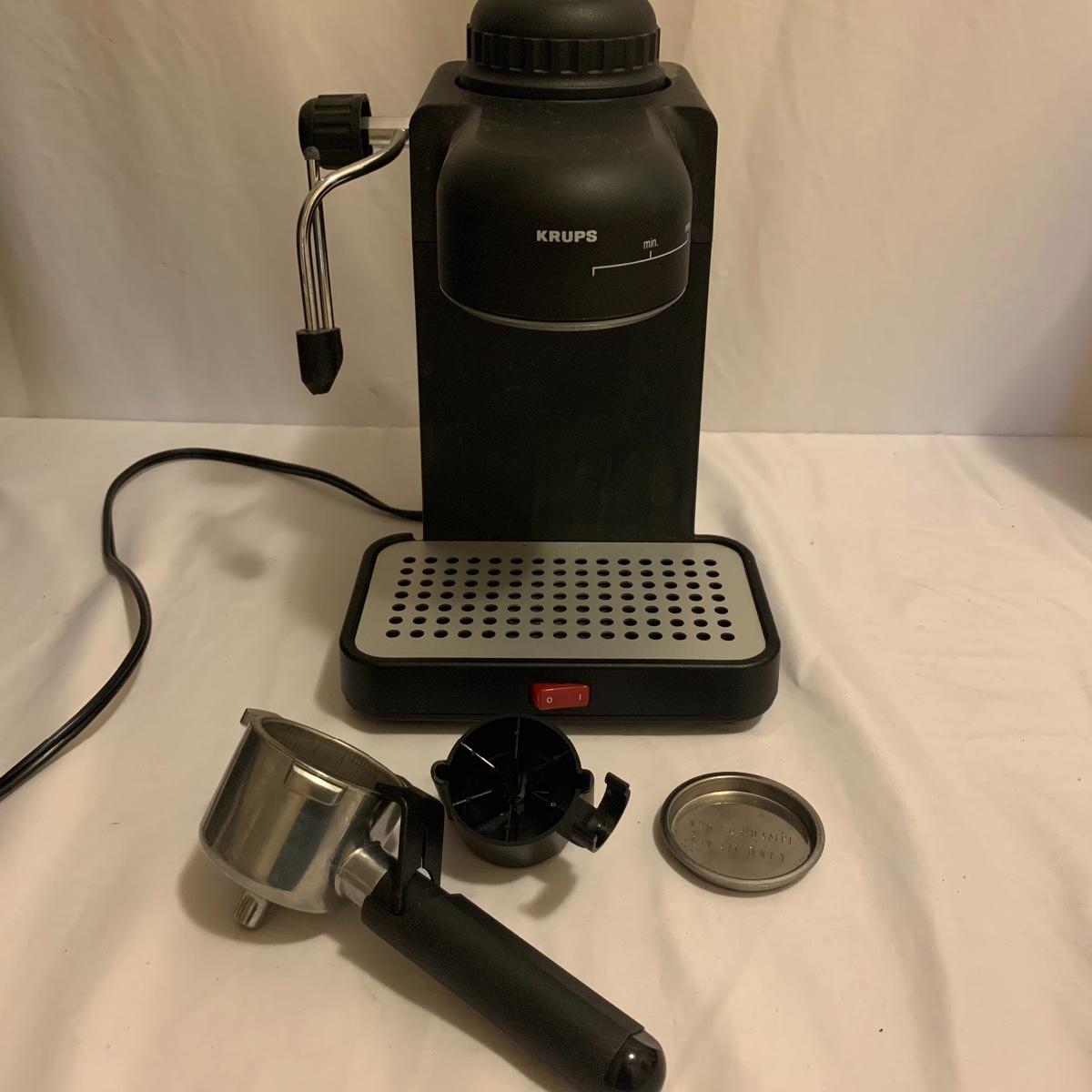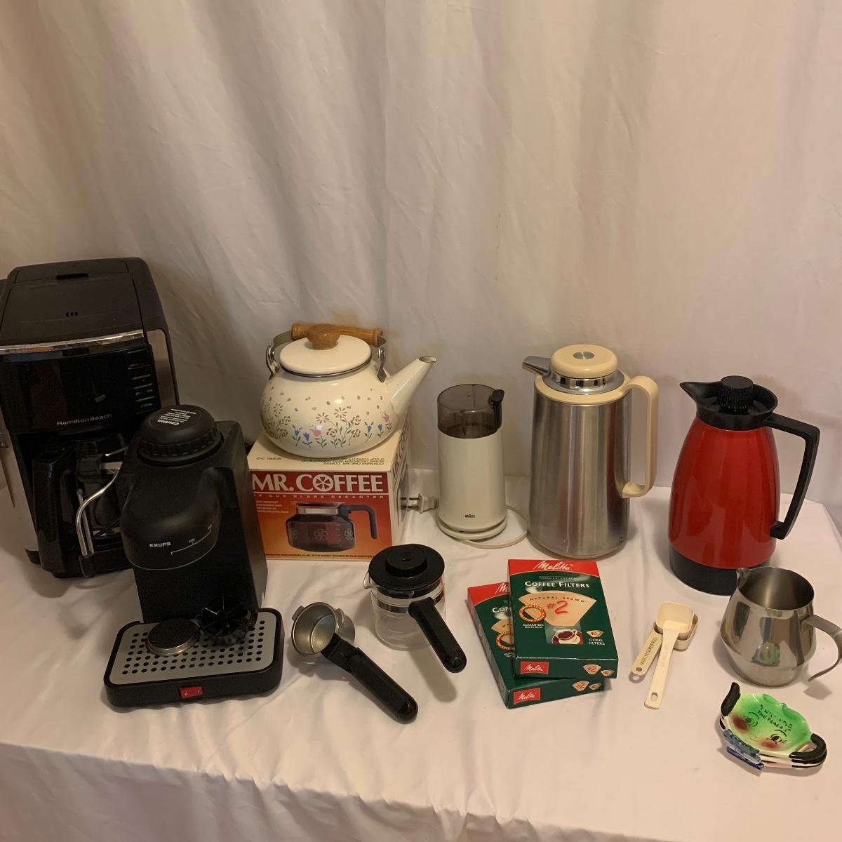 This lot includes a Hamilton Beach Coffee maker and coffee pot, a Mr.Coffee coffee pot, a Krups Espresso maker, a coffee mill, a stove top tea pot, coffee thermos, and more. The coffee mill is a little dirty but can be easily cleaned. Cannot confirm that everything works when plugged in. The labels on the buttons of the coffee maker are worn off (see photos). The largest item (coffee maker) measures about 11in x 9.5in x 13.5in. All electric items powered on when tested.