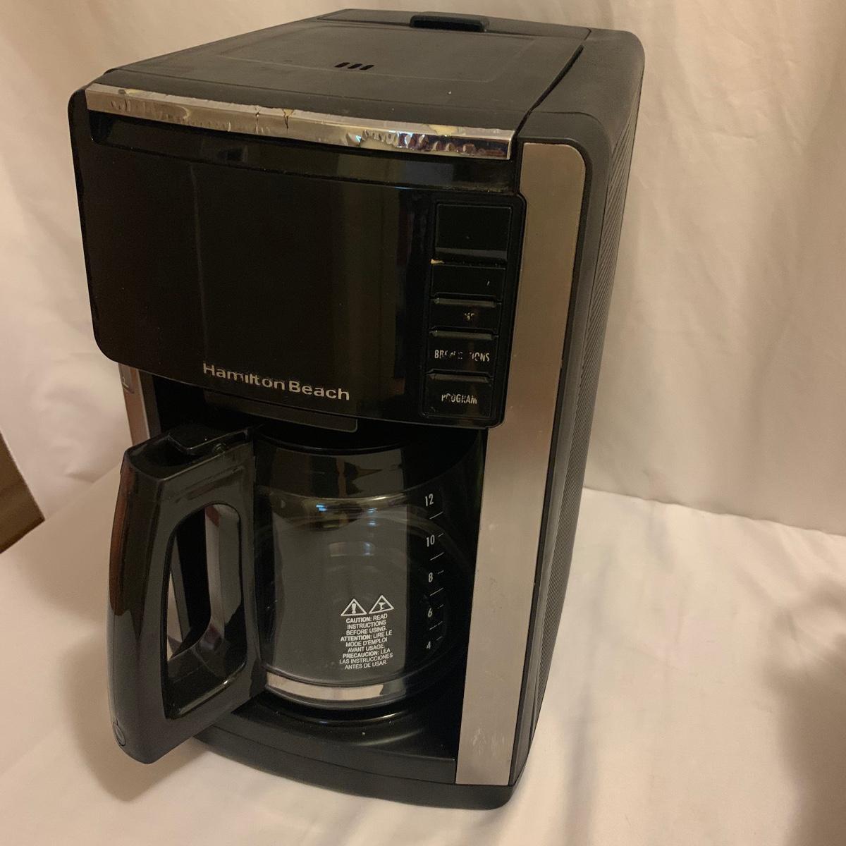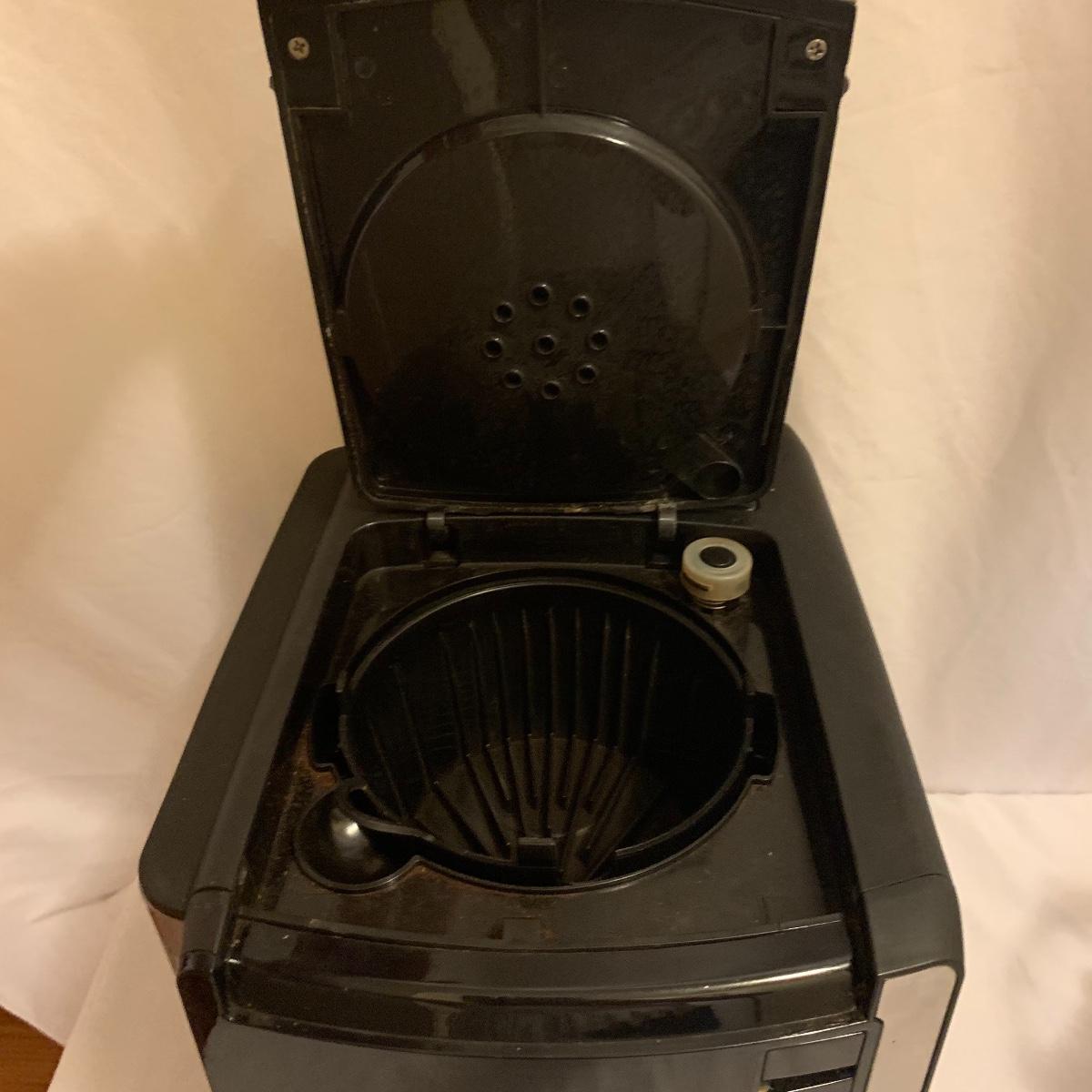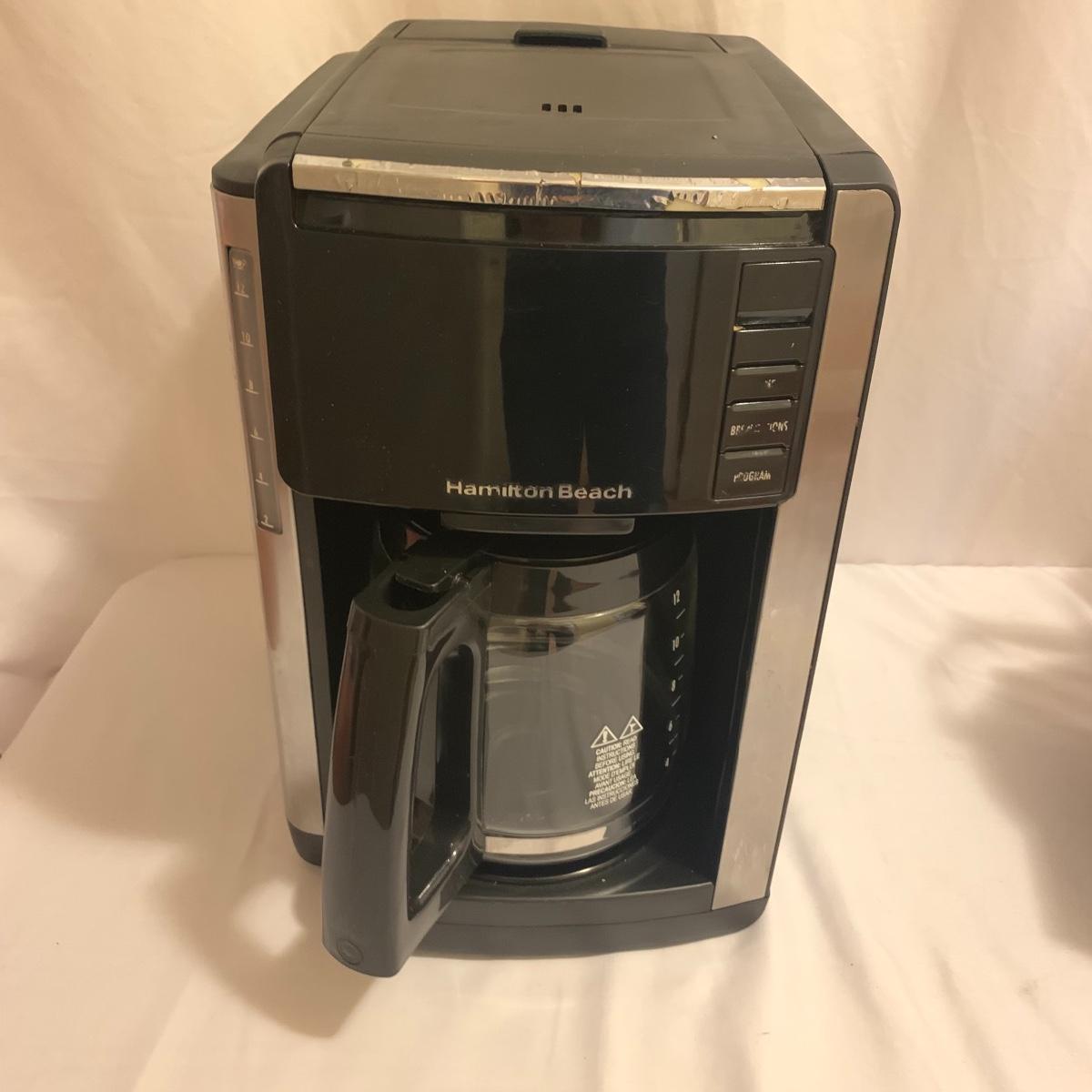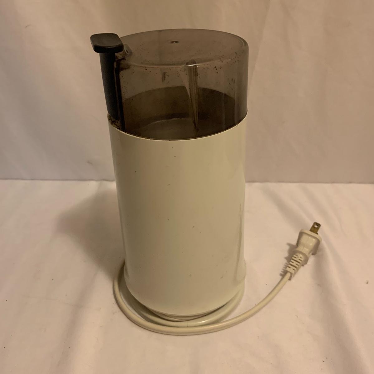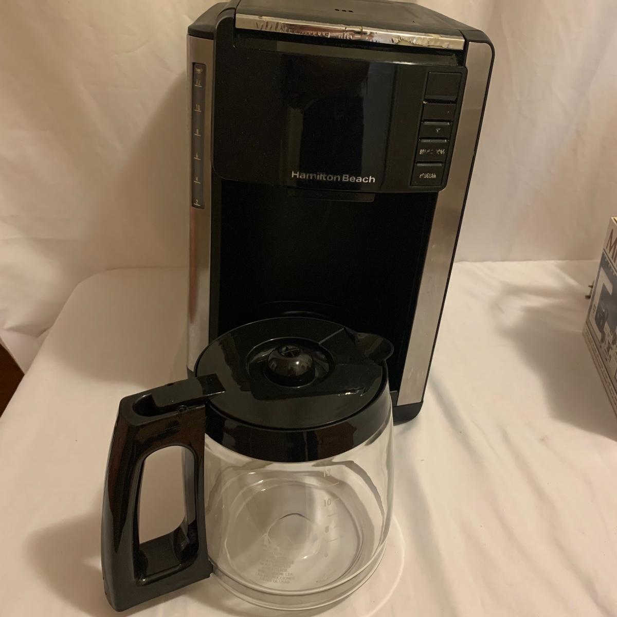 This lot includes a Hamilton Beach Coffee maker and coffee pot, a Mr.Coffee coffee pot, a Krups Espresso maker, a coffee mill, a stove top tea pot, coffee thermos, and more. The coffee mill is a little dirty but can be easily cleaned. Cannot confirm that everything works when plugged in. The labels on the buttons of the coffee maker are worn off (see photos). The largest item (coffee maker) measures about 11in x 9.5in x 13.5in. All electric items powered on when tested.