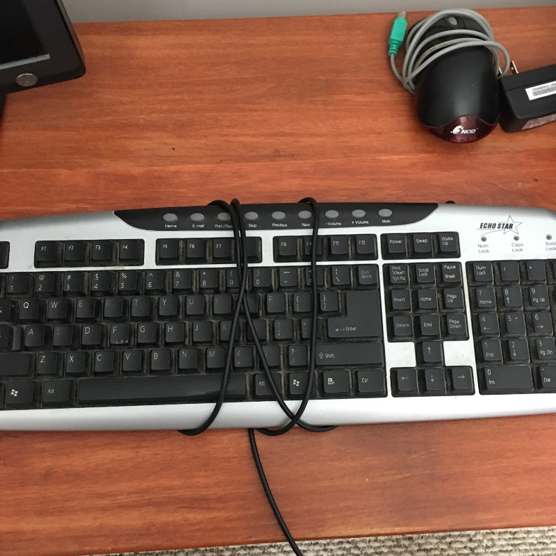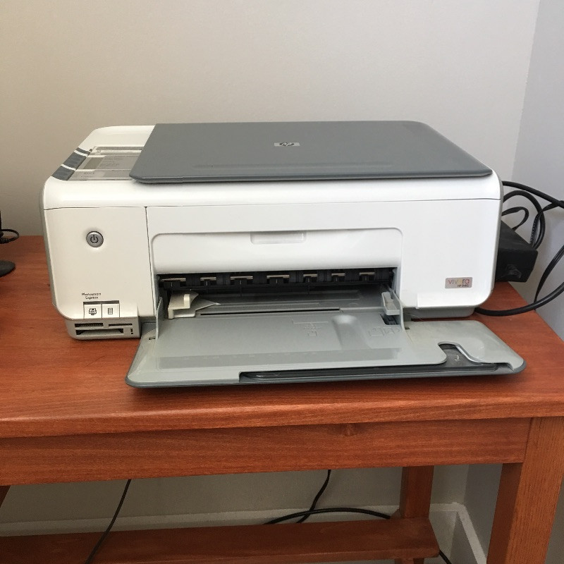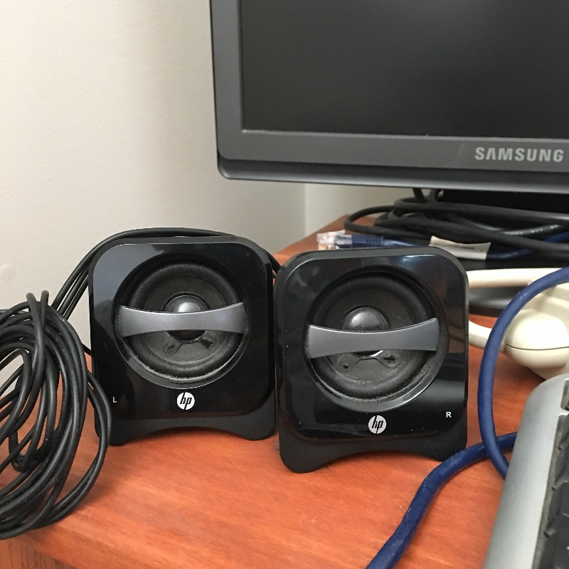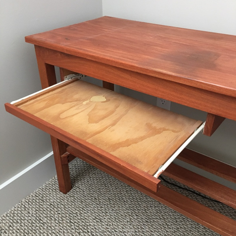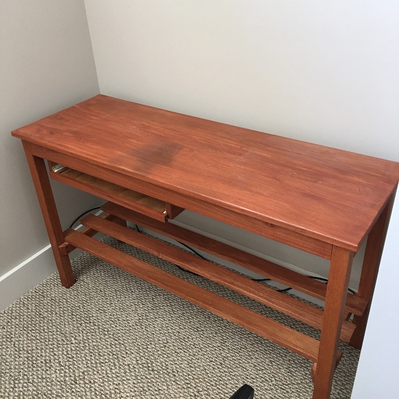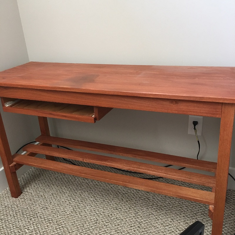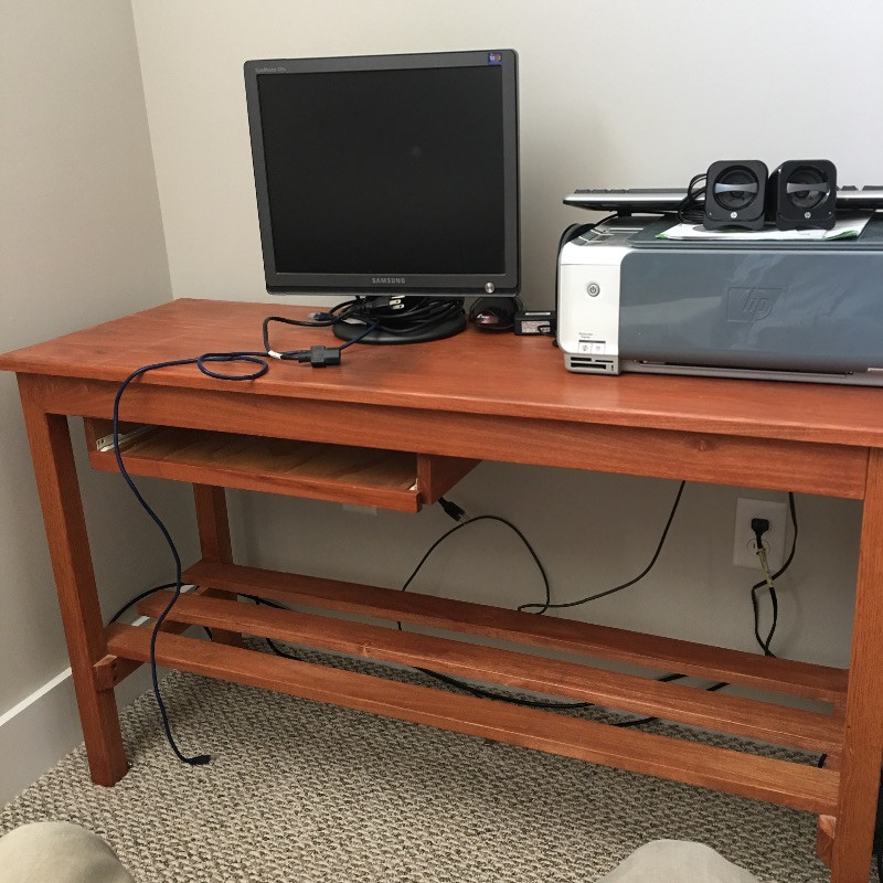 This handsome and useful desk comes with keyboard drawer and also includes computer peripherals. Includes HP C3135 printer, HP speakers, Samsung 17” monitor, Belkin Router and a mouse and keyboard. A great desk when space is at a premium. Desk measures 17” x 48” x 28.5”.