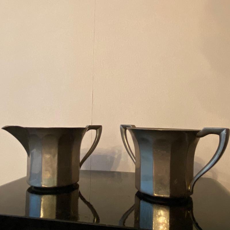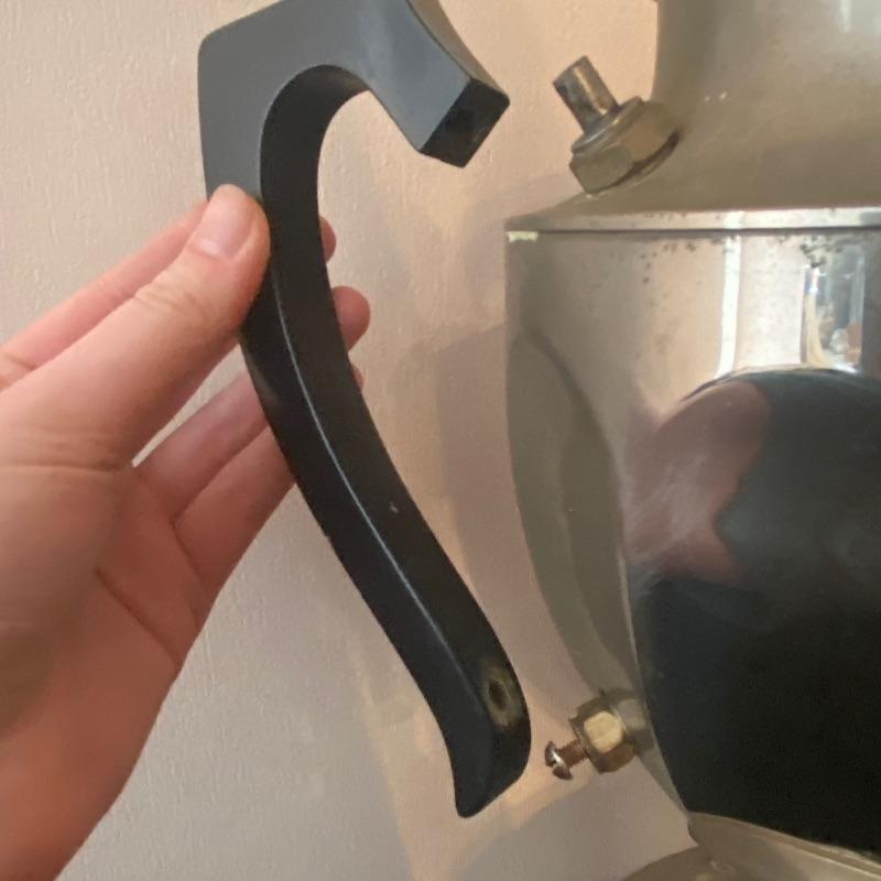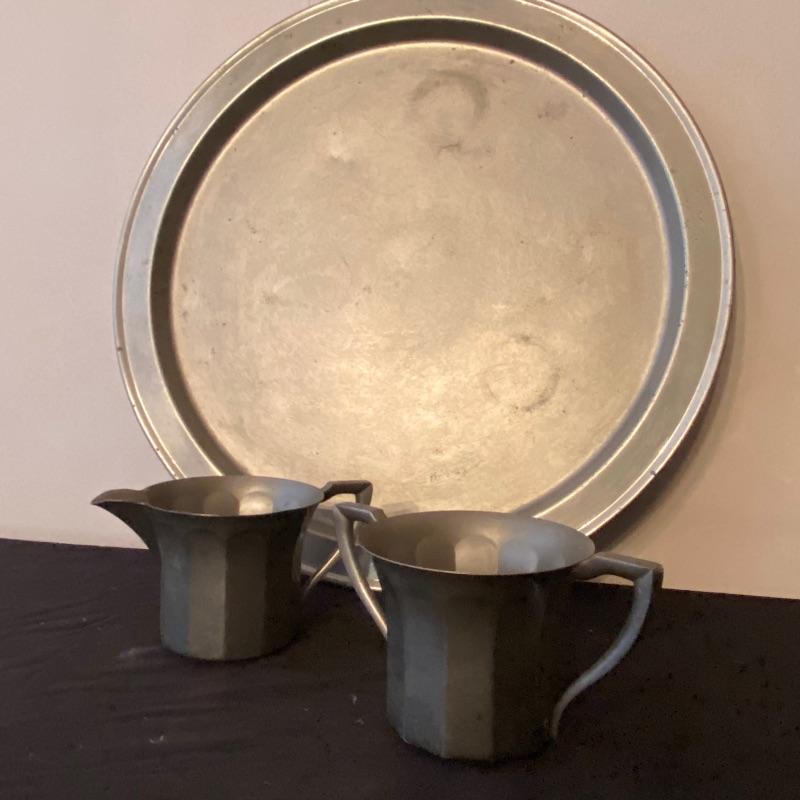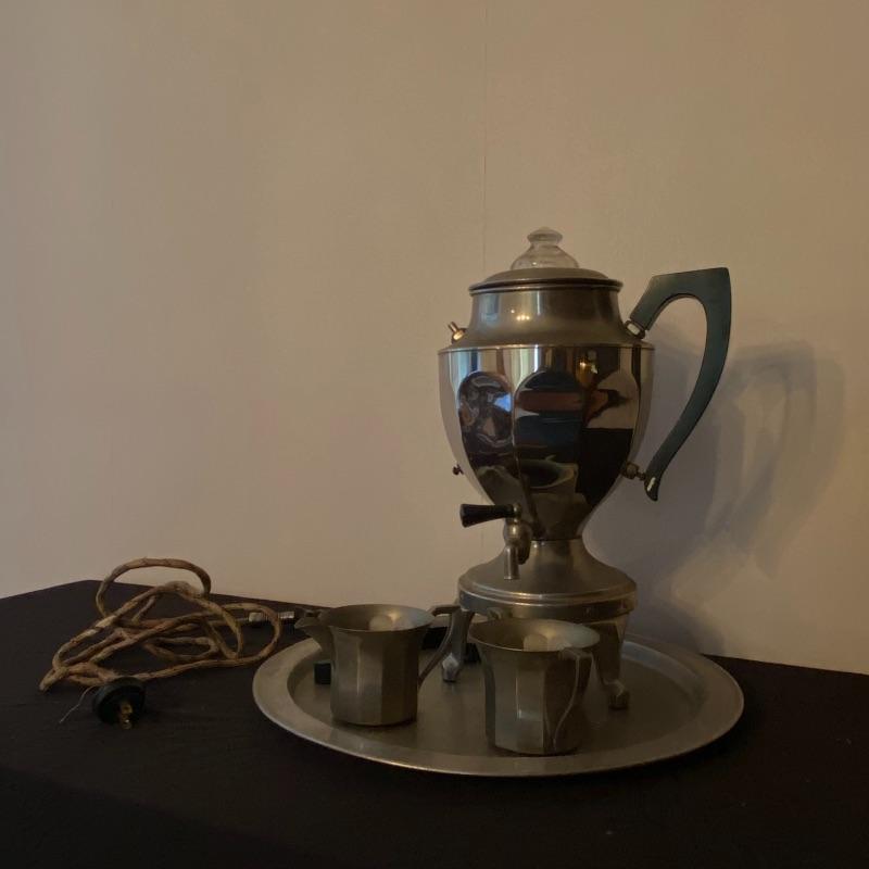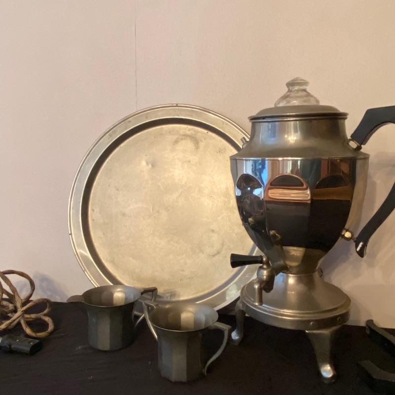 Charming percolator paired with cream and sugar cups will keep your coffee and heart warm! Lot includes vintage Edison Hotpoint percolator with cord, cream and sugar cups, and a nice 14” pewter tray. One handle is currently unattached, but seems to be an easy fix with a flathead screwdriver, see photos. Cord is also fraying, percolator turned on when tested, but piece made an electrical zapping sound and heating coil smoked a bit. Percolator should not be used for intended purpose until accessed by repair person. Luckily, the Percolator is fun as decor, stands 14 inches high. Shipping Available