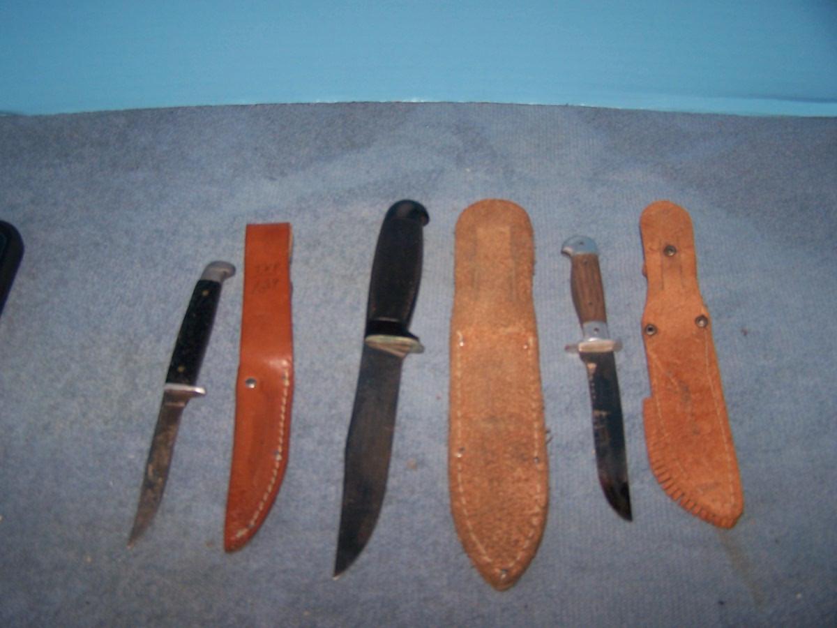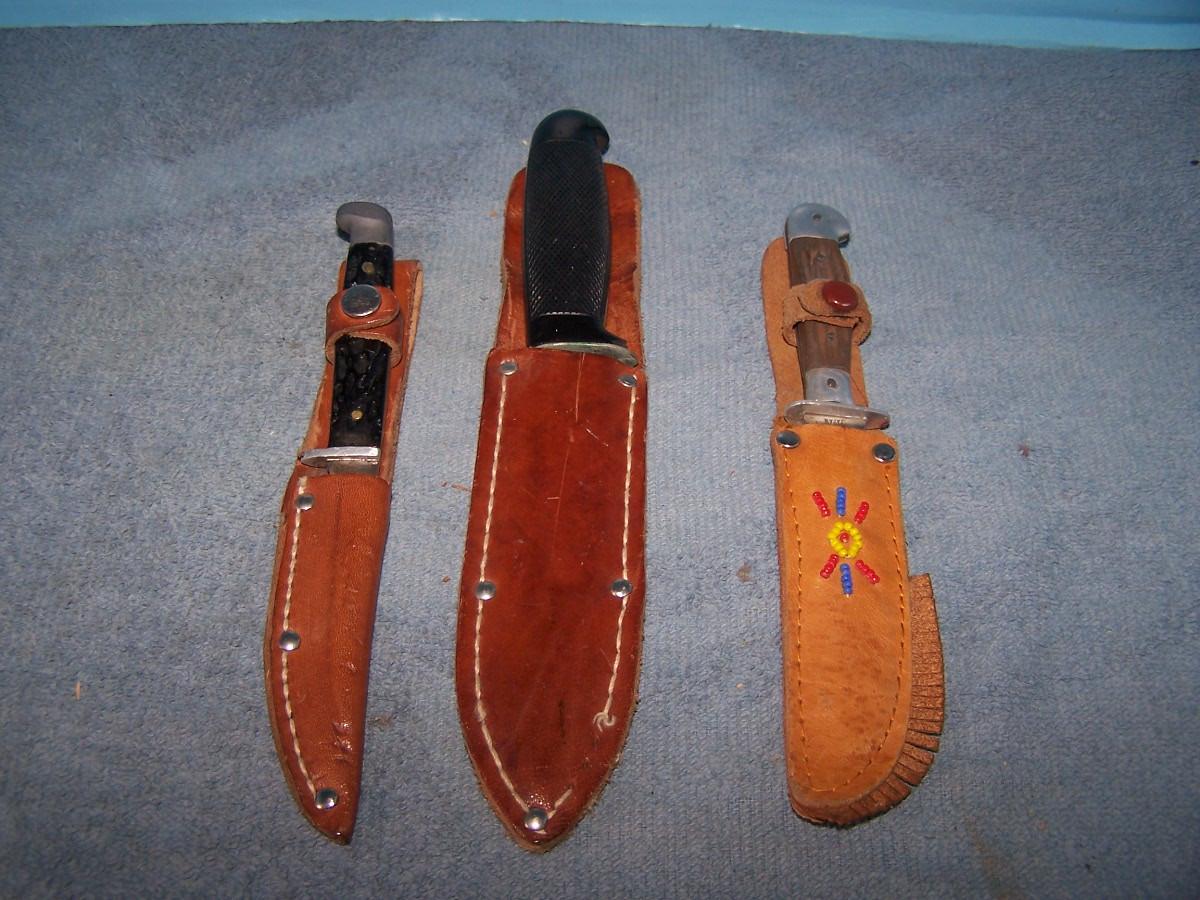 THESE ARE GREAT VINTAGE SHEATH KNIVES.. LARGE KNIFE IS 8 1/4 INCHES. ONE HAS A CHIPPED HANDLE. LIGHT WEAR...