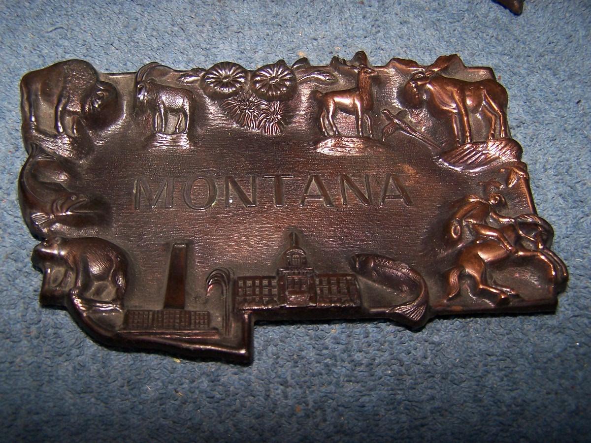 THESE ARE GREAT VINTAGE USA SOUVENIRS!!! MONTANA METAL TRAY IS 6 1/4'' LONG... LIGHT WEAR...