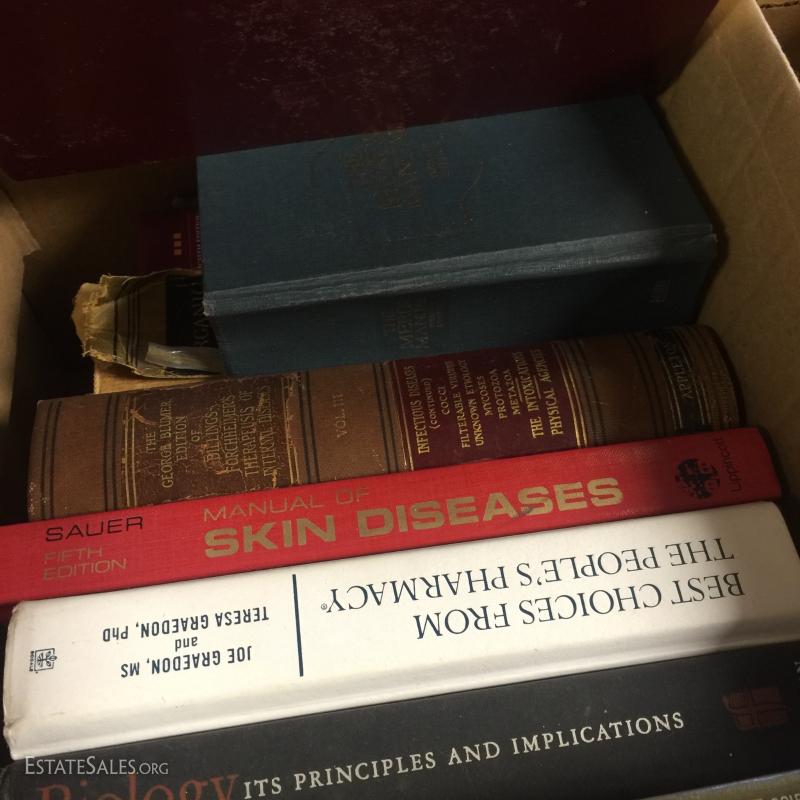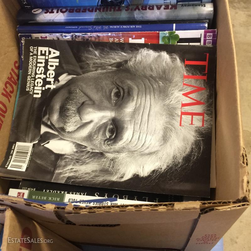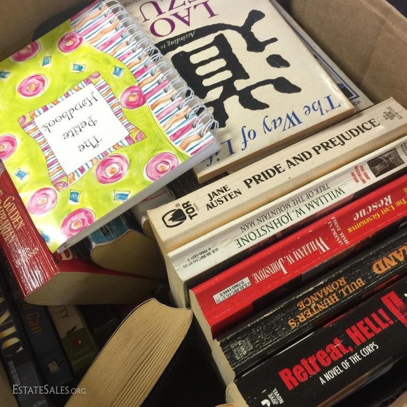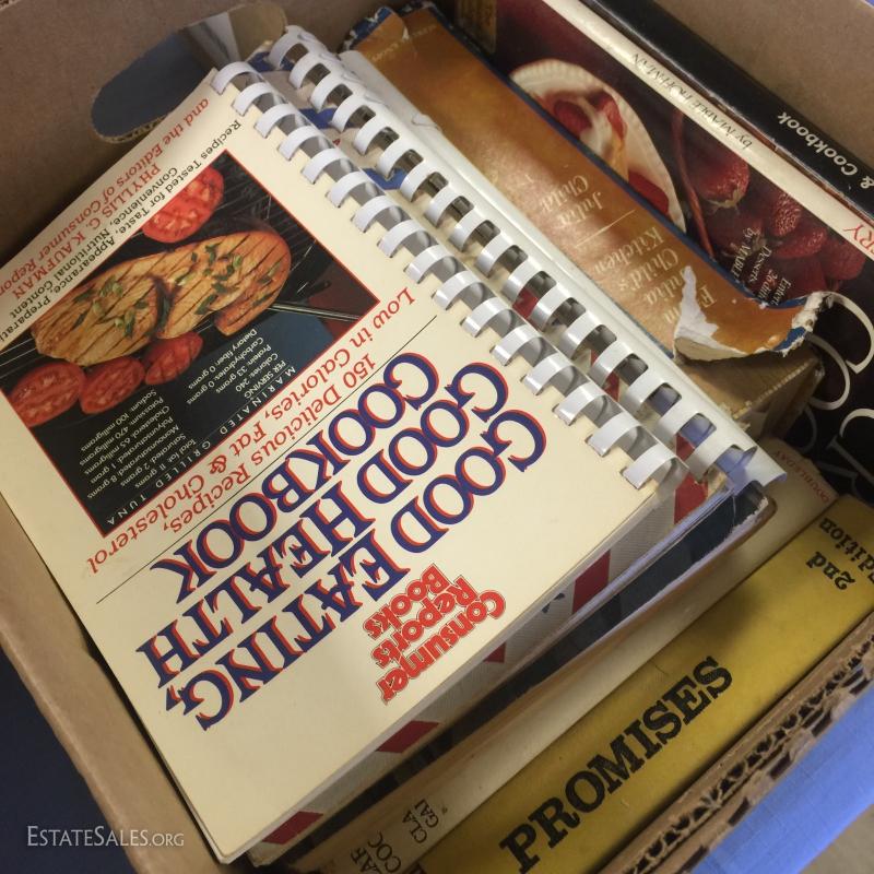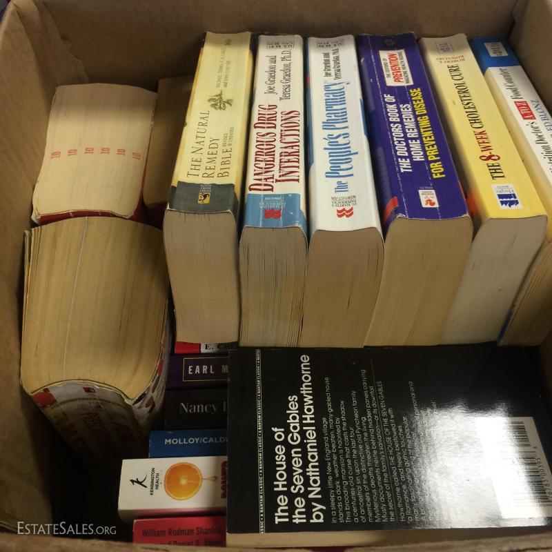 Hardcover and paperback books, cook books and more. Lot contained in 7 '4 gallon milk boxes'. See photos for details. Newer Titles