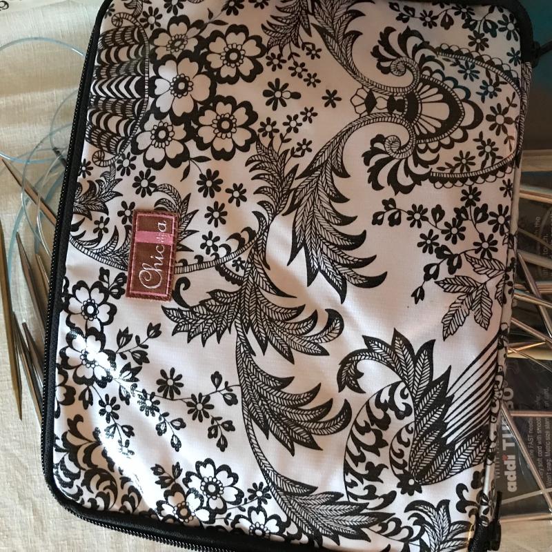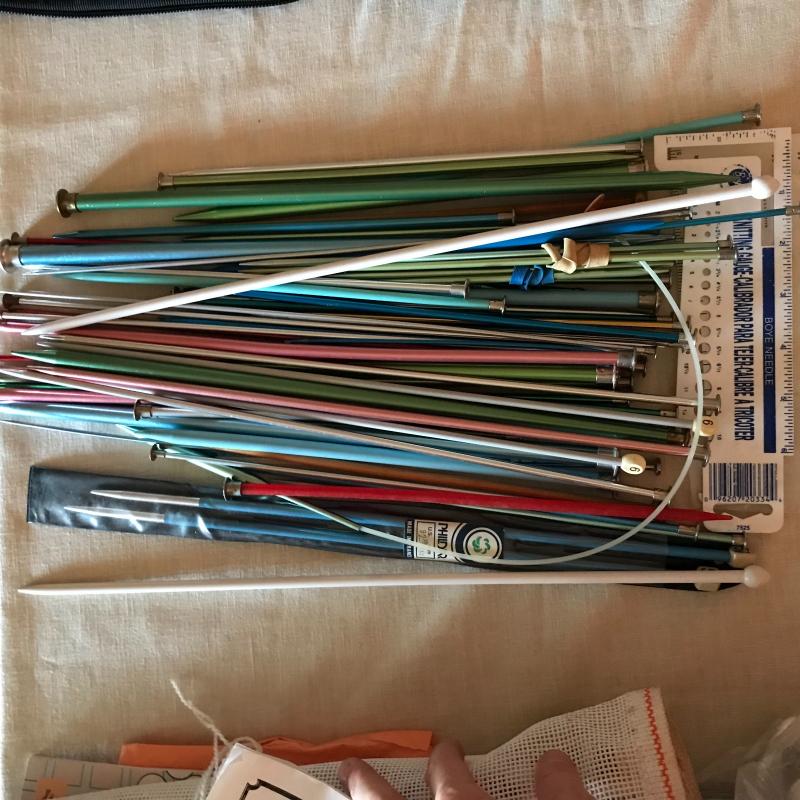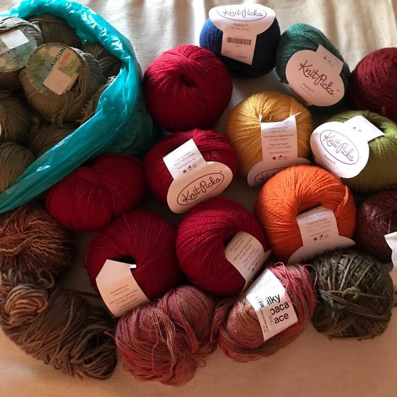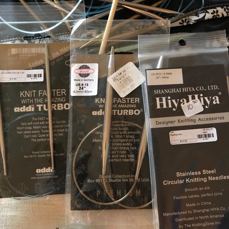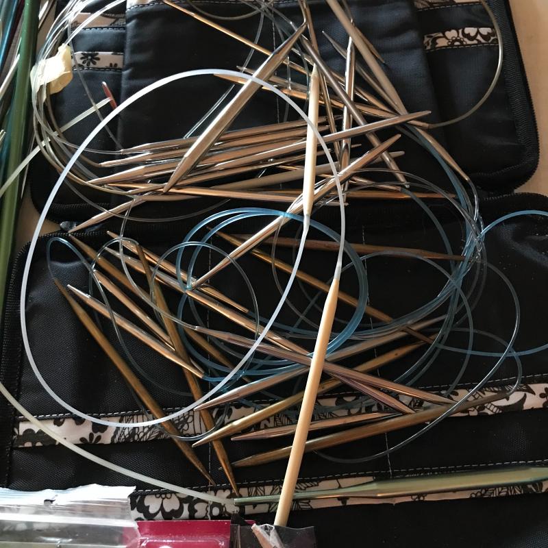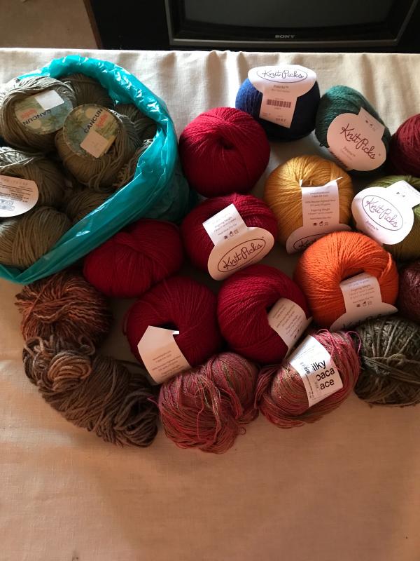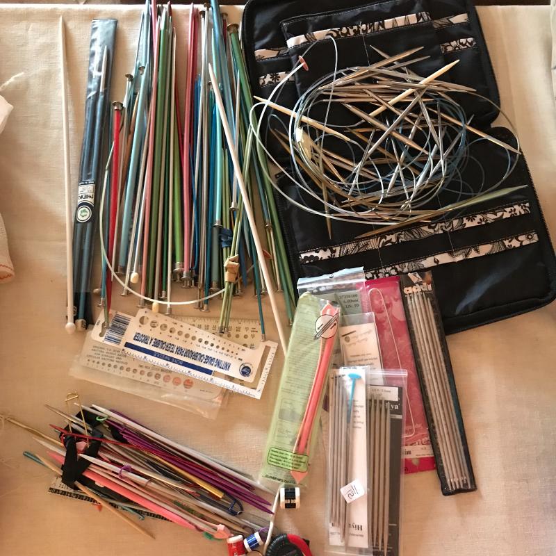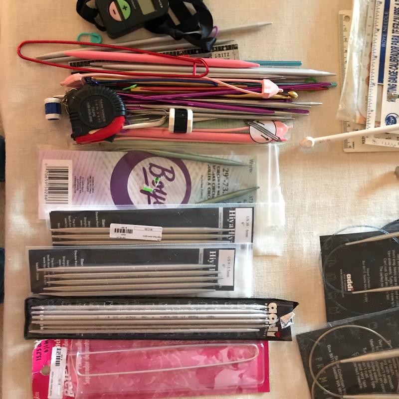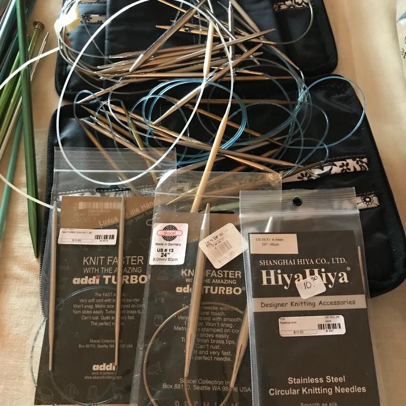 This lot is perfect for experienced knitters with an appreciation for high-quality natural yarns, and those looking to expand their knitting needle collection. Includes many colors of Knit Picks fingerling weight, Cancun Katia, Elizabeth Lavlold silky wool, Silky Alpaca lace weight and more. Lot also includes many knitting needles including straights, double points, and circular needles of many sizes. Includes Addi Turbos, needle case, row counter, patterns, and needle gauge.