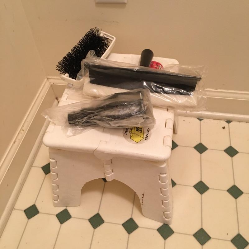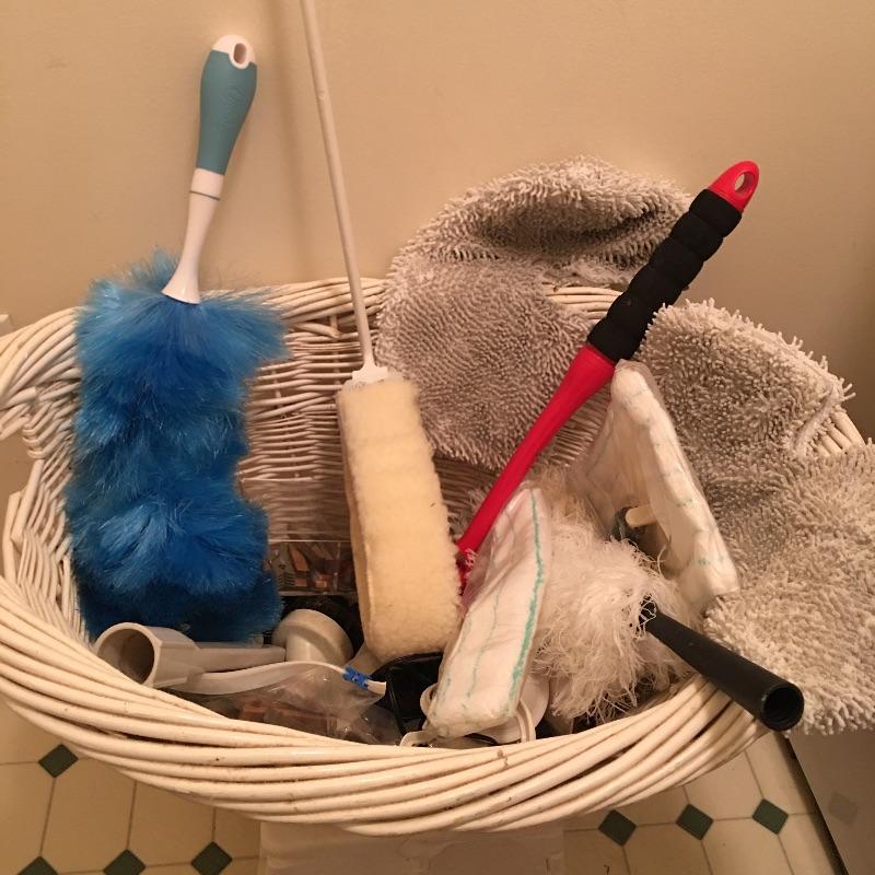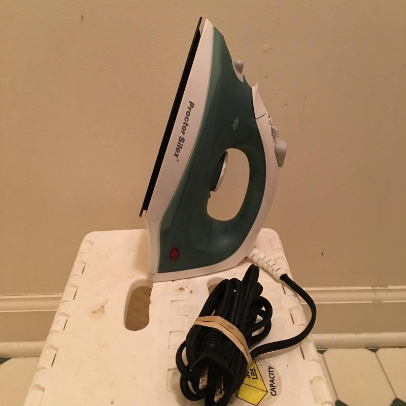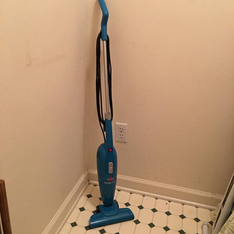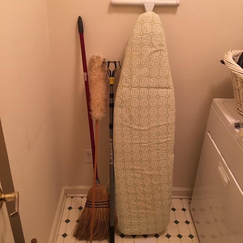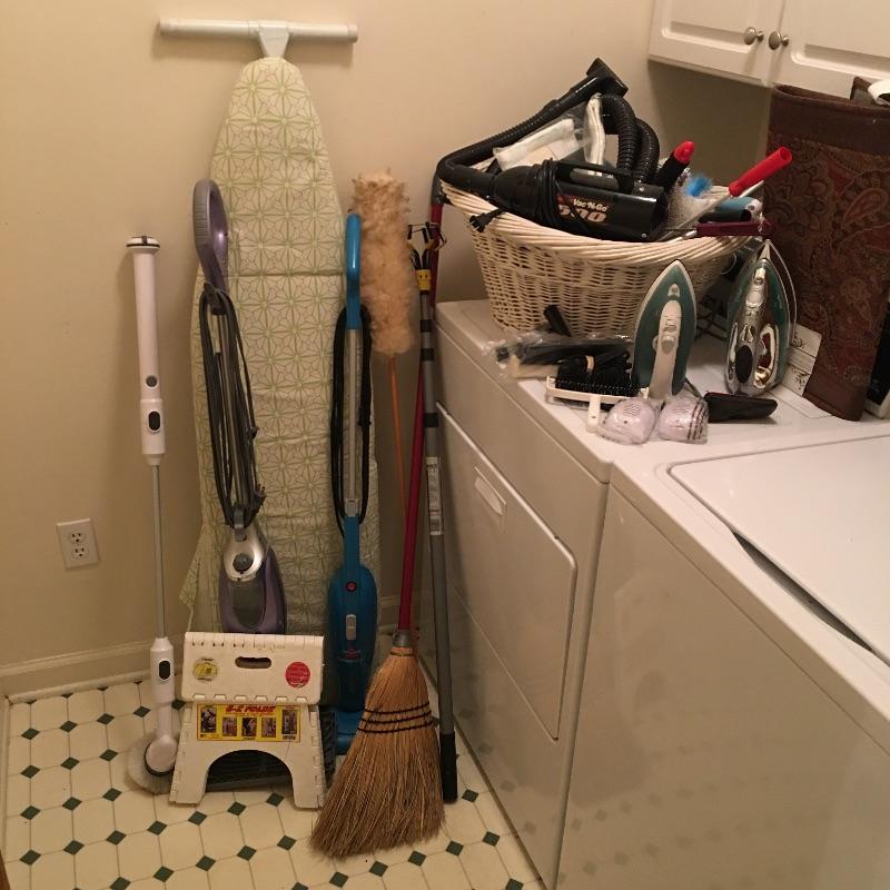 This is an household lot every homeowner or tenant needs. Lot includes Metro 500 vacuum, ironing board, Shark Euro-Pro and Proctor Silex iron, Bissell Featherweight vacuum, Shark XL steam mop, broom, extending pole with attachments, paisley bath mat, dusters, white wicker hamper basket and more. All electronics powered on when tested.