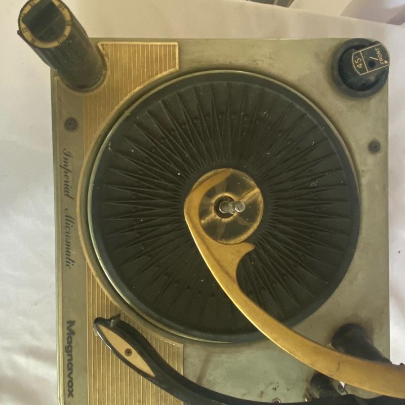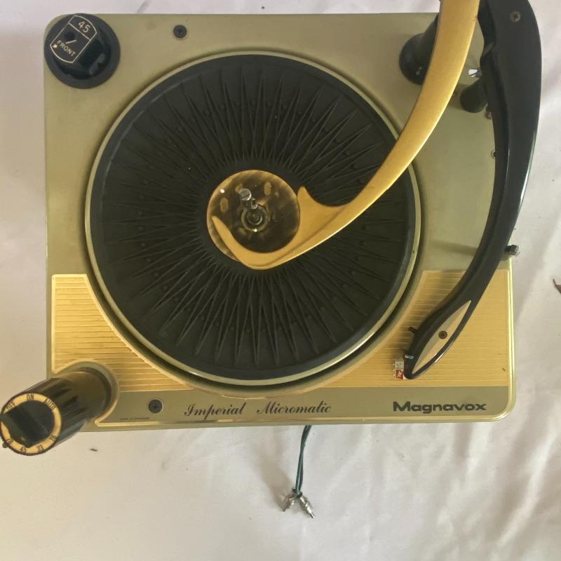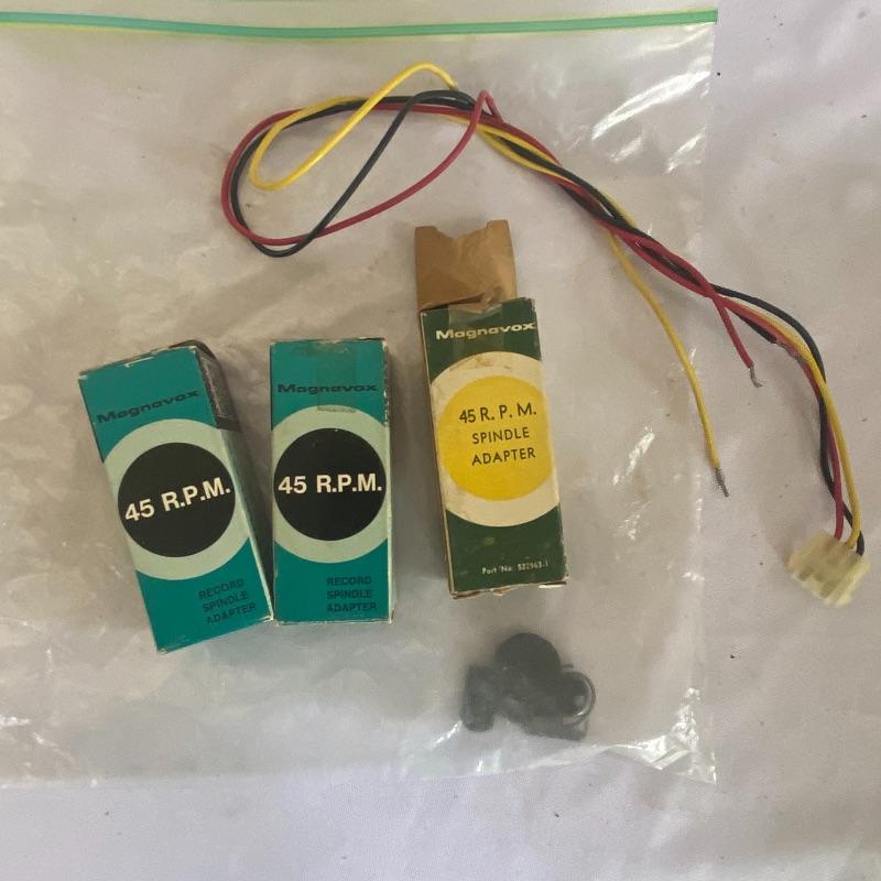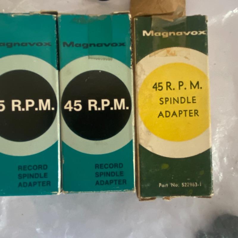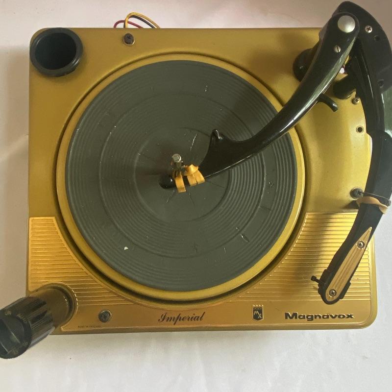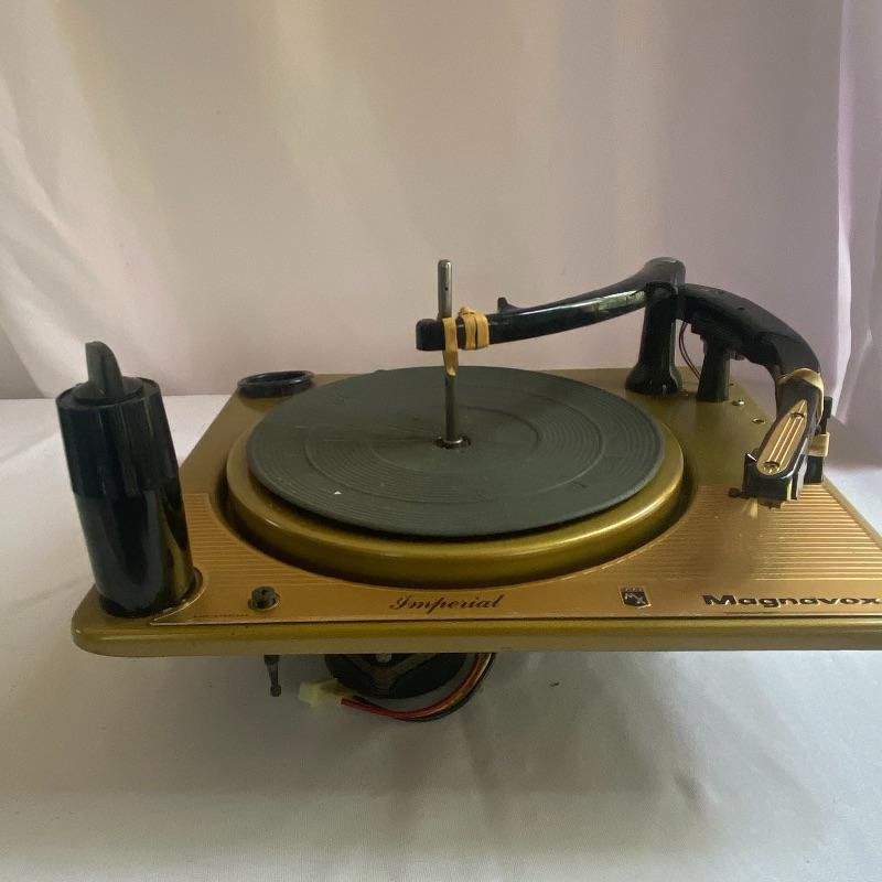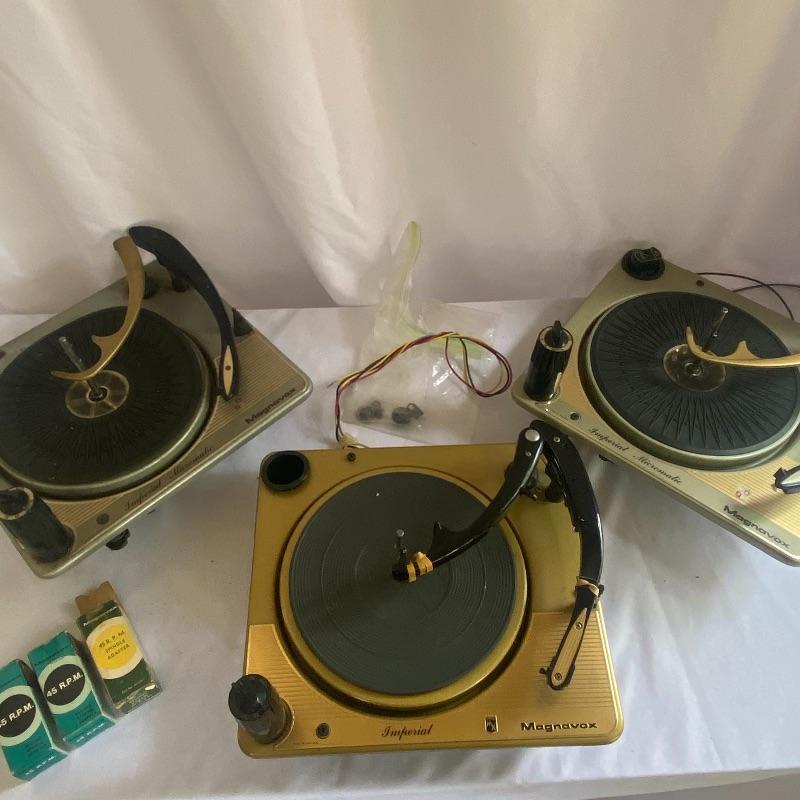 Lot includes three Imperial Micromatic Magnavox turntables. Hints of tan gray and gold color throughout the lot. Standalone turntables include three packaged spindles. Unable to be tested, cords included. Great lot for parts! See photos.