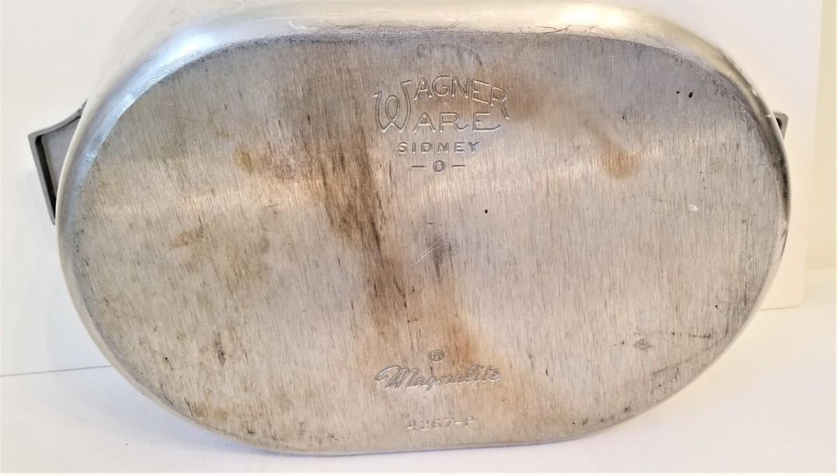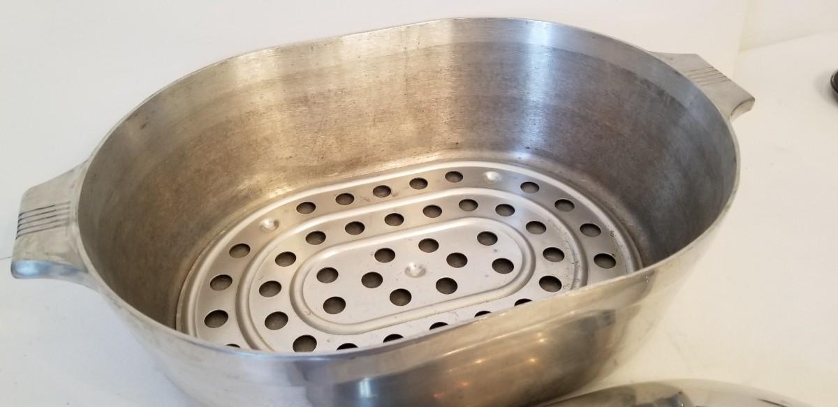Large Magnalite Roaster with the insert (hard to find). Good used condition. 10" tall, 19" long.