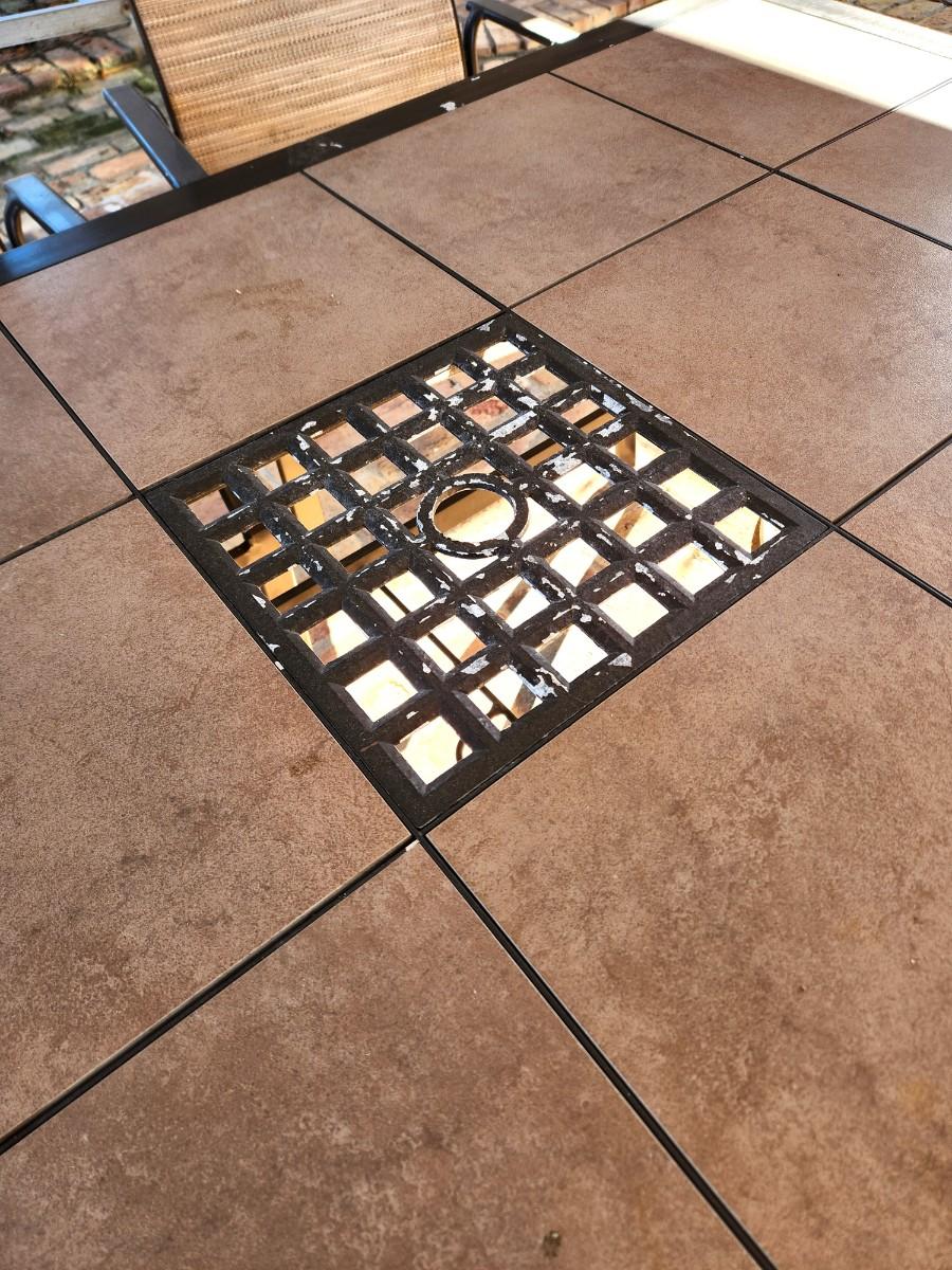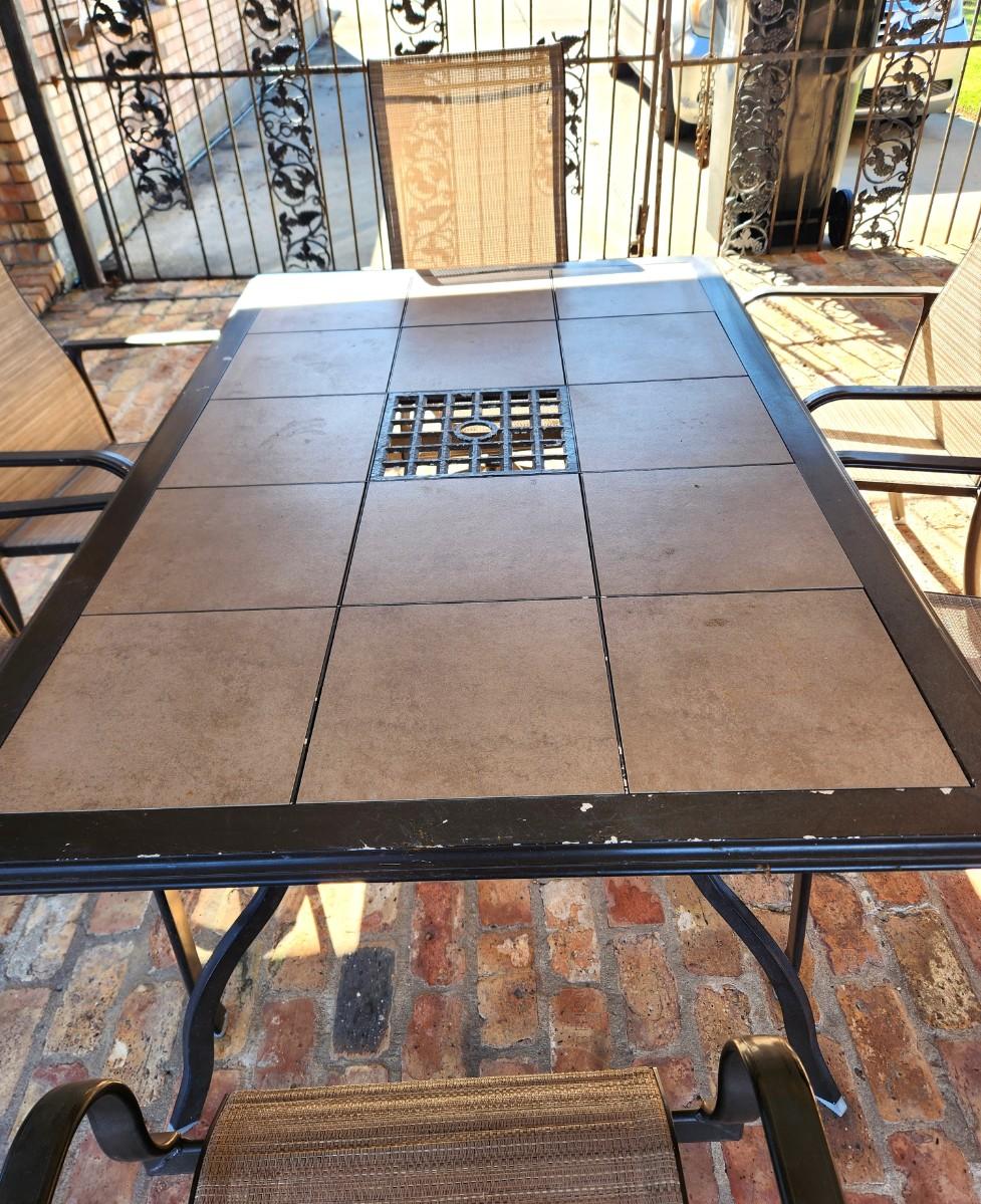 This set matches the Bistro set listed earlier - Martha Stewart Outdoor dining set - has a hole for an umbrella - some wear - aluminum frame. 41" across, about 65" long. Ceramic tile table top.