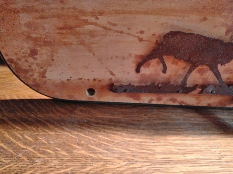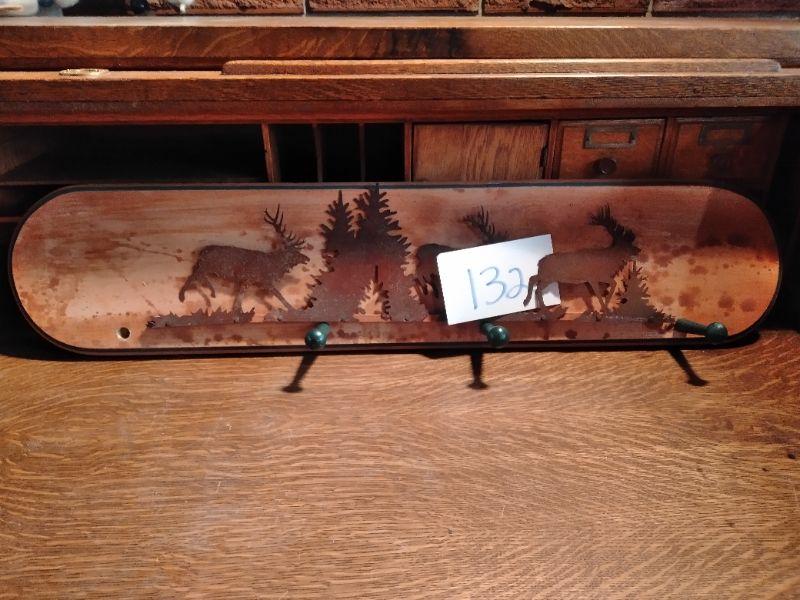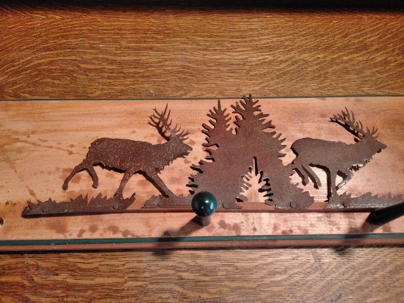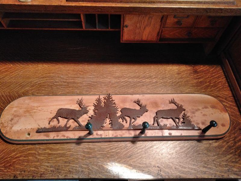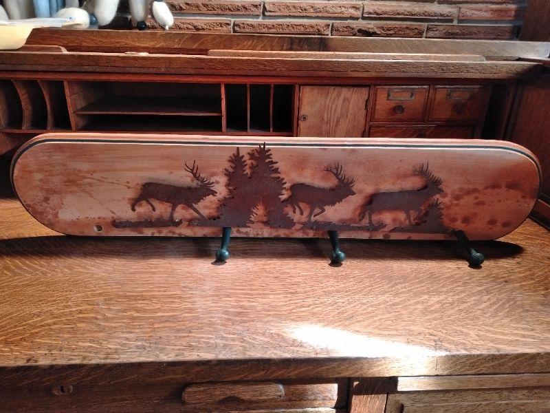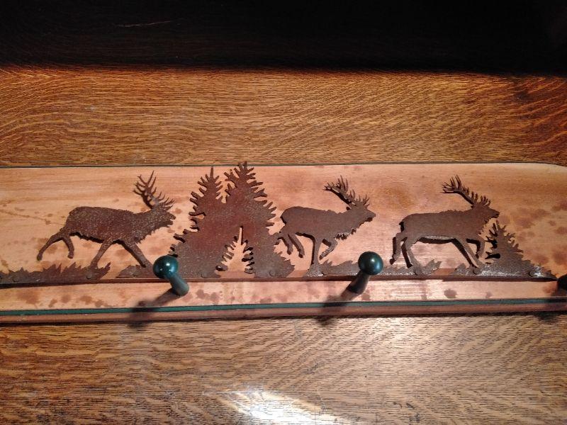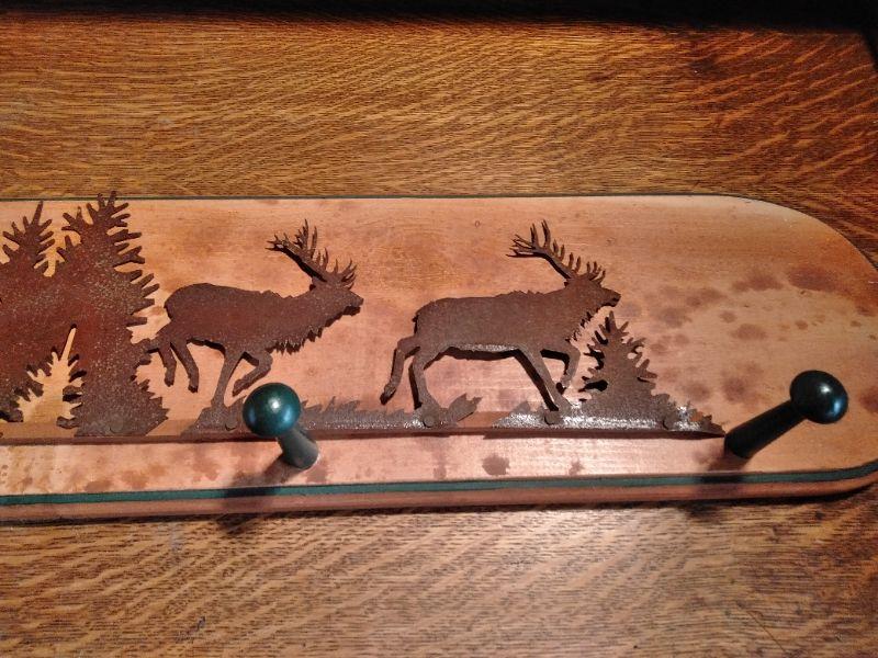 NORTH WOODS WILDLIFE ART BY LARRY SIMONSTIN ELK DECORATED HAT RACK, (MISSING ONE DOWEL)
