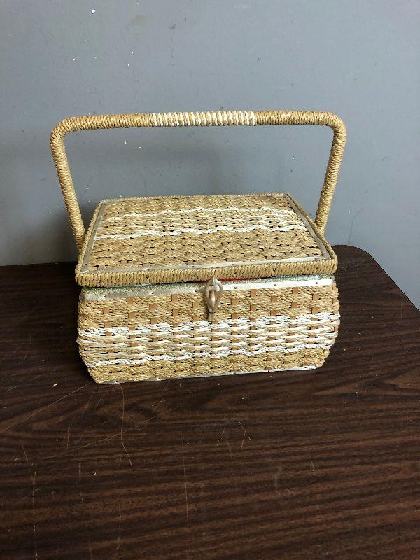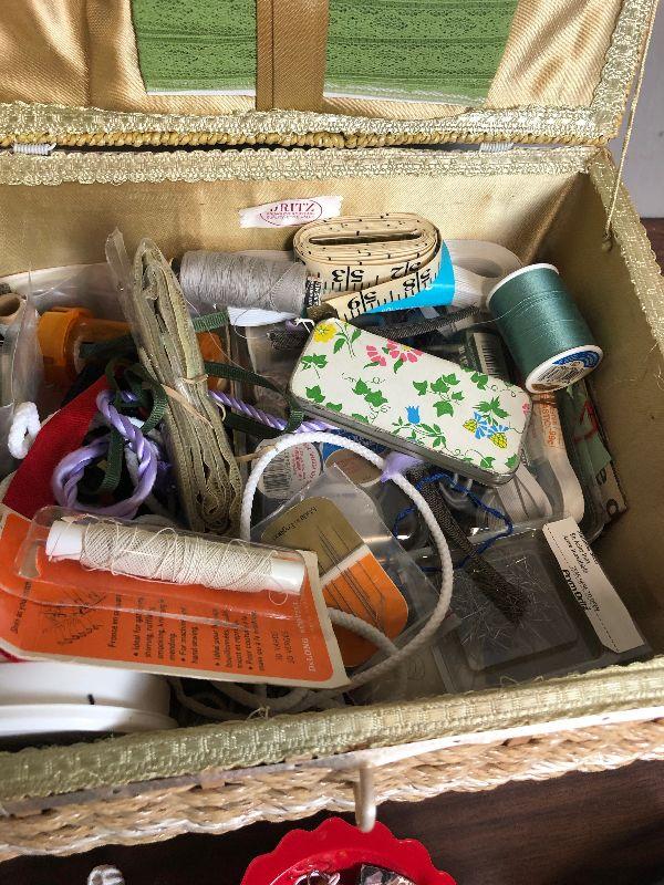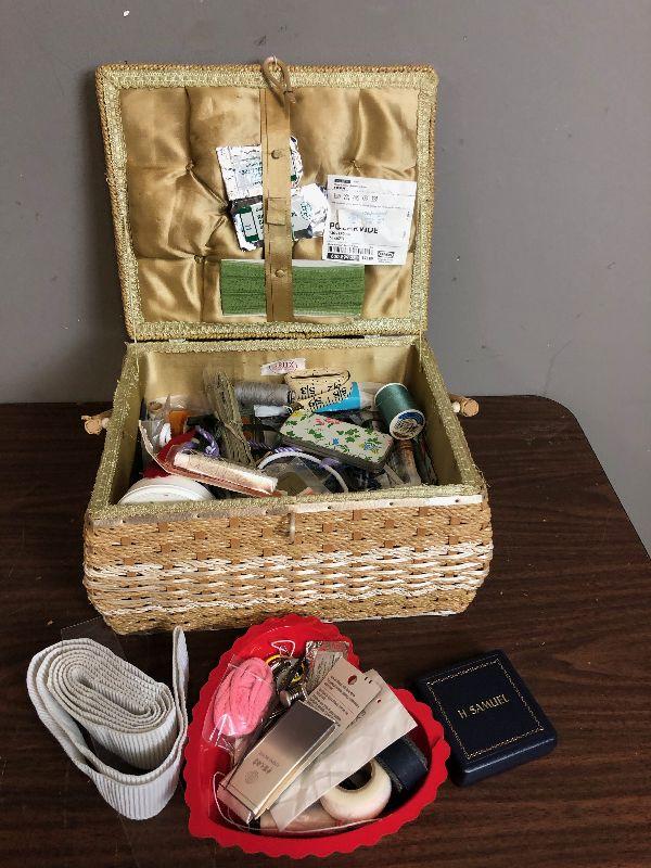 Good Condition; thread, needles, parts and pieces in beautiful Basket