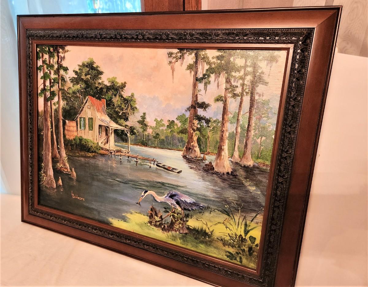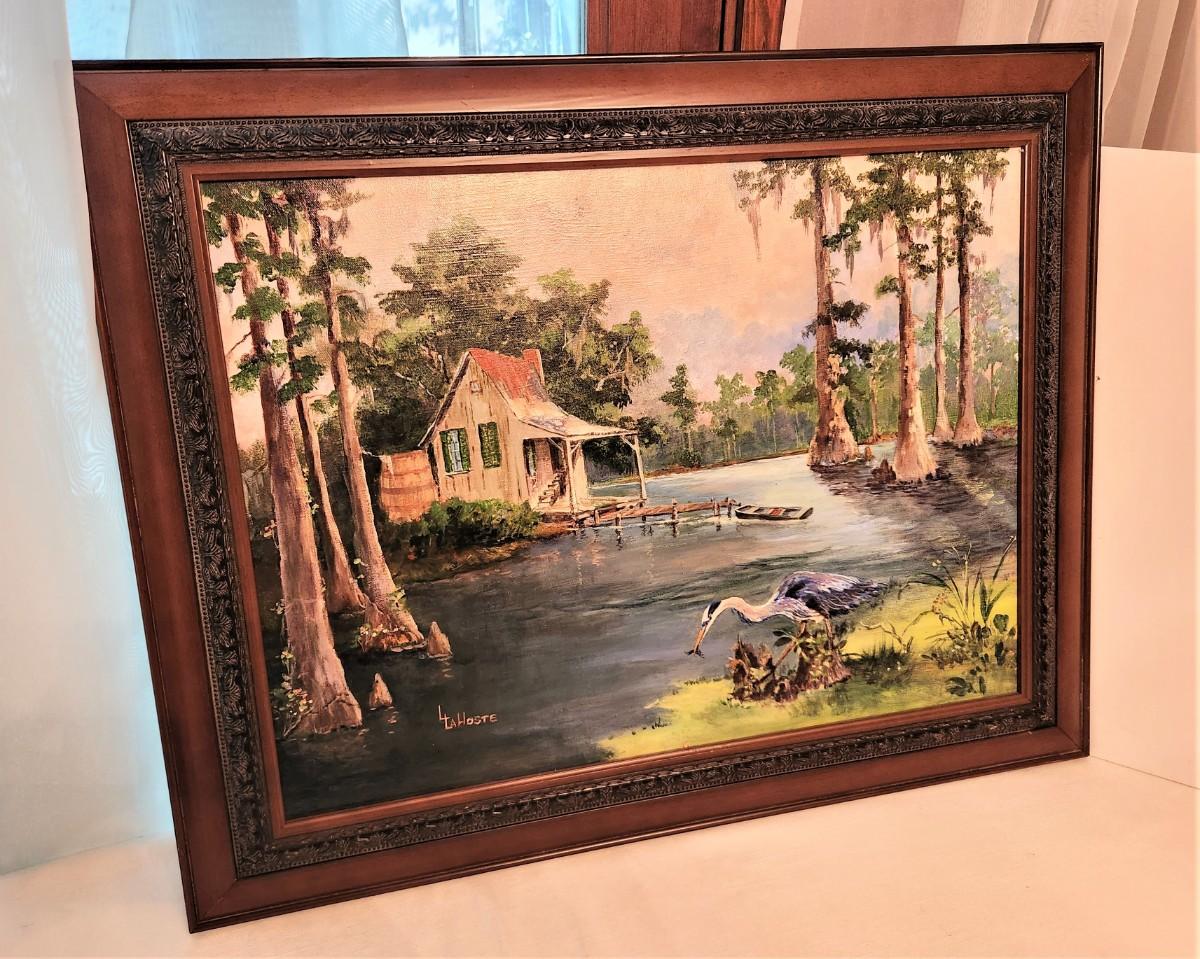 Acrylic on canvas - entitled "Caught Me a Perch" - signed. Classic, well executed bayou scene. Framed, 29.5" across, 23.5" tall. Good condition.