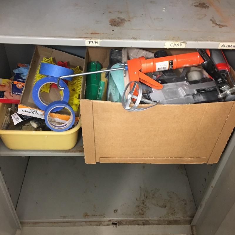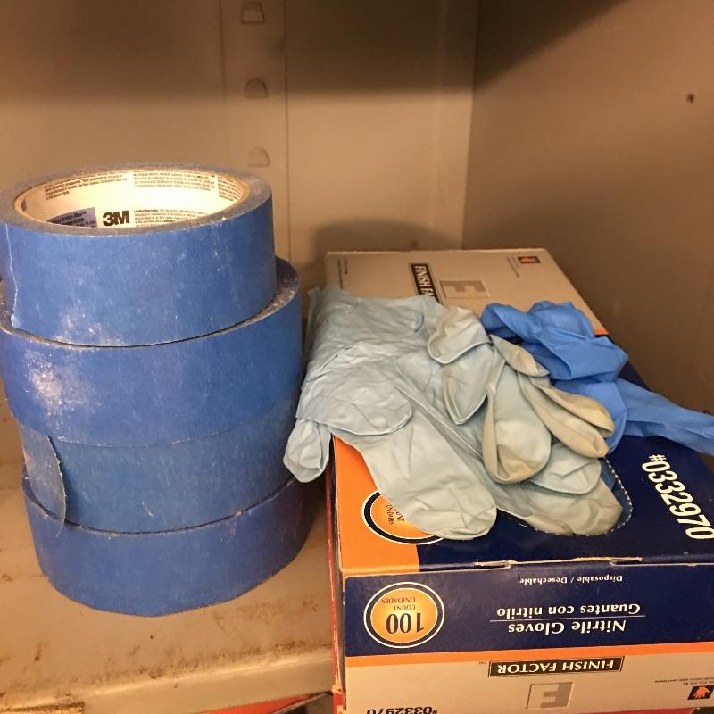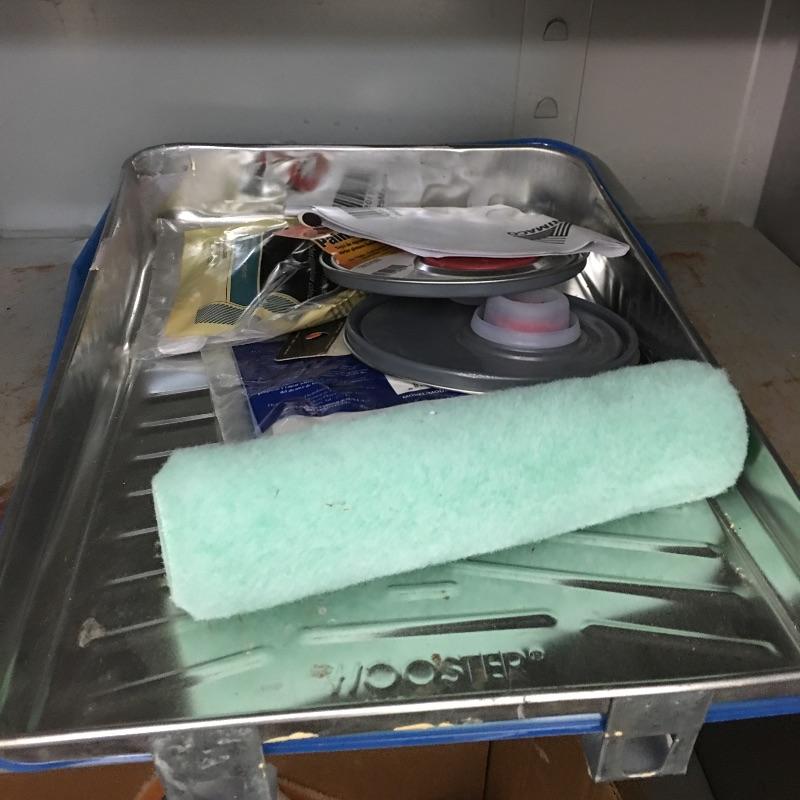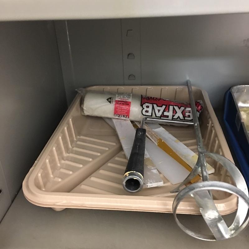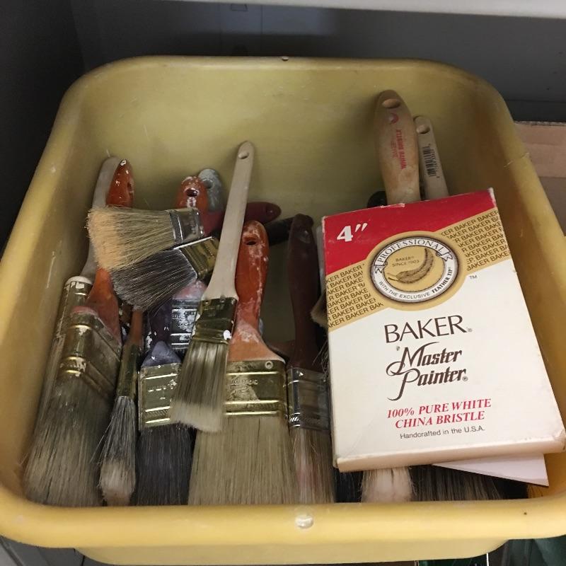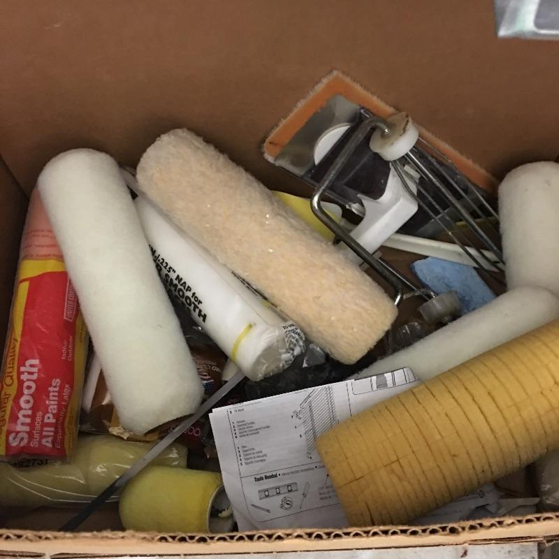 Large selection of painting essentials including scrapers, caulking guns, blue tape, gloves, paint mixer, 16’ extension pole, rollers, brushes and more.